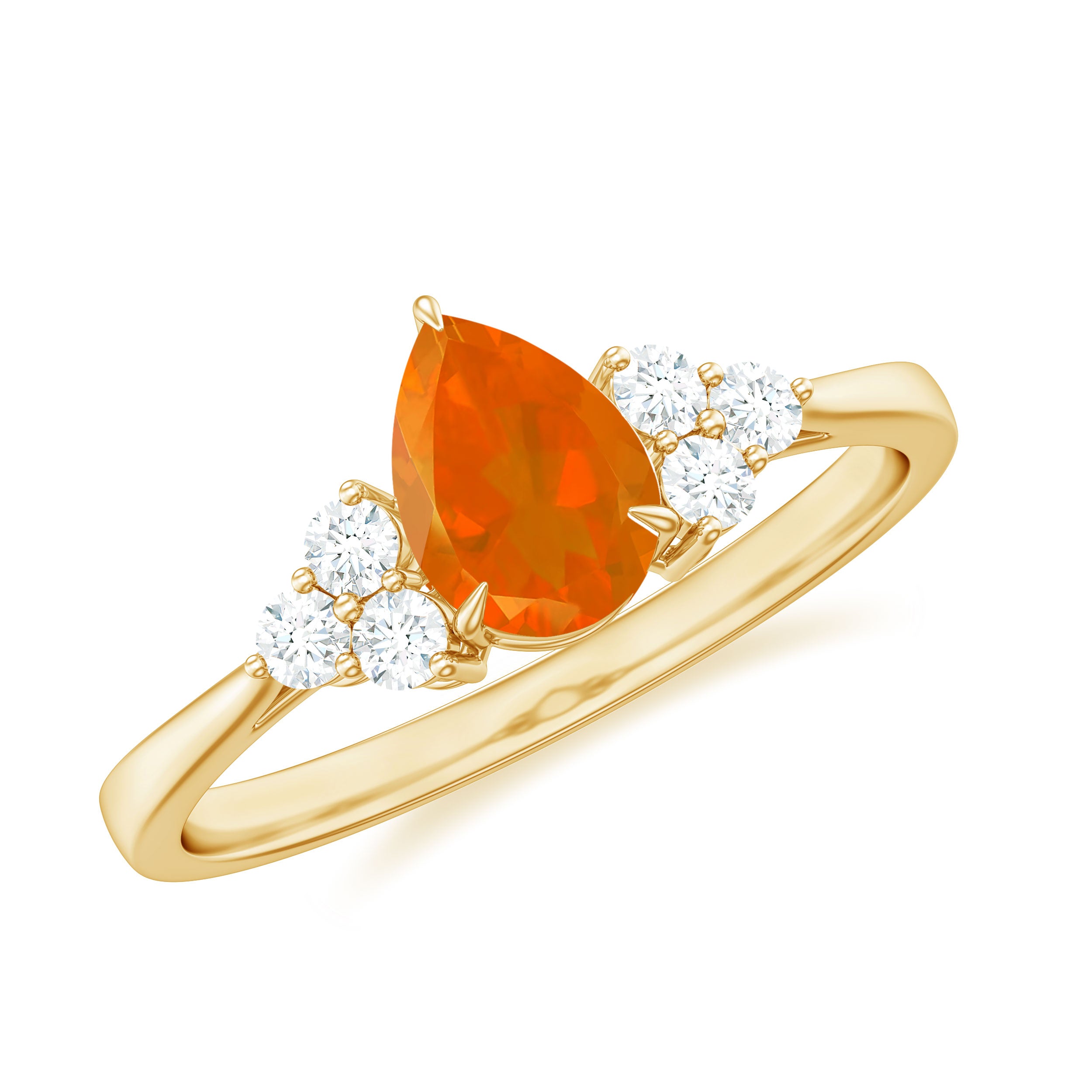 Shine elegantly with this stunning and glistening Teardrop Ring. The Pear Cut Fire Opal in Claw Setting with Diamond as Trio on Solitaire Ring.