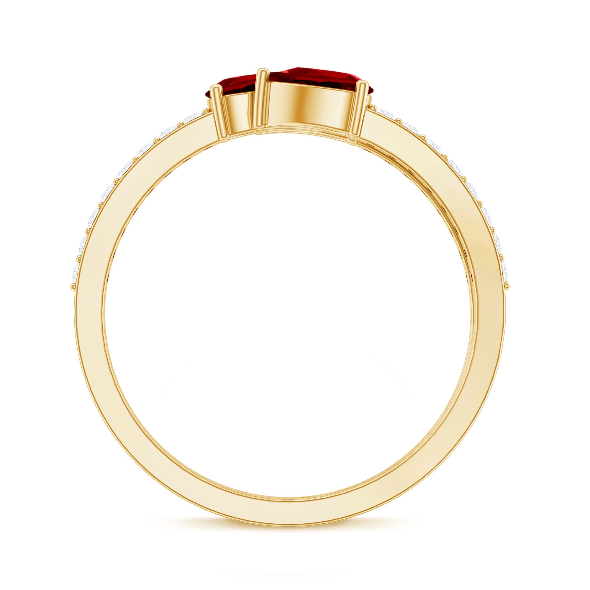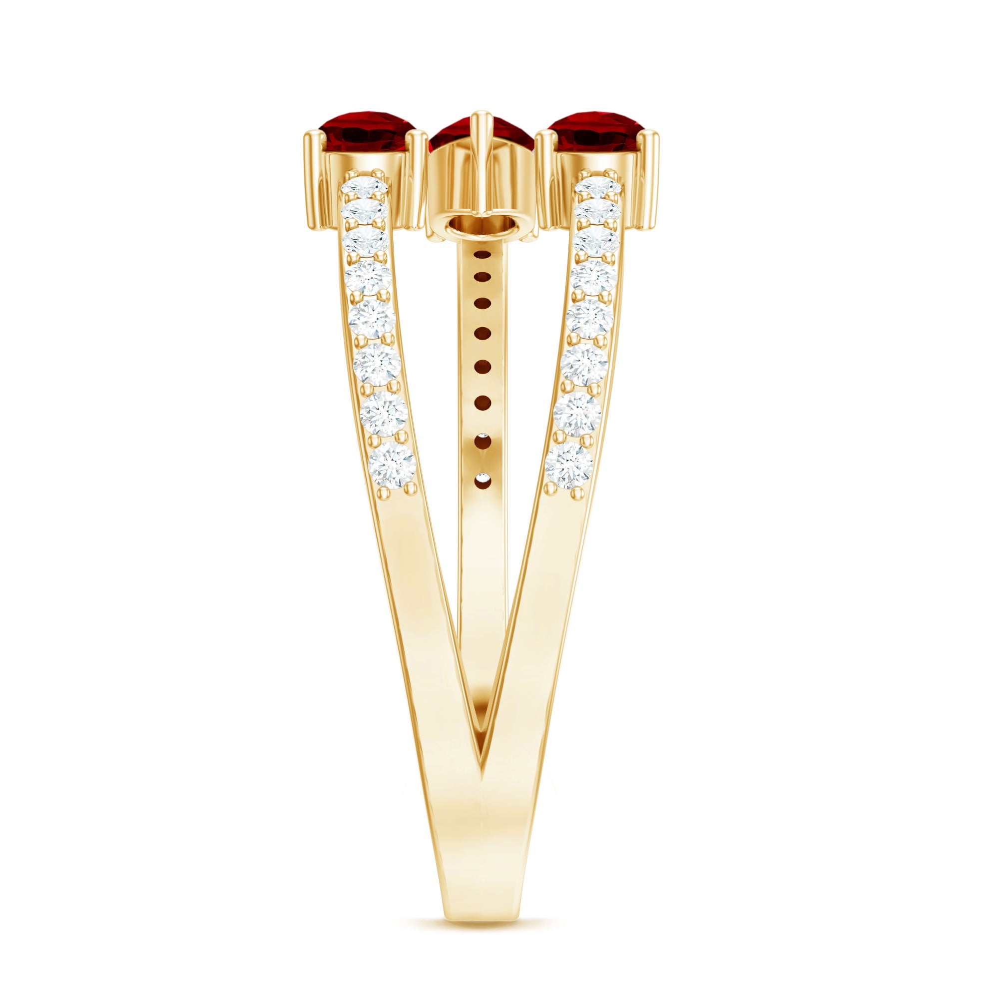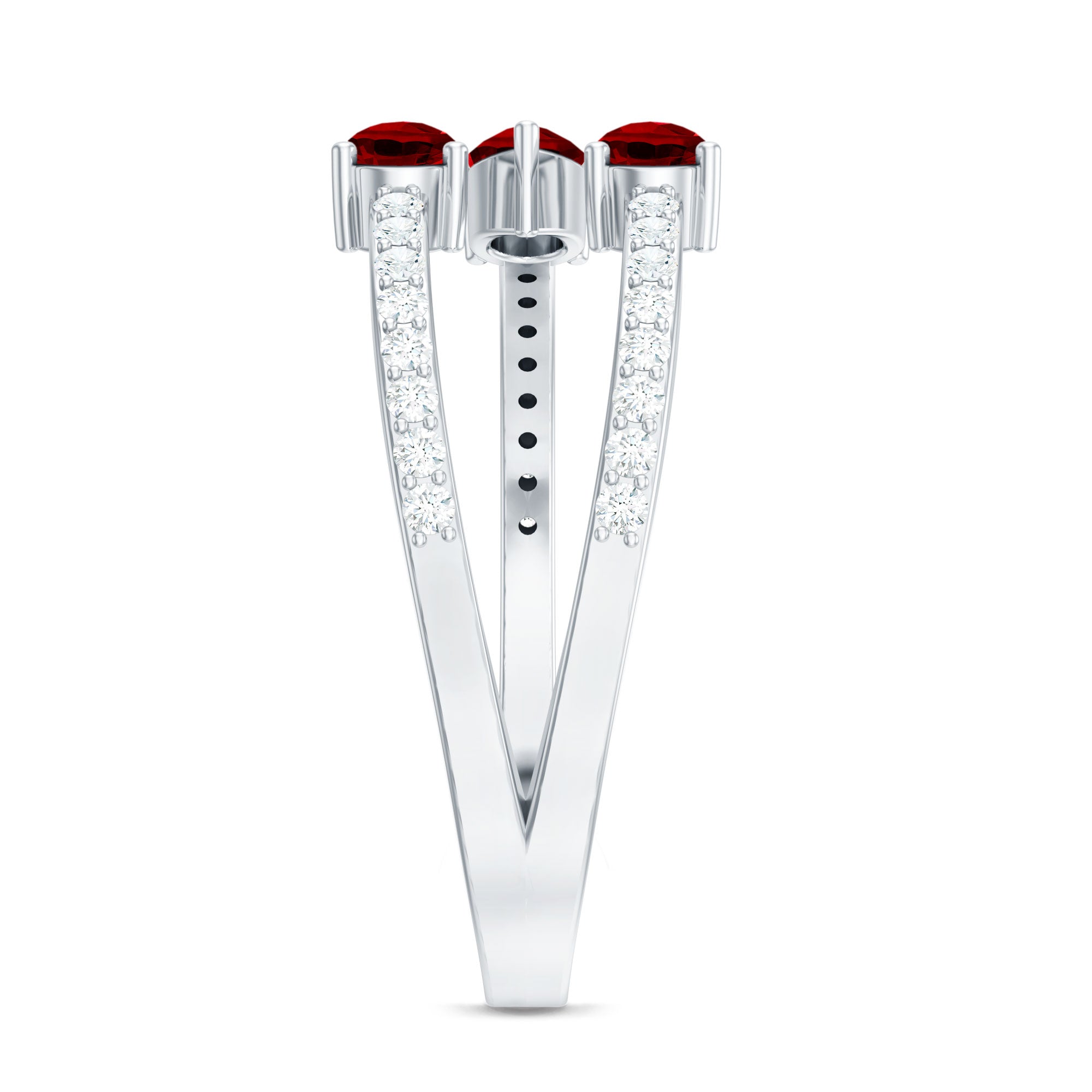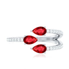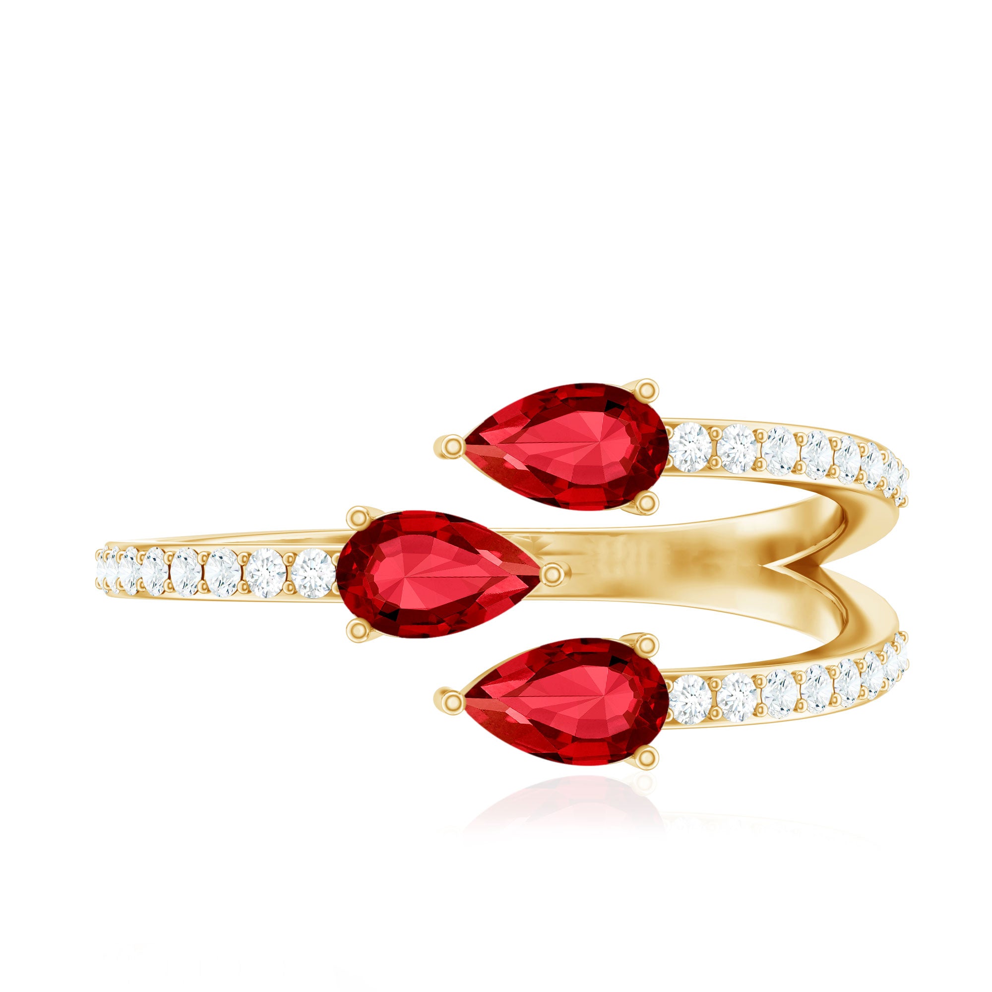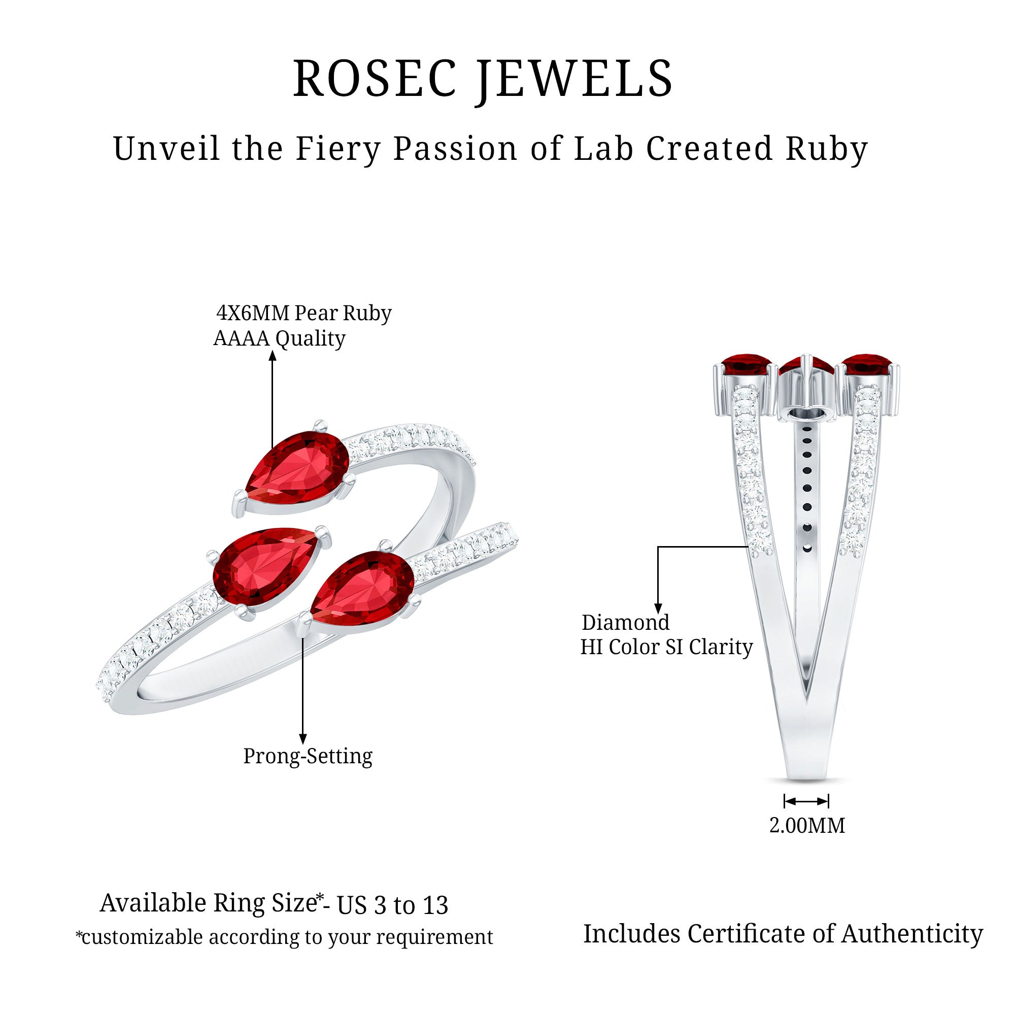 Turn heads without even trying with this bold and beautiful Lab Created Ruby Cocktail Ring. Designed to break away from traditional styles, this unique piece features three 4X6 MM pear shaped lab grown rubies placed horizontally in east west style. While shimmering diamond stones studded along the wrap-style band add the perfect sparkle to elevate the entire look. What makes this Ruby Three Stone Ring even more special is the wrap design that flows smoothly around your finger. It is not just stylish, it also represents connection, unity, and the beauty of a bond that keeps growing stronger. Whether you are heading to a fancy dinner, a cocktail event, or just want a standout piece in your everyday jewelry, this Ruby and Diamond Ring makes sure you shine with confidence. Crafted with care and high quality materials, it is made to last just like the meaning behind it. The combination of AAAA quality lab created rubies and sparkling HI-SI quality diamonds makes it a real showstopper. This Wrap Ring for Women is a great gift if you want to treat yourself or someone special, something that feels thoughtful, stylish, and full of personality. To make the experience even better, your Lab Created Ruby Ring comes tucked inside a premium signature jewelry box, making it instantly ready for gifting.