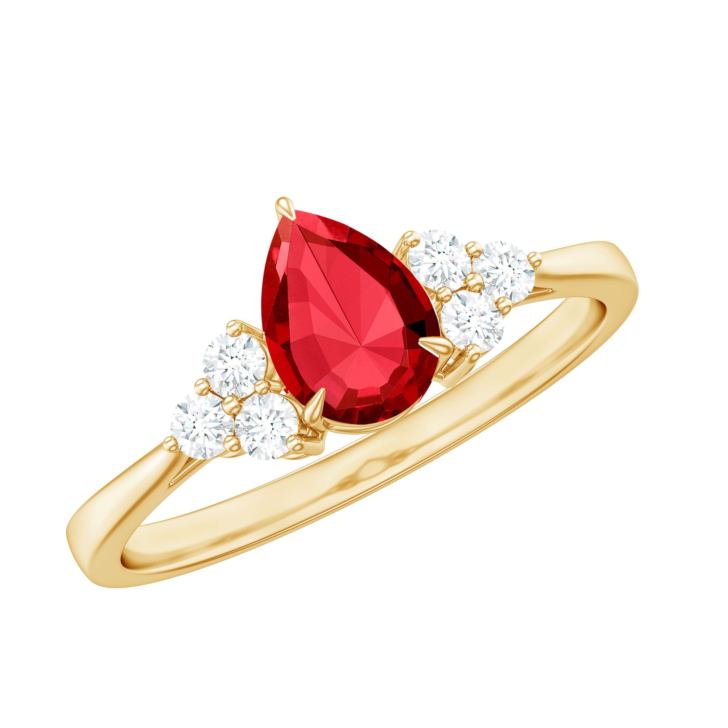 Make a statement with this Lab Grown Ruby Engagement Ring, designed for those who value both beauty and sustainability. At its center sits a stunning 5X7 MM pear shaped lab grown ruby, set in claw setting for a secure look. The centerpiece is beautifully enhanced by a trio of sparkling round cut diamonds, carefully set to highlight the ruby’s brilliance and create a striking contrast. The diamonds add sparkle and elegance, complementing the vibrant hue of the AAAA quality ruby while maintaining a refined and timeless look. This Ruby and Diamond Ring is the perfect combination of bold design and graceful elegance. Its pear shaped ruby makes it stand out from traditional solitaire styles, while the trio of diamonds adds a modern and glamorous touch. Crafted with lab grown ruby, the Teardrop Engagement Ring is an ethical and environmentally friendly choice, allowing you to celebrate love in a conscious and meaningful way. Ideal for a proposal or as a special gift, this Lab Created Ruby Ring symbolizes not just commitment, but the beauty of shared moments and lasting memories. Its striking design, rich color, and sparkling accents ensure it will be admired for years to come.
