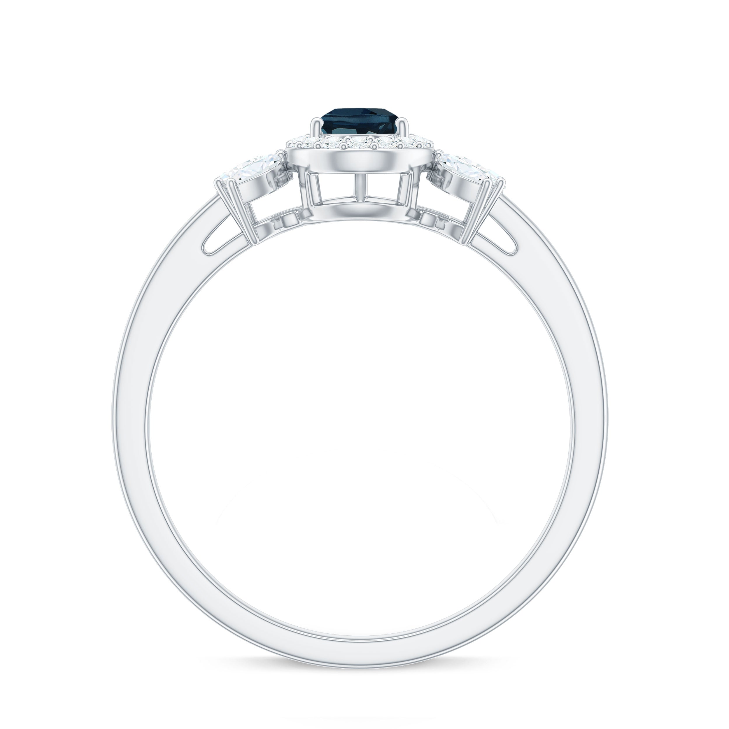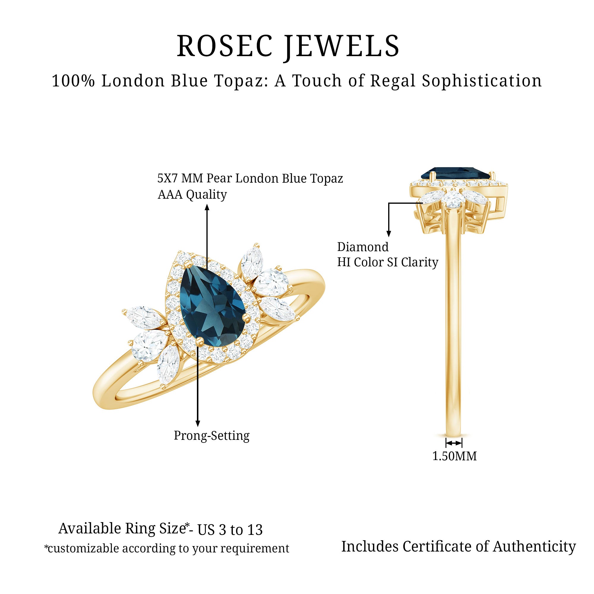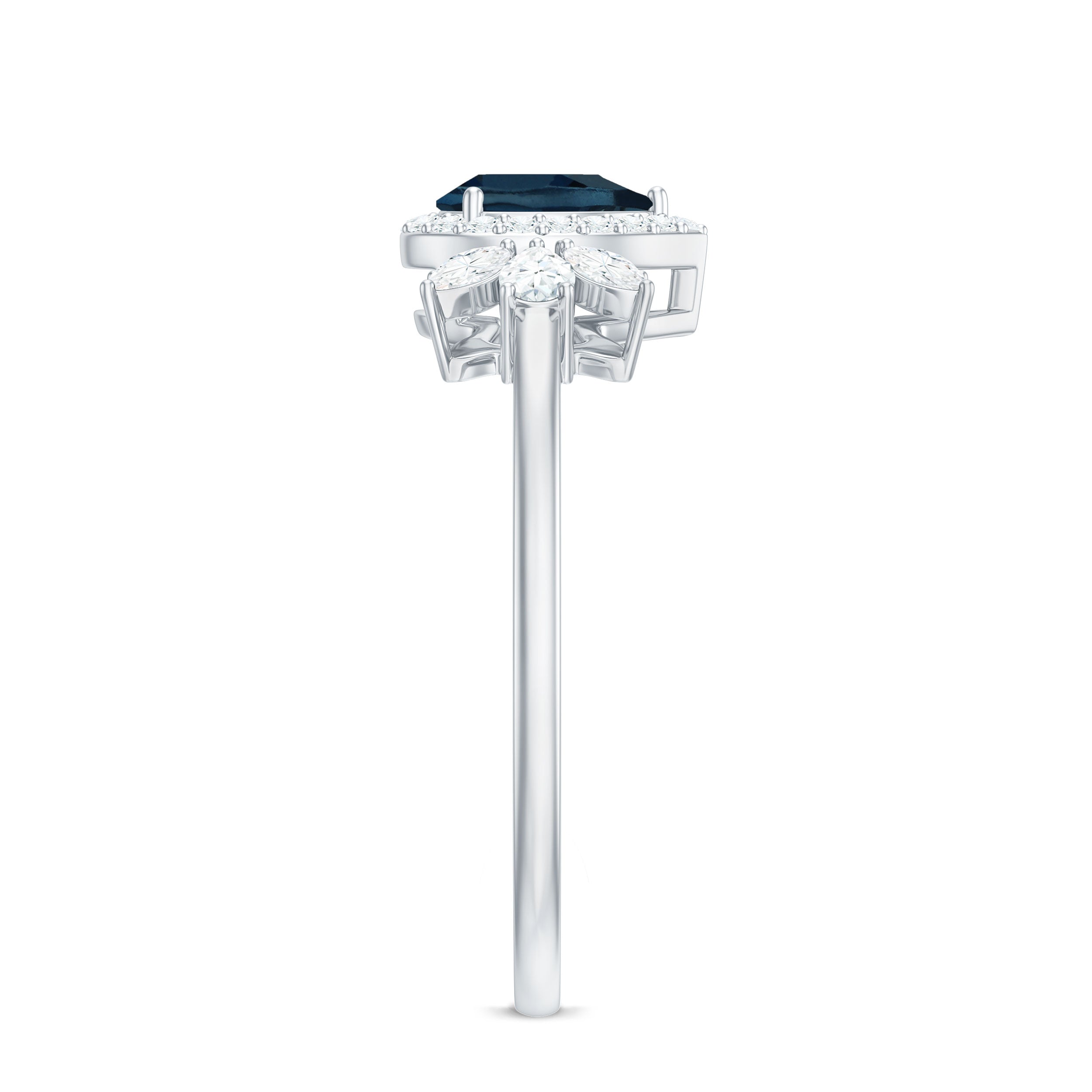 Make a bold impression with this exquisite London Blue Topaz Engagement Ring, ideal for individuals who appreciate elegance and style. At the center of the Teardrop Engagement Ring lies a stunning 5x7 MM pear-shaped london blue topaz, securely held in a 3-prong setting. Encircling the blue topaz is a dazzling diamond halo, which enhances its brilliance and draws attention to the vibrant central stone. The centerpiece is further accentuated by a trio of pear and marquise cut diamonds, meticulously arranged to emphasize the rich blue hue of the topaz and create a striking contrast. The blend of the AAA quality blue topaz and the HI-SI quality diamonds imparts a modern yet timeless charm to the Cocktail Ring, distinguishing it from conventional designs. Its sophisticated design makes it an excellent choice for a proposal, engagement, or special gift, symbolizing a meaningful commitment and shared experiences. This Blue Topaz and Diamond Engagement Ring represents a stunning option for engagements, December birthdays, or any significant event where you wish to express love and commitment. Designed for comfort during daily wear, this Real Blue Topaz Ring combines vibrant color with subtle sparkle, ensuring it is a remarkable addition to any jewelry collection.