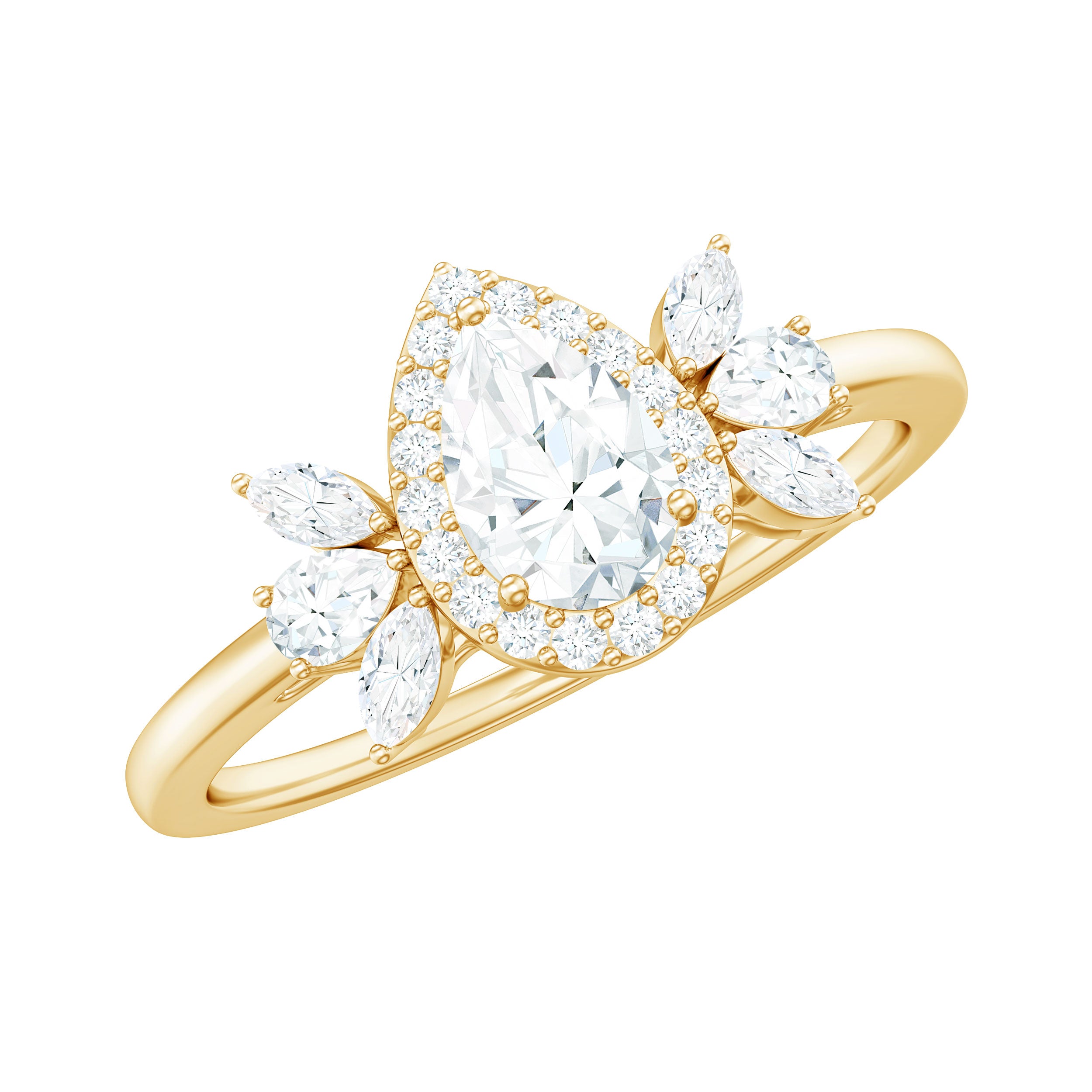 Pear Shaped Moissanite Halo Engagement Ring with Trio