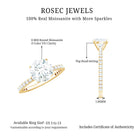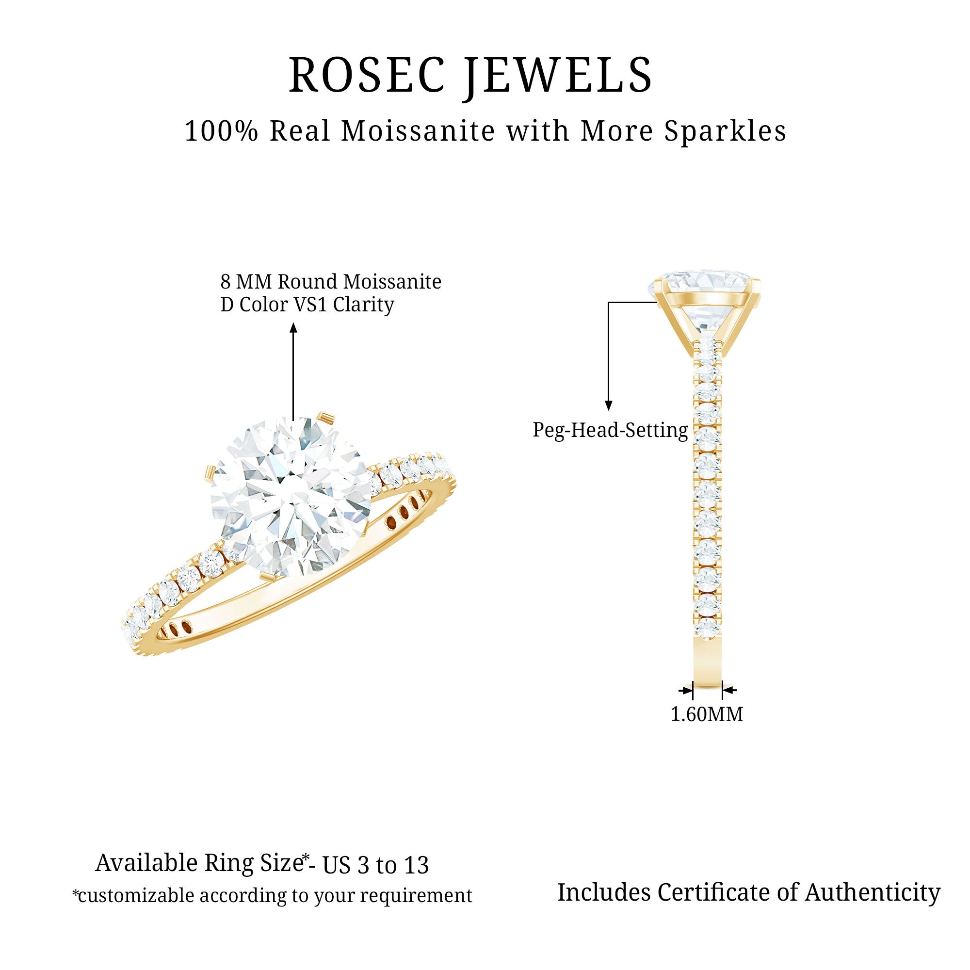 Watch her enchantment unfold as you offer her this captivating Solitaire Engagement Ring. Featuring an 8 MM Round Cut Moissanite set in Peg Head setting, along with flanking Side Stones in a French Pave Setting adding an extra layer of shine to the ring. This Engagement Ring is perfect for initiating a new phase of life with that special one. This shine of D-VS1 Quality Moissanite will make your lady love extra special on the big day. This 2 Carat Moissanite Ring is meticulously crafted in various metal options, embodying a lavish selection for your beloved. This Round Moissanite Engagement Ring will be delivered to you in premium-quality packaging in a signature jewelry box for storage. Your purchase will include the certificate of gemstone authentication to ensure the quality of the ring.