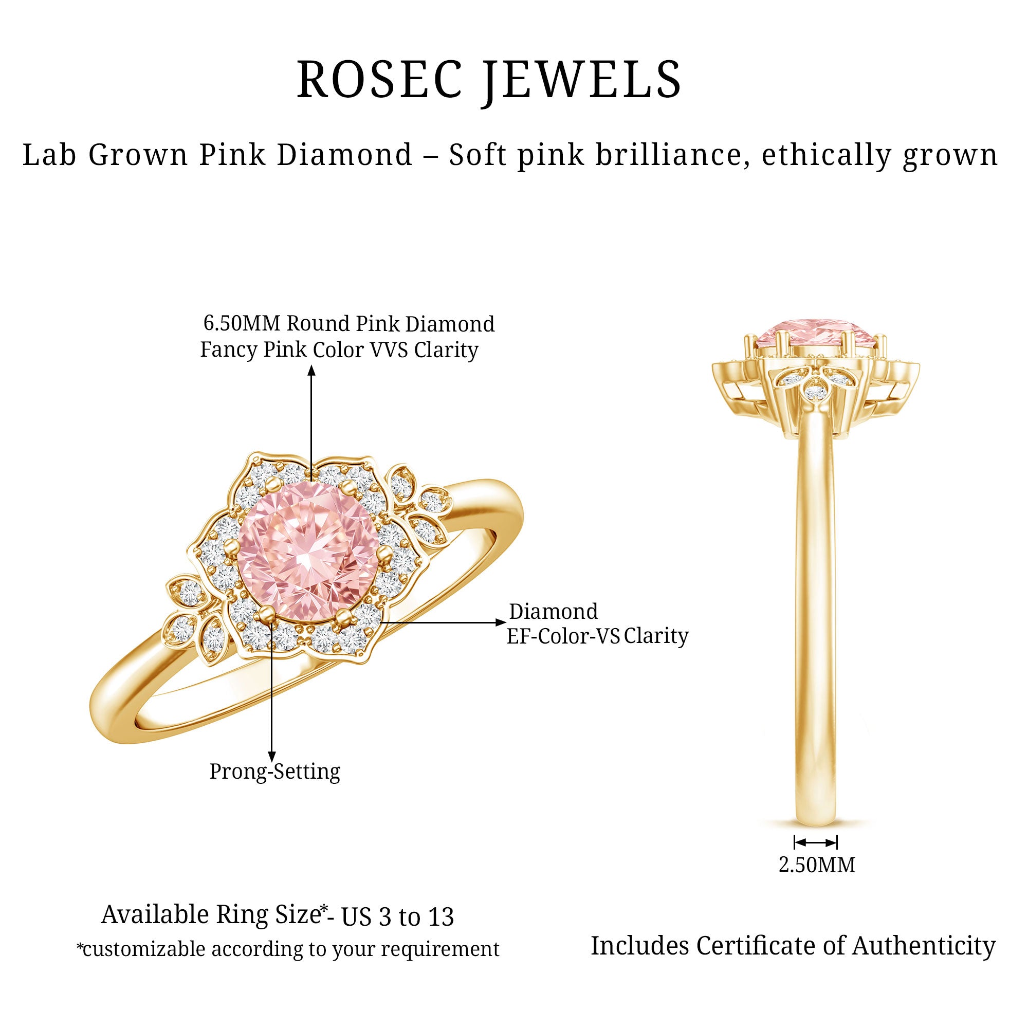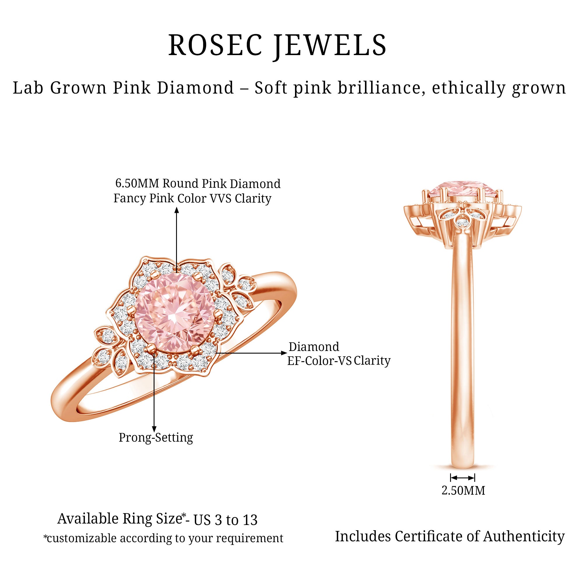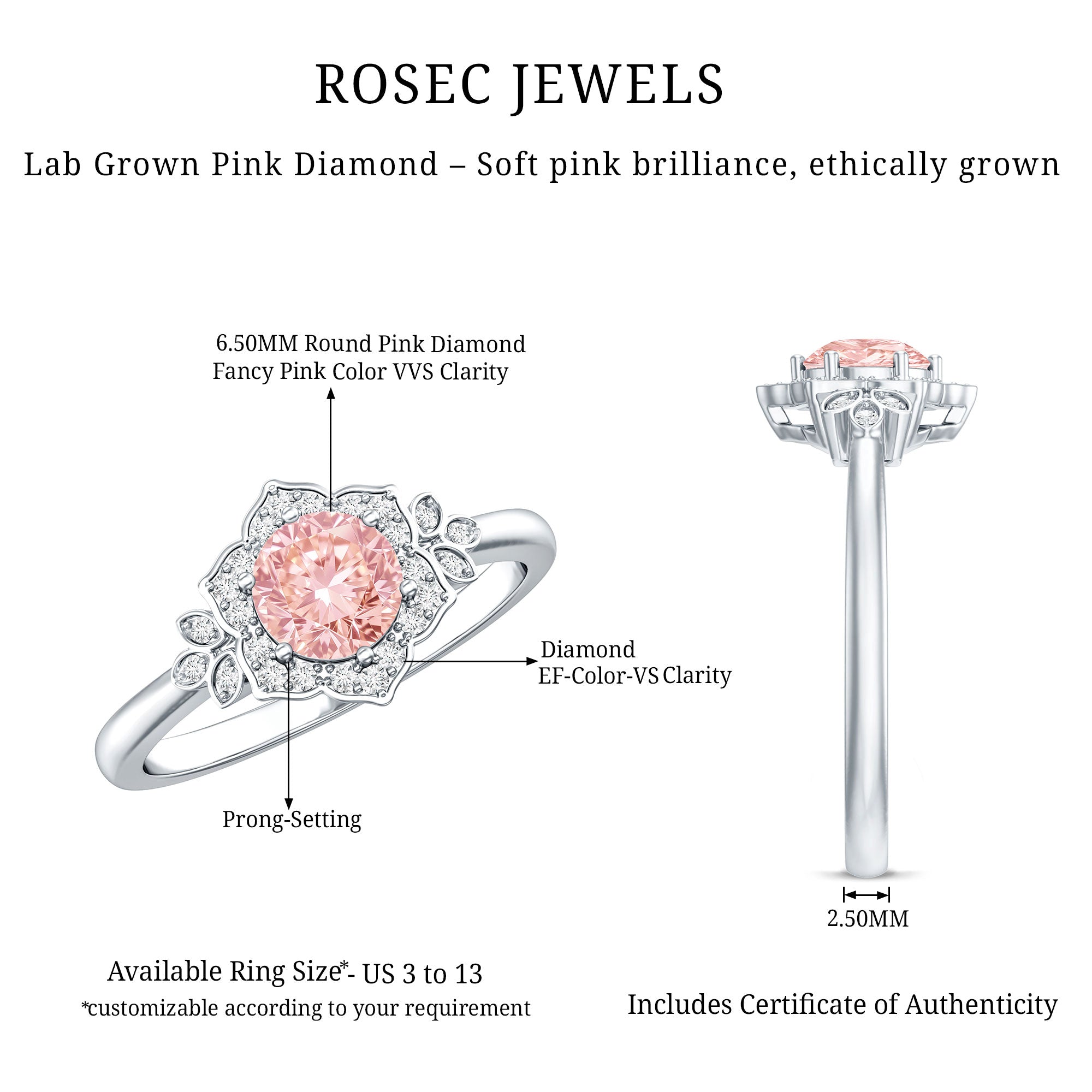 Feminine, bold, and dramatic, this Lab Created Pink Diamond Engagement Ring will elevate your wedding attire. As a vibrant symbol of love for nature, this Flower Ring is regarded as a classic piece, adding a playful element and undeniable allure that plays a vital role in flower power aesthetics. Crafted from high-quality metal, this Flower Engagement Ring showcases a nature-inspired theme that makes a floral fashion statement. It is meticulously designed with a 6.50 MM round cut lab grown pink diamond set in prongs, surrounded by a round cut lab-grown diamond halo that resembles flower petals, capturing the essence of natures beauty and conveying a message of timeless elegance. The shoulders feature metal petals adorned with lab-grown white diamonds for added brilliance. The intricate details, combined with a seamless style, make this Statement Ring an ideal choice, encapsulating the enchanting feelings associated with each bloom while celebrating natural vibrancy. The VVS quality pink diamond and EF Color VS Clarity lab-grown diamonds offer a unique variety of styles to enhance your appearance.