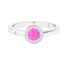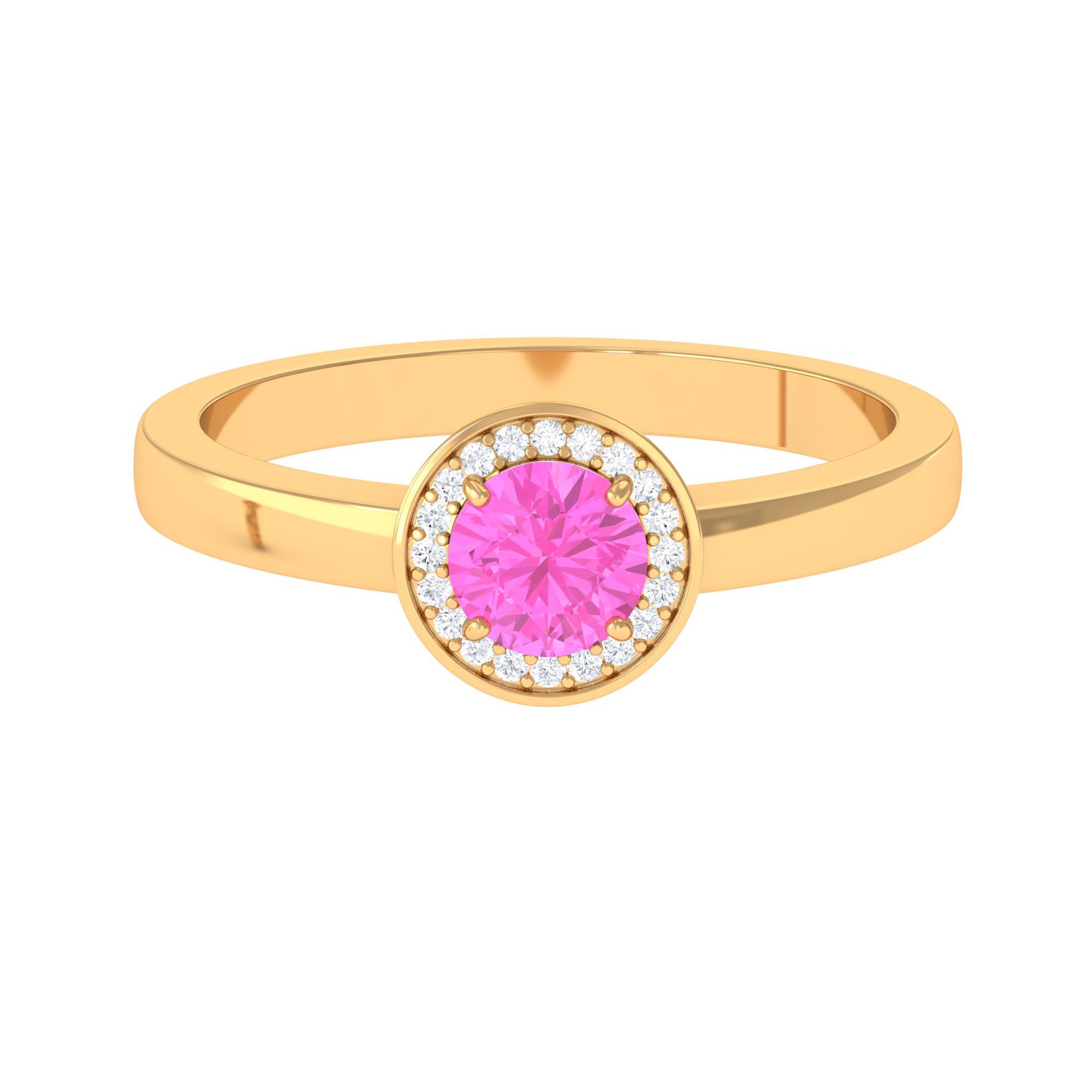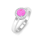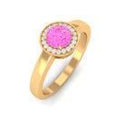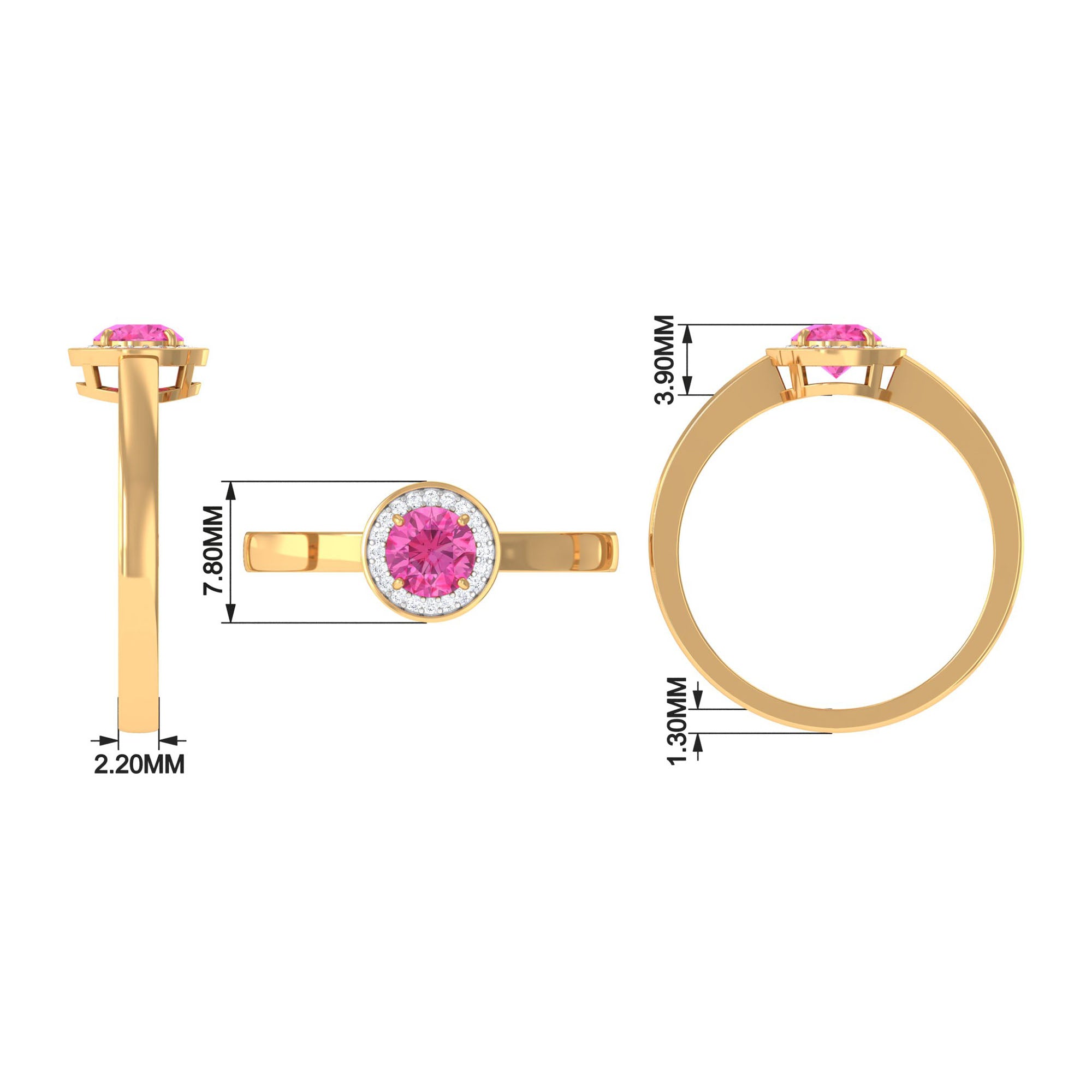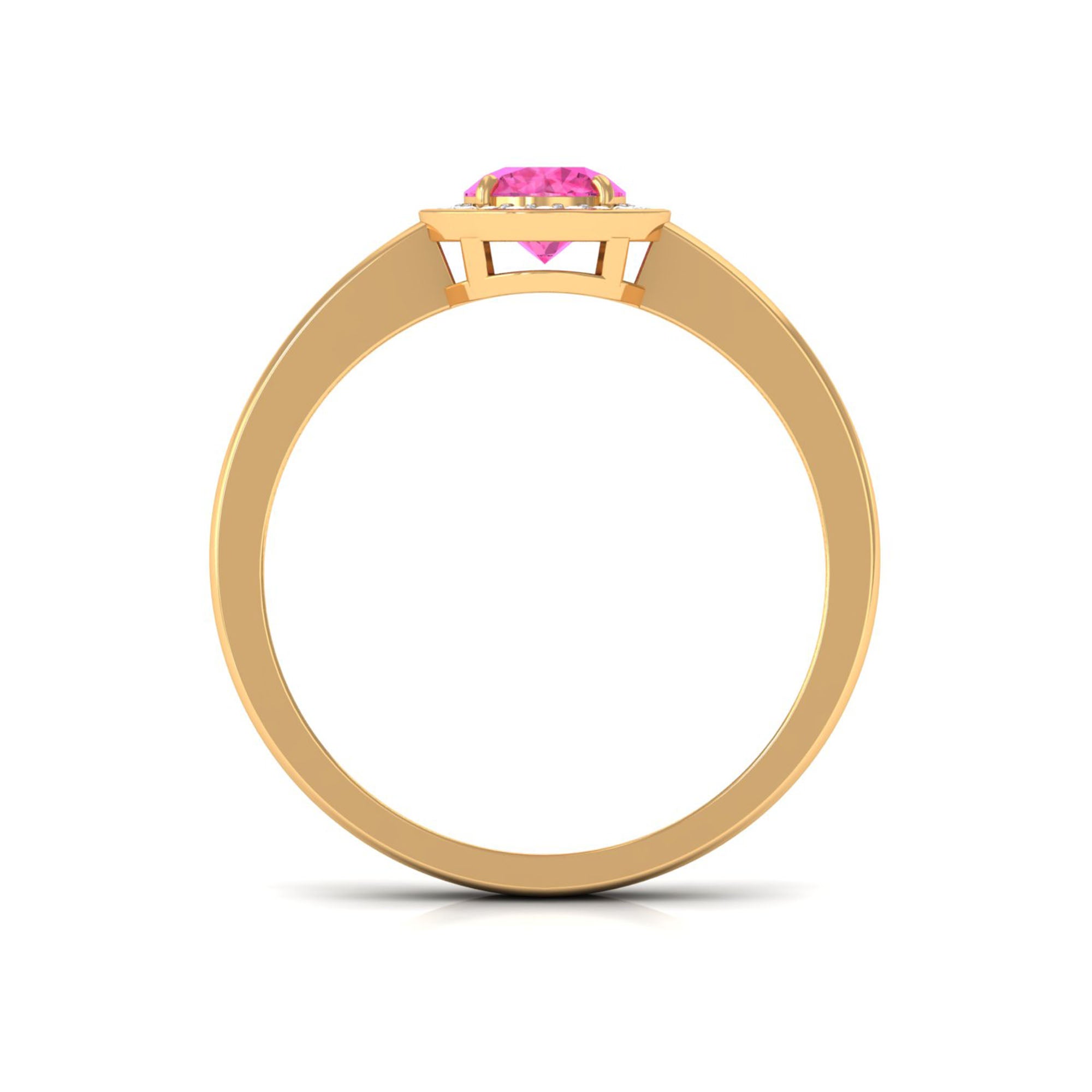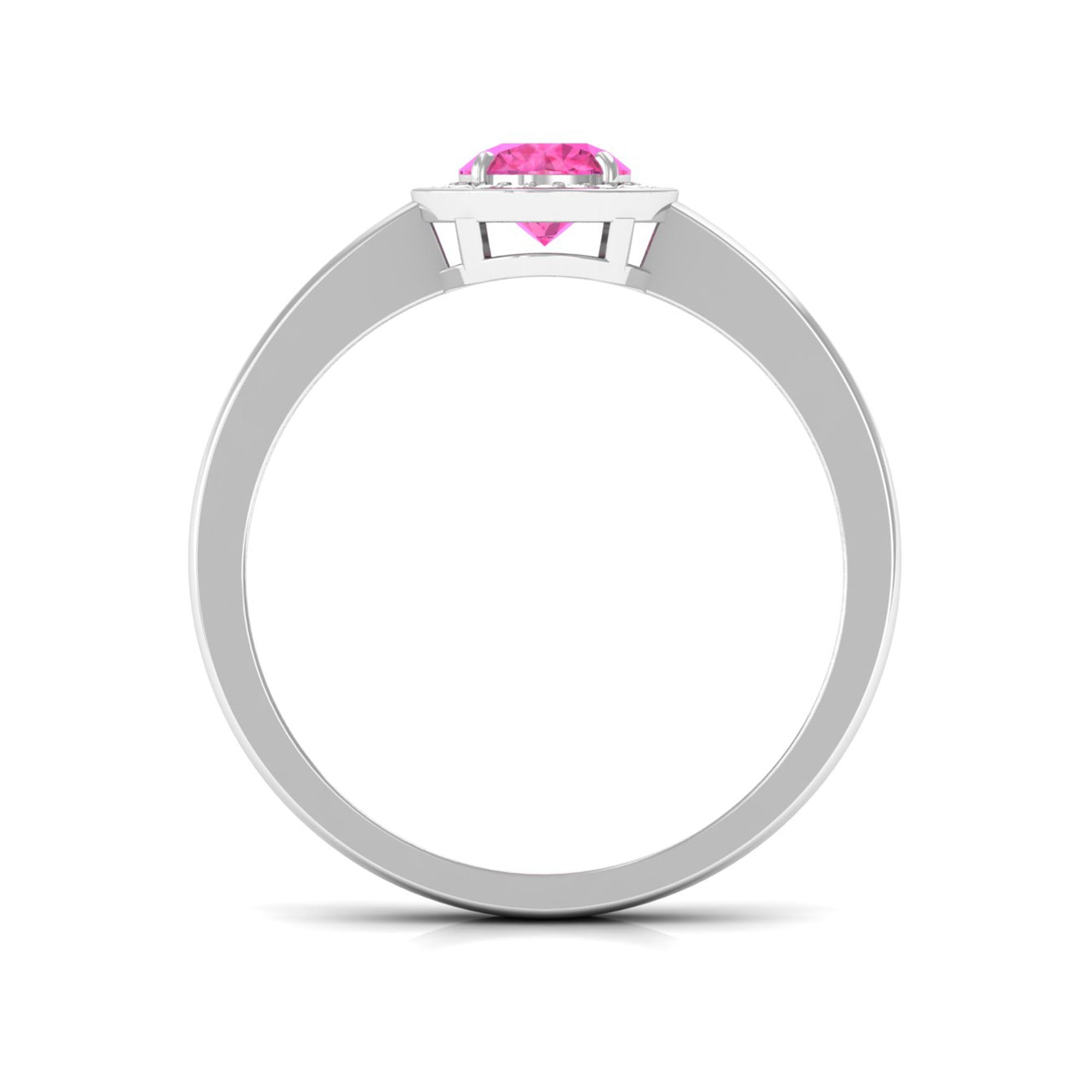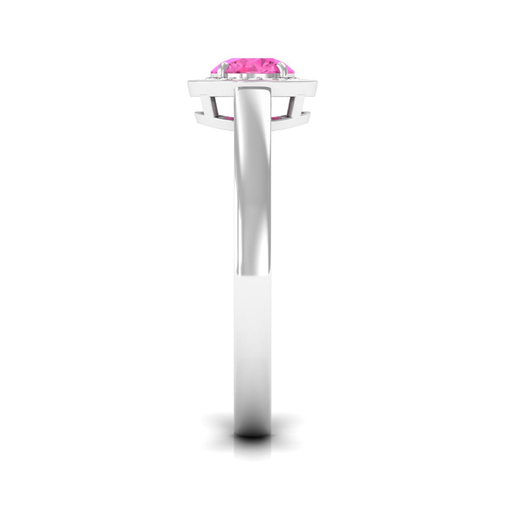 This exquisite engagement ring features a round pink sapphire as its captivating centerpiece, exuding elegance and romance. The vibrant pink gemstone is surrounded by a sparkling halo of dazzling diamonds, amplifying its beauty. Crafted with precision and attention to detail, this ring is a symbol of everlasting love and devotion.
