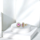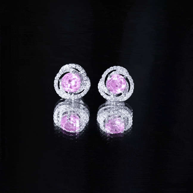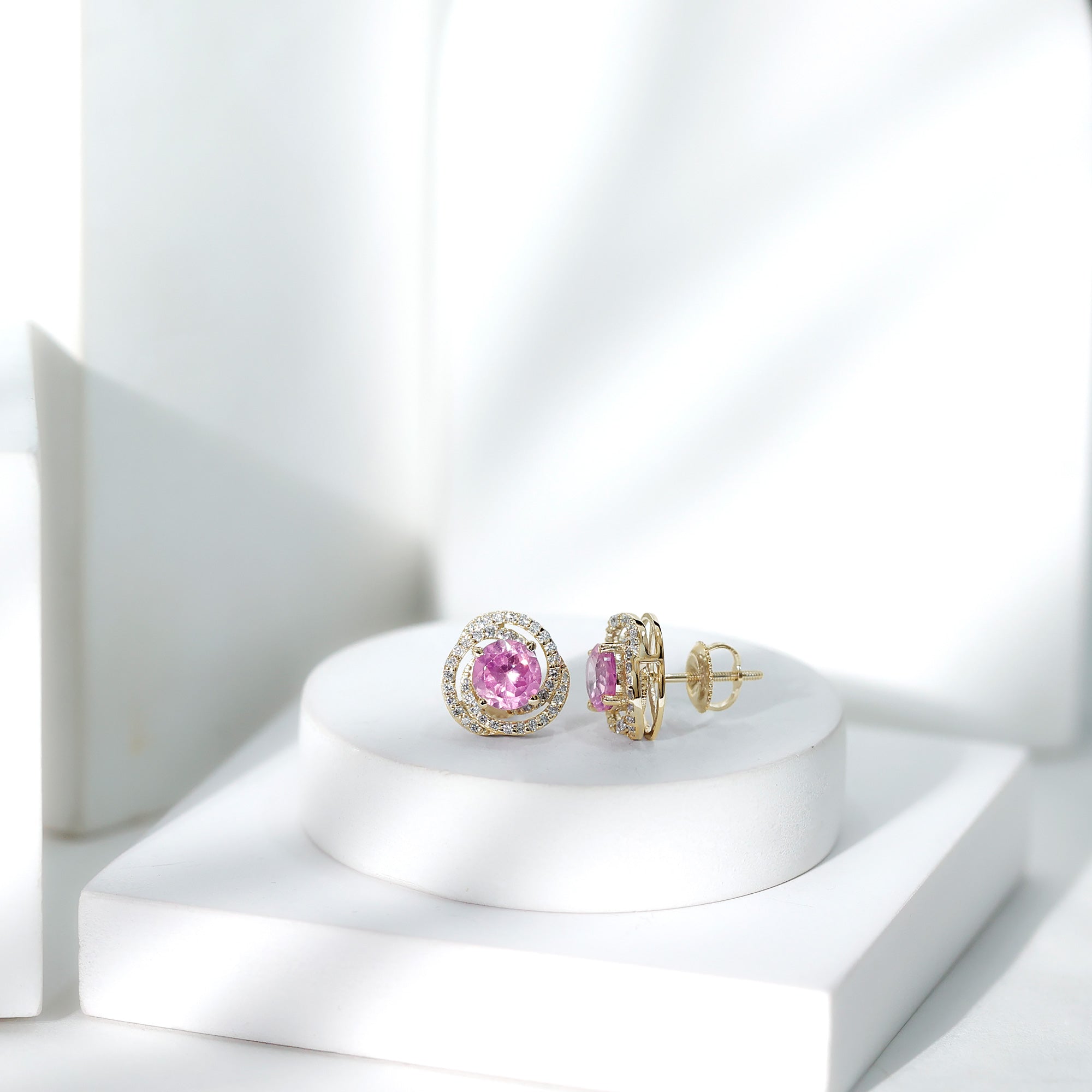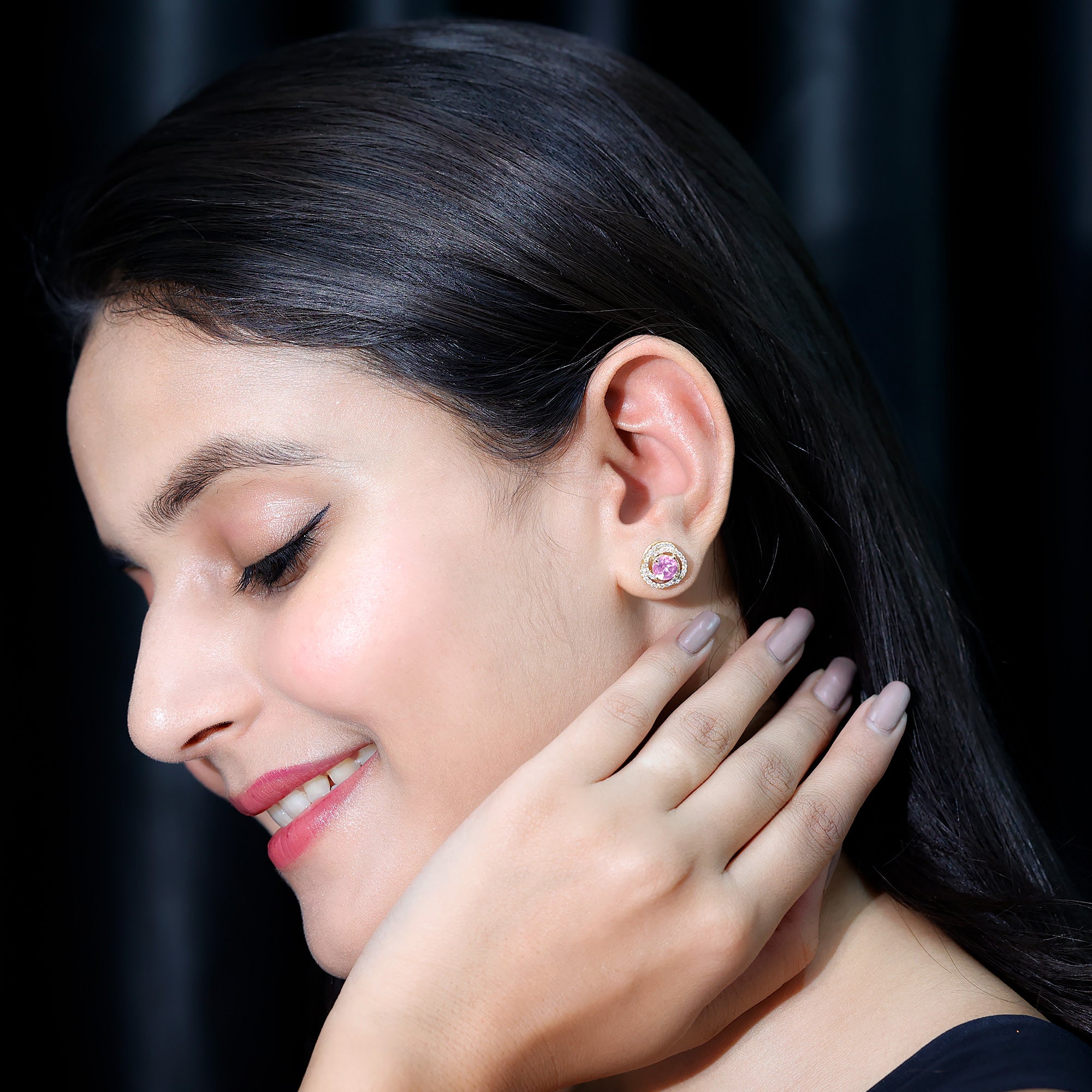 Mark your anniversary with flair through this splendid Swirl Stud Earring. The design showcases a dazzling Brilliant lab-created Round Shape Pink Sapphire held in place by a prong setting, encircled by several layers of Diamond that enhance its distinctiveness and allure.