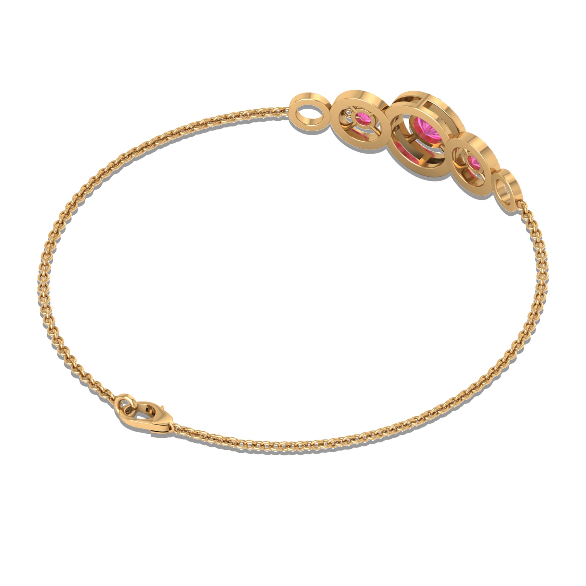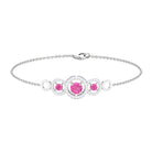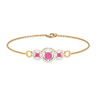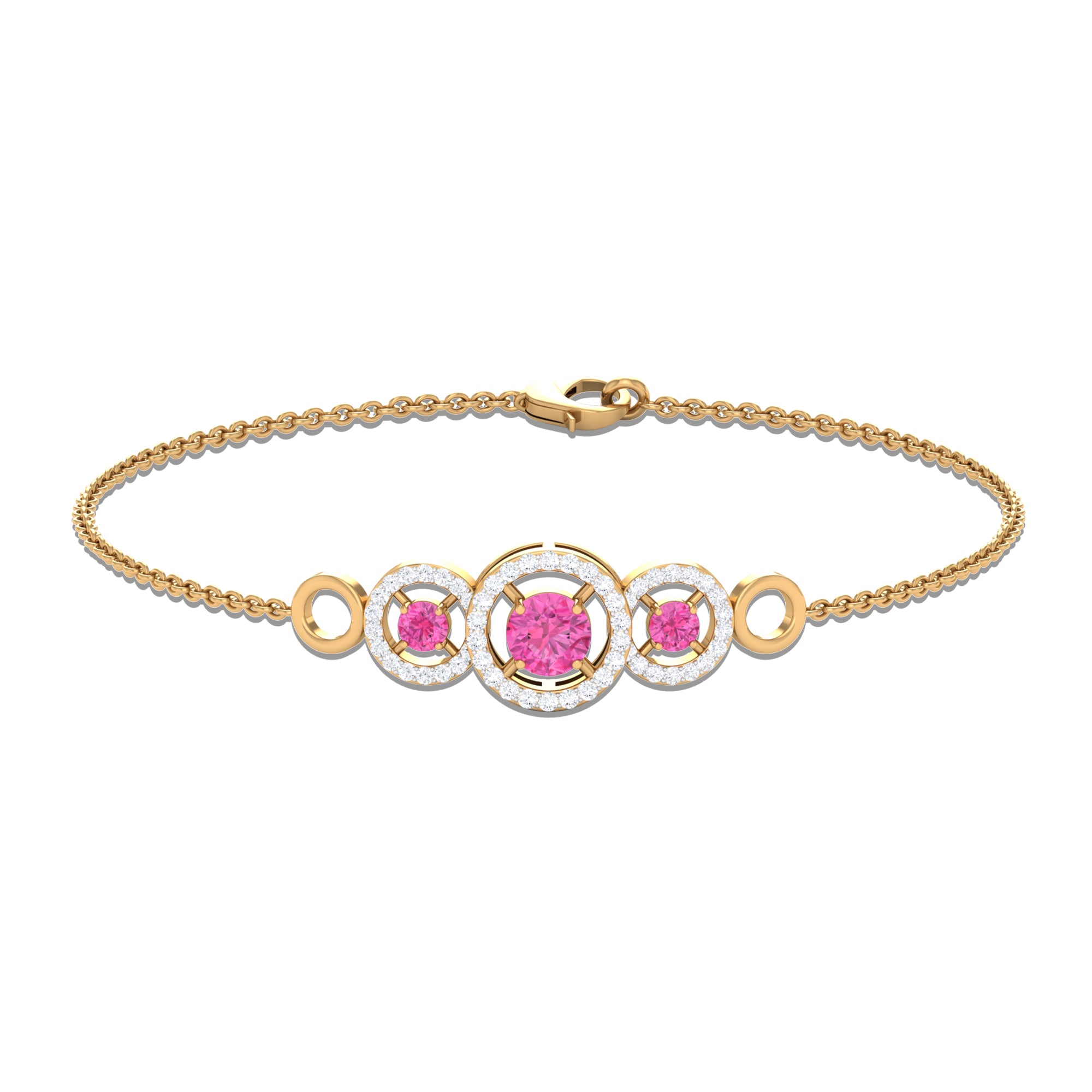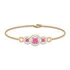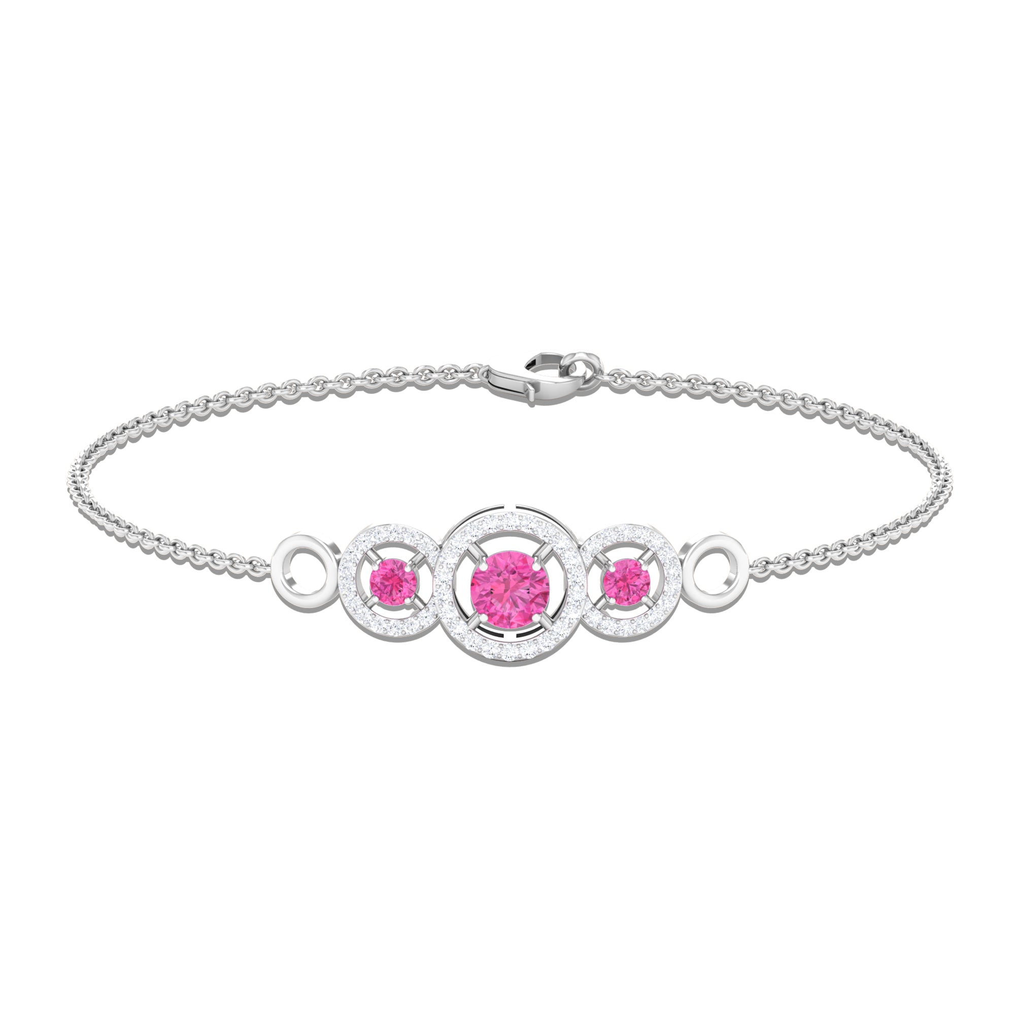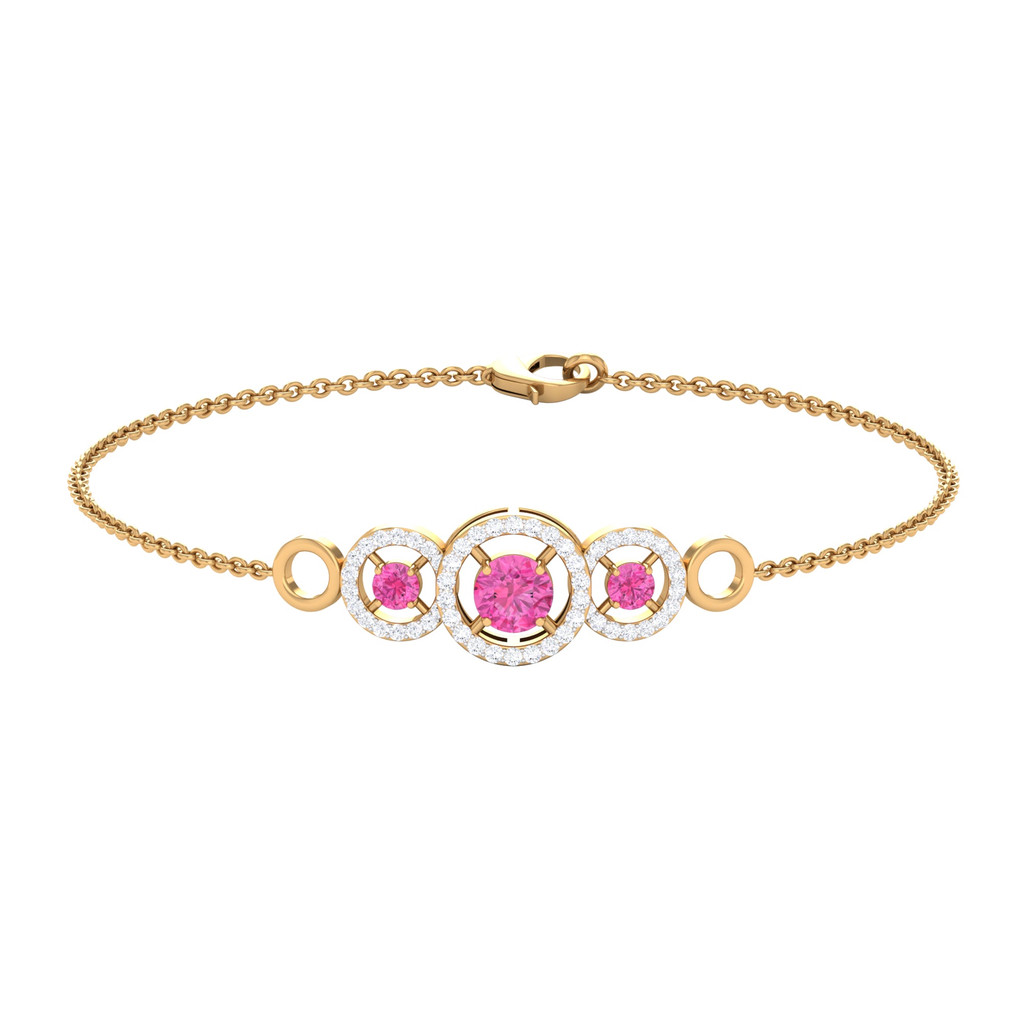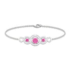 Get ready for your memorable occasion with the stunning Three Stone Bracelet. This exquisite bracelet showcases round Pink Sapphire gemstones gracefully arranged in Prong Settings, enhanced by Diamonds surrounded by Open Circles. Meticulously crafted, it is offered in a variety of metal choices to suit your style and preferences, imparting an element of sophistication to your outfit. Fastened with a lobster-claw clasp, this Pink Sapphire Bracelet guarantees both comfort and dependability, rendering it an essential accessory for any event. Whether you are preparing for a night out or seeking to enhance your daily appearance with a hint of sparkle, this Chain Bracelet seamlessly enhances your style. Ideal for significant events, be it your closest friends wedding or a formal gathering, these Pink Gemstone Bracelet guarantee that you will make a memorable impression with assurance.