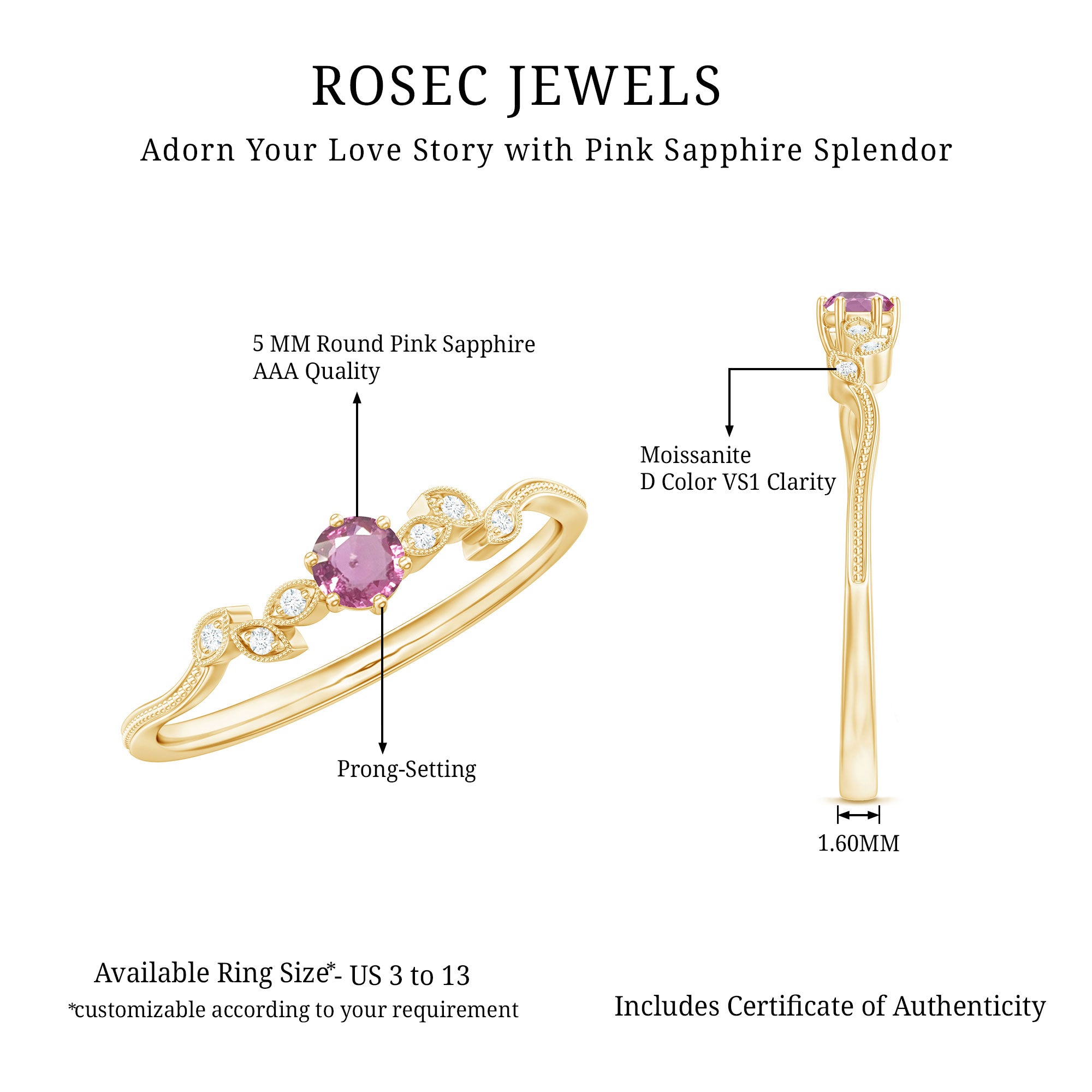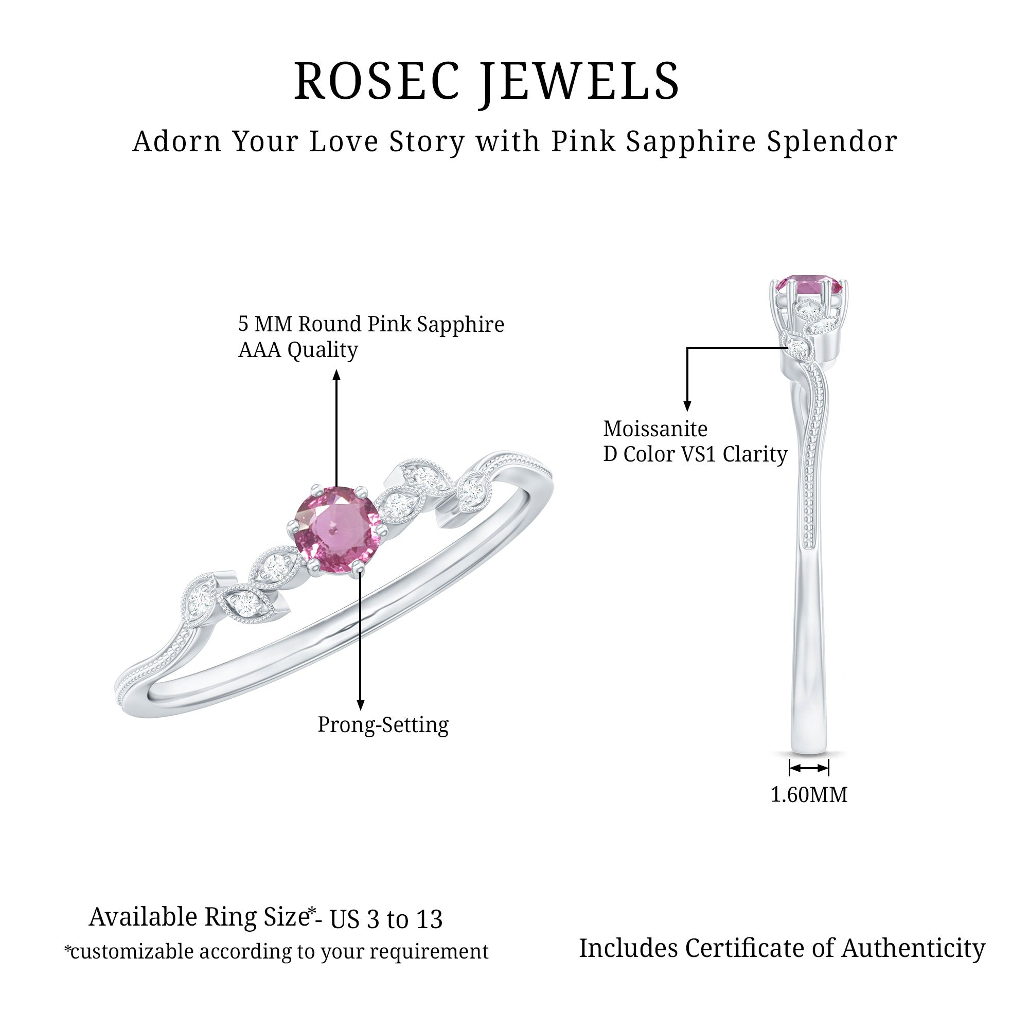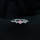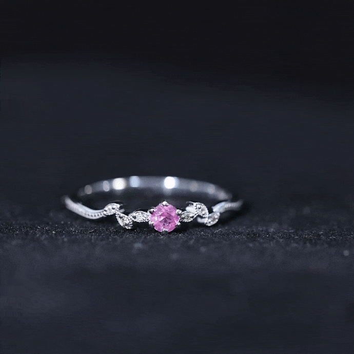 Experience the breathtaking beauty of this Promise Ring, exquisitely crafted with Pink Sapphire and Moissanite gemstones. The intricate beaded design adds a touch of grace, enhancing the ring allure. The mesmerizing Leaf Branch detail further elevates its visual appeal, creating a stunning and unique piece. Delicate and enchanting, this ring is a symbol of your promise to your beloved. Let the exquisite combination of Pink Sapphire and Moissanite radiate love and beauty, making this ring a cherished treasure that will capture hearts and leave a lasting impression.