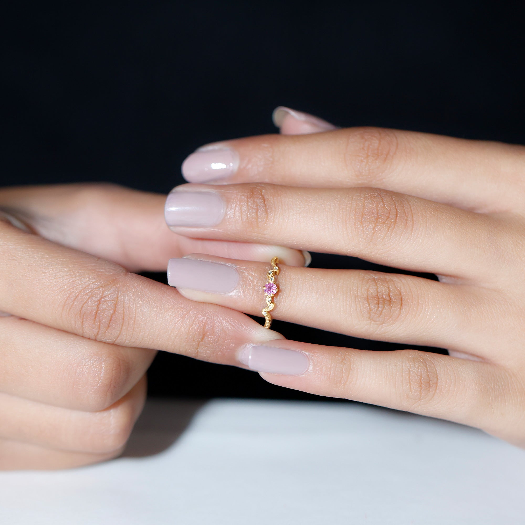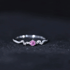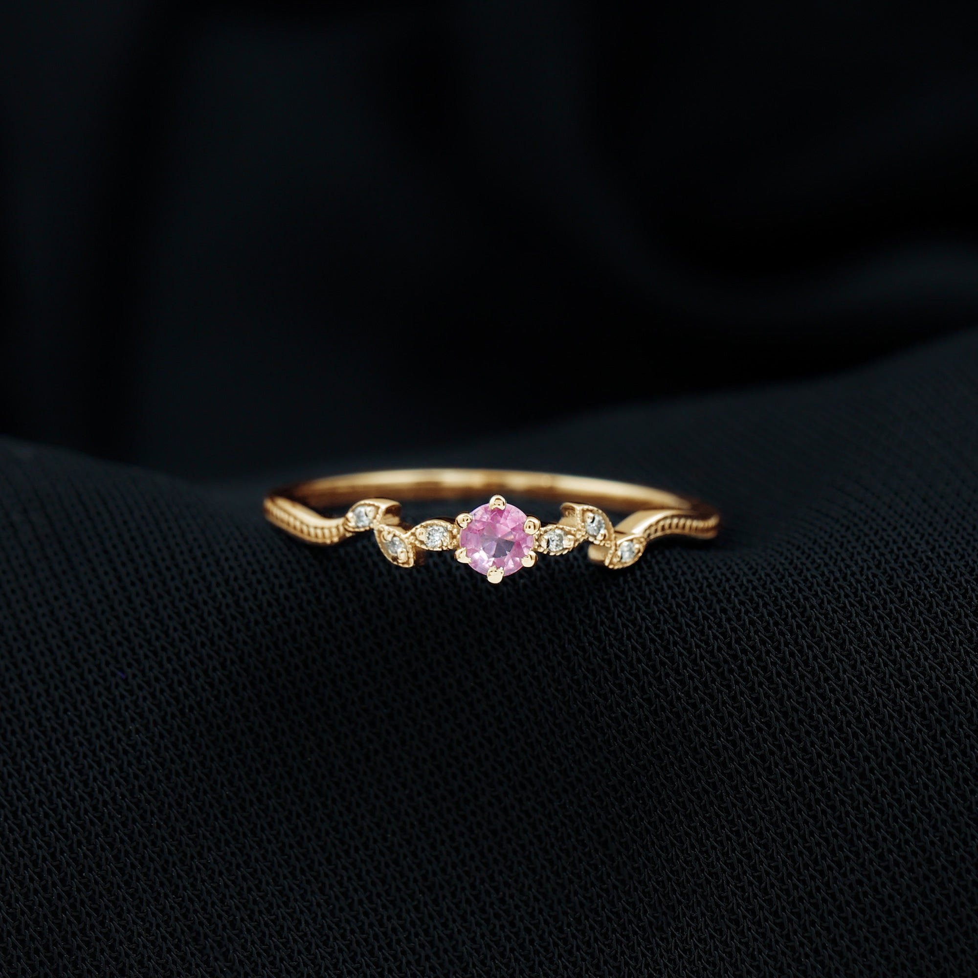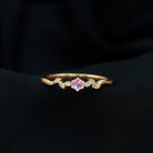 Pink Sapphire and Moissanite Leaf Promise Ring with Beaded Detailing