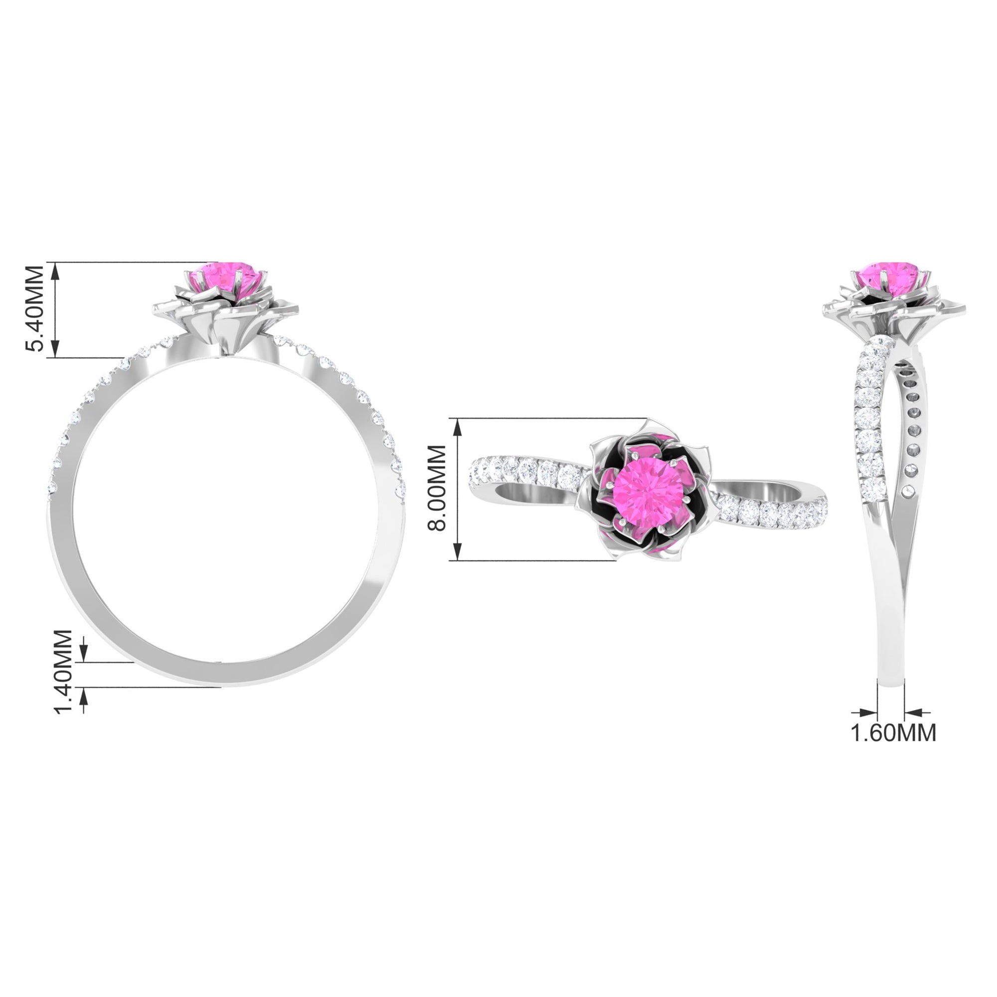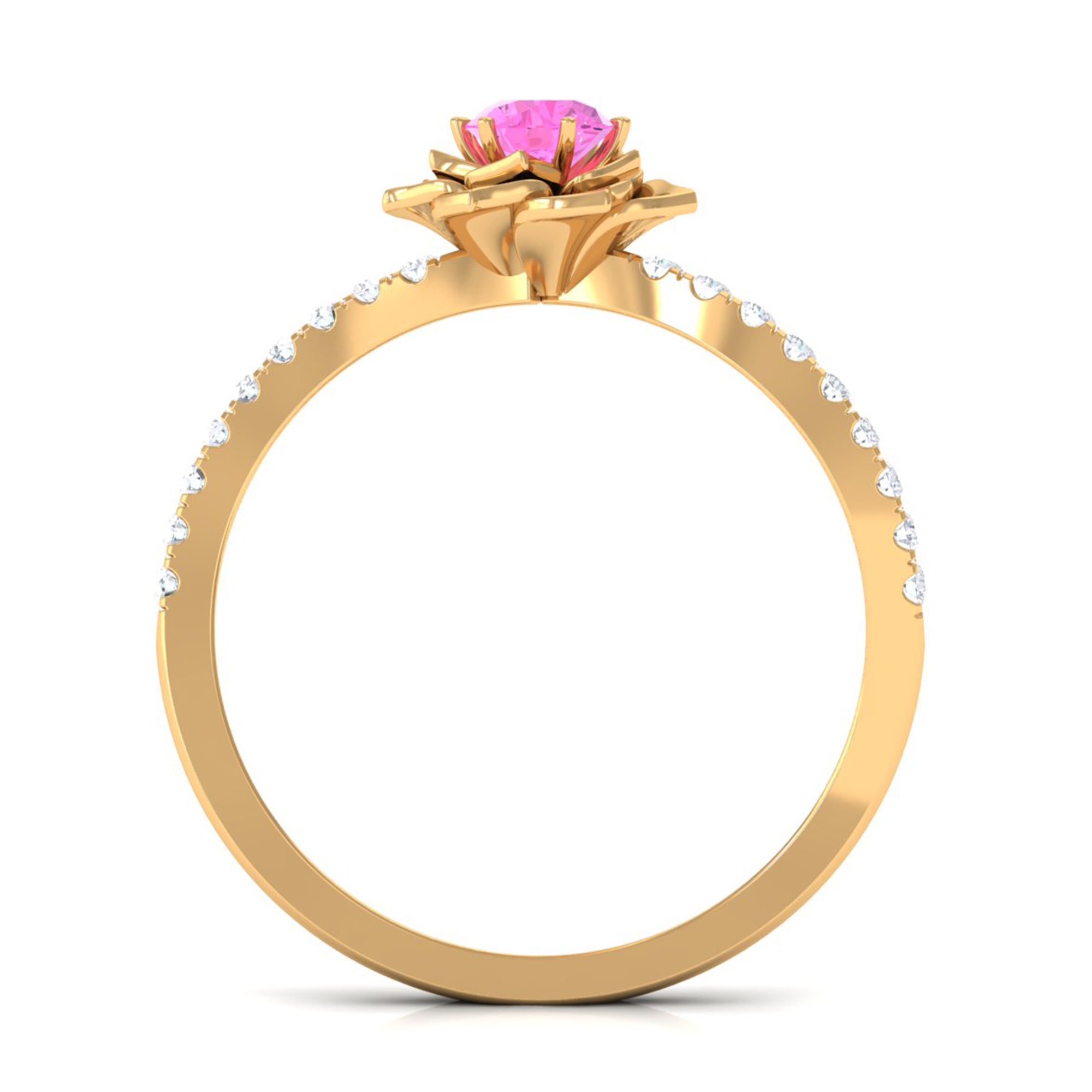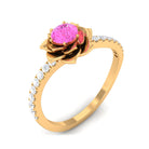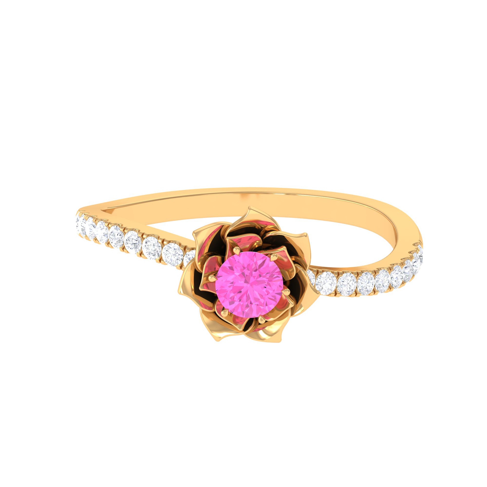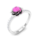 Prepare to be enchanted by the captivating blend of Pink Sapphire and Diamond in this breathtaking Rose Flower Ring. The Round Natural Pink Sapphire takes center stage, nestled amidst the delicate petals of a blossoming rose flower design that gracefully adorns the curved shank. This Floral Inspired Engagement Ring is a true gem, a testament to your blooming love.