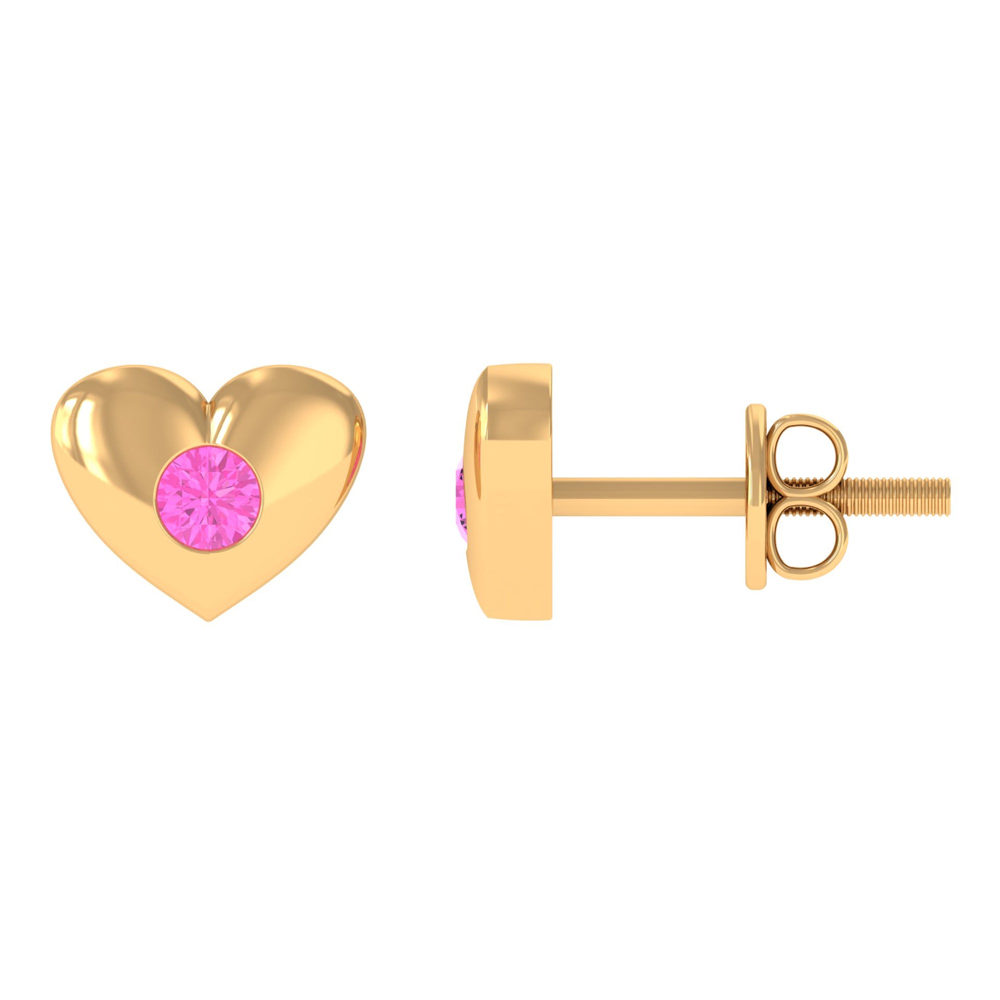 The solitaire stud earrings feature a pink sapphire that is a visual treat to the eyes. The round pink sapphire is set in a gypsy setting within a heart metal frame. Set on a durable metal, the stud earring pair is an exquisite addition to your eclectic assortment of jewels. The screw back closures keep them fastened firmly through the day and beyond.