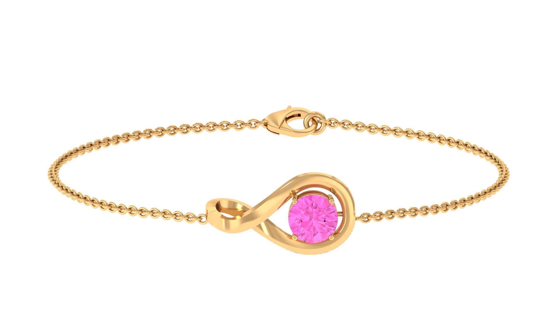 Embrace timeless elegance with the Sapphire Infinity Bracelet. Symbolizing eternity and unwavering devotion, this bracelet exquisitely embodies the spirit of everlasting love and ageless style. At the center of the bracelet is a stunning 5mm round-cut pink sapphire, elegantly positioned within the graceful curves of the infinity symbol, secured by a prong setting. The gemstones brilliance contrasts beautifully with the warm luster of the metal, creating a mesmerizing interplay of light that enhances any ensemble. More than merely a piece of jewelry, this Infinity Knot Bracelet signifies boundless affection and unity — a manifestation of promises that endure. Whether presented as a gift to a cherished individual or treasured for oneself, it serves as a perpetual reminder of enduring connections. Crafted with exceptional attention to detail, this Pink Sapphire Bracelet blends contemporary design with timeless elegance. Its delicate chain and refined loop provide an ideal combination of grace and strength, ensuring it becomes a cherished addition to your collection. Delivered in an opulent gift box, it is the perfect choice for an Anniversary, Valentine’s, or Birthday Gift for Her.