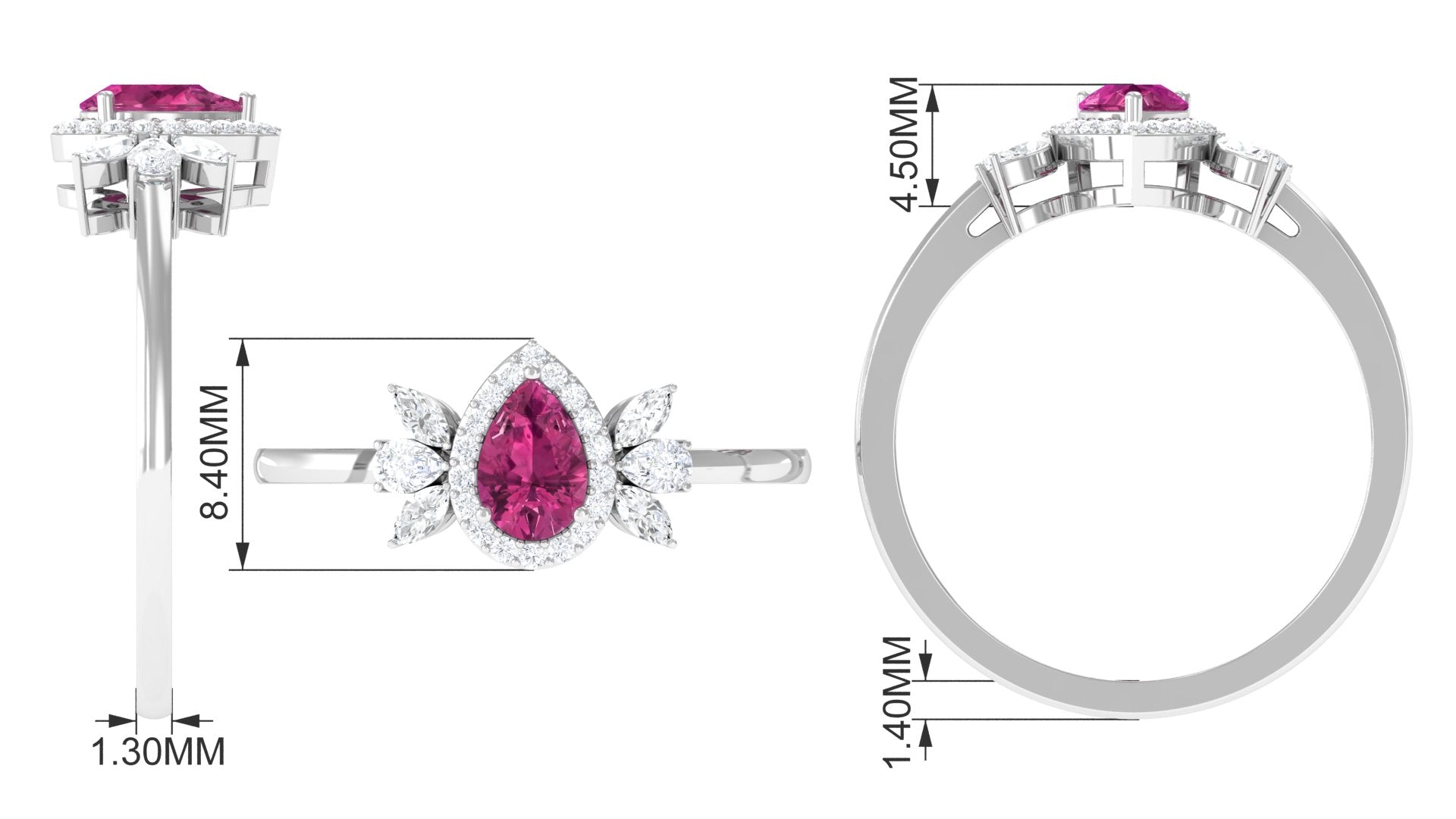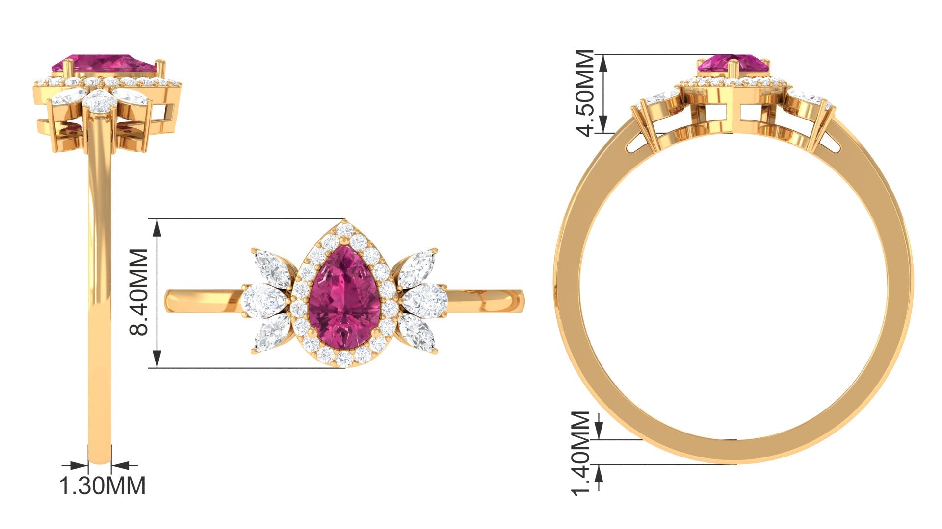 This exquisite engagement ring features a pear-cut pink tourmaline as the centerpiece, surrounded by a halo of sparkling Diamond stones. The tourmaline is expertly cut and polished to showcase its unique pink color and brilliance. The ring is crafted in a classic and durable gold. The ring is perfect for those who love the unique look of a pink tourmaline and want the benefits of the Diamond. The halo of Diamond adds a touch of elegance and sparkle to this timeless piece. The ring is designed to make a statement and is sure to be treasured for years to come. The combination of the Pink tourmaline and Diamond creates a perfect contrast of color and sparkle that is sure to dazzle.
