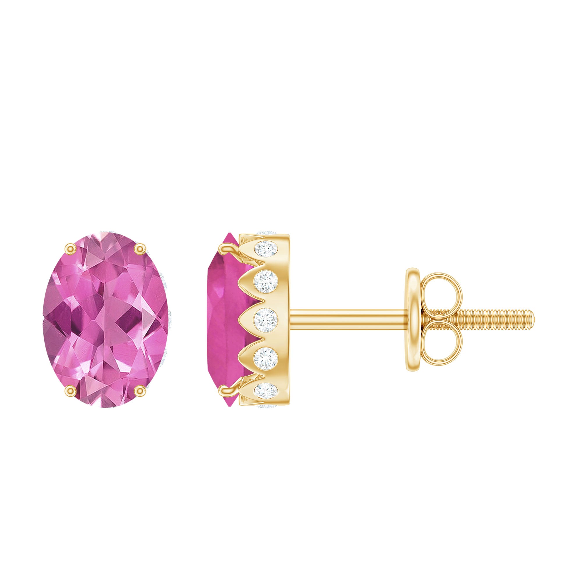 The Pink Tourmaline Oval Stud Earrings are a timeless keepsake that youll be finding reasons to wear again and again. Each stud in the Contemporary Earrings comprises an Oval Cut Pink Tourmaline secured by 4 Prong Setting while dainty Round Diamonds studded on the sides. These Screw Back Earrings are beautifully composed with Hallmarked Metal. Get these Tourmaline Earrings for your loved one as they will add sparkle to all her favorite looks.