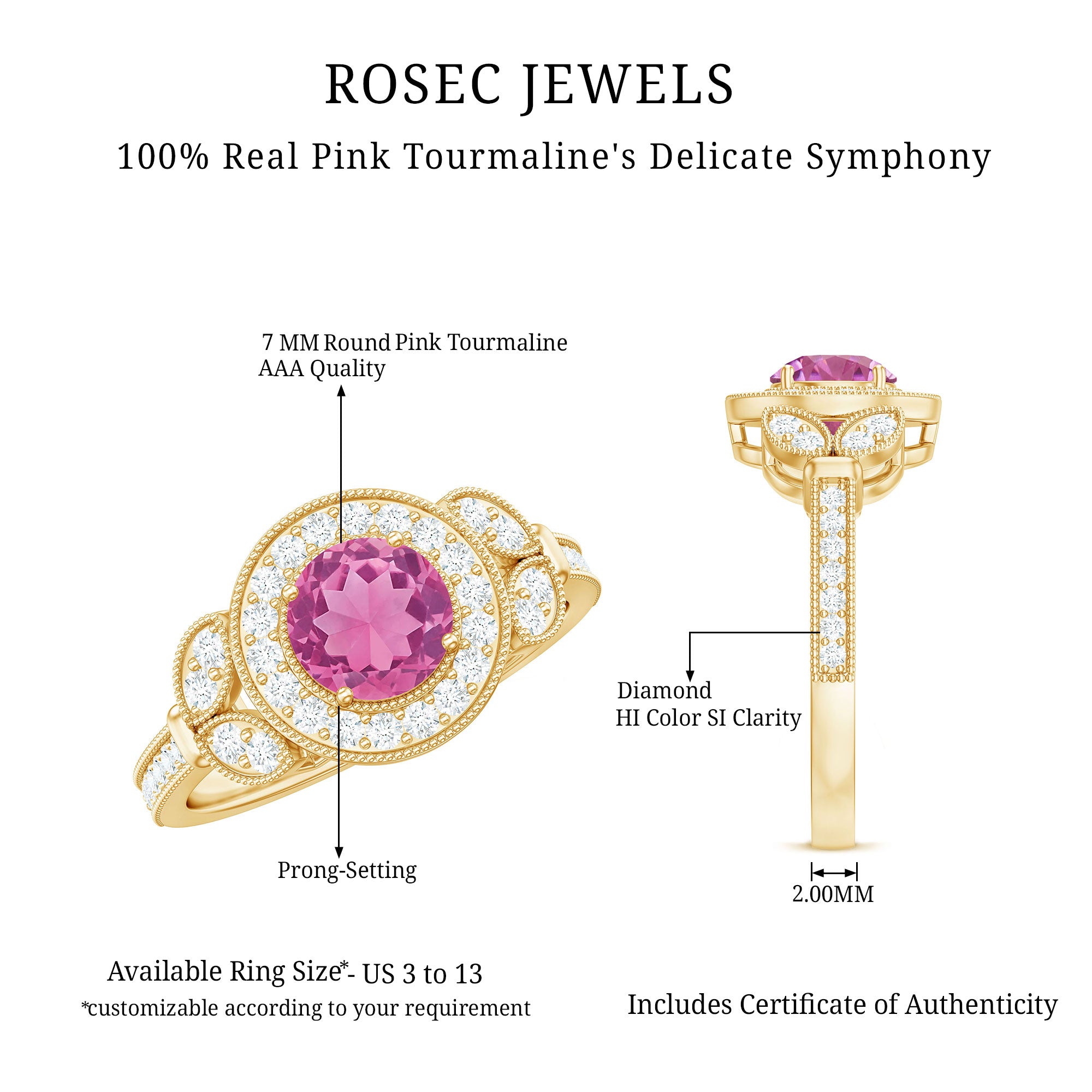 Step into timeless elegance with this Pink Tourmaline Vintage Style Engagement Ring. Sparkling Diamond captures the essence of old world charm.