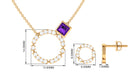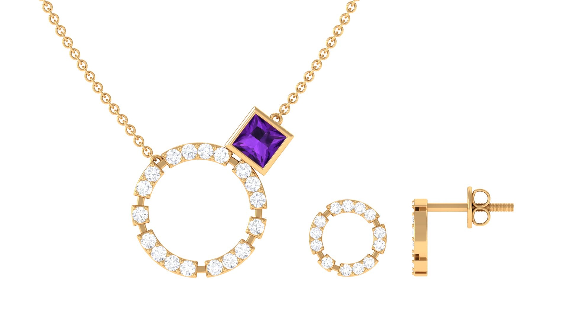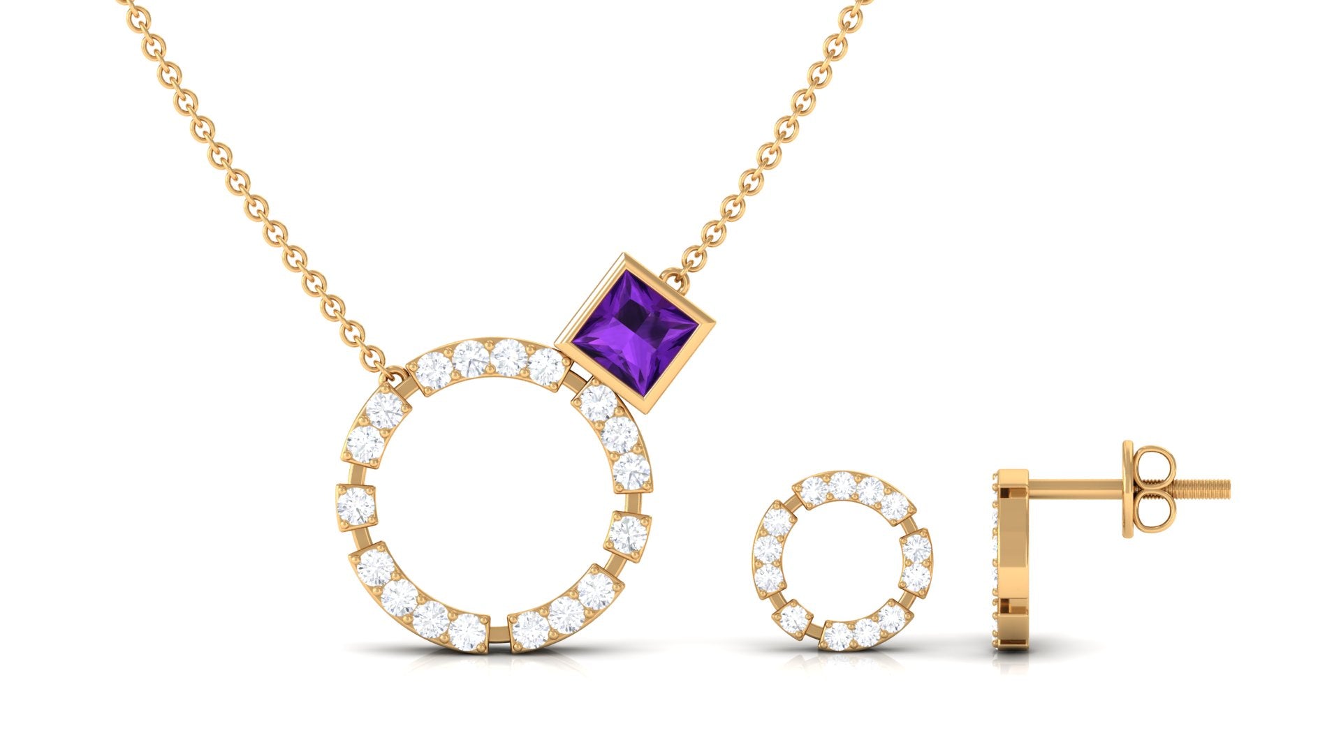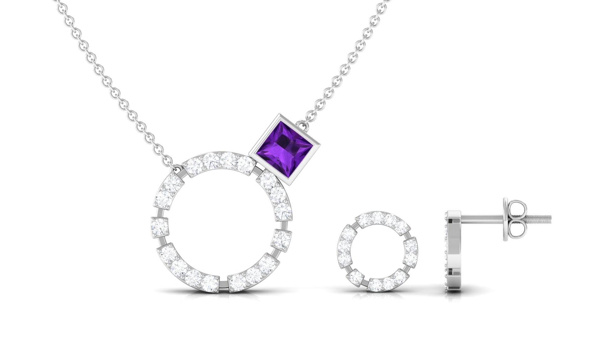 This Eternity Jewelry Set features a stunning Princess Cut Amethyst in a bezel setting, paired with a Round Diamond Open Circle. The combination of the rich purple hue of the Amethyst and the sparkling brilliance of the Diamond creates a captivating and timeless look. This Necklace and Earrings set is perfect for anyone who loves classic yet modern jewelry.