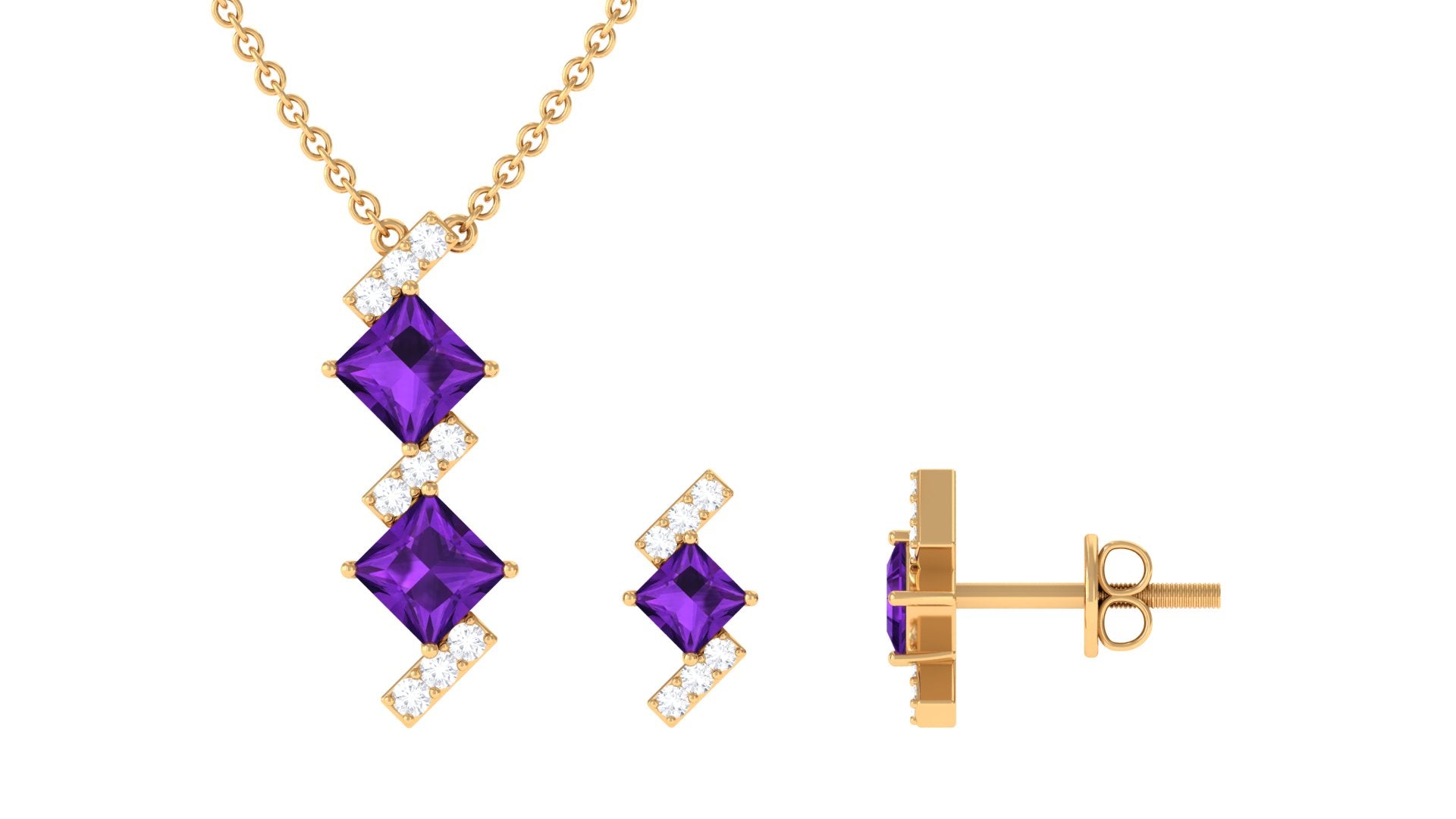 The Amethyst Jewelry Set is simply adorable, and once you lay eyes on it, you wont be able to look away. This pendant set includes a beautiful Pendant and Stud Earrings, featuring a stunning Princess Cut Amethyst stone set in a secure Prong Setting, along with sparkling Diamond accents. Treat yourself to a little pampering with this amazing Amethyst Jewelry Set. With a total weight of 1.5 Carat and AAA Quality certification, you can trust that all of the gemstones in this set have undergone strict quality checks to ensure their beauty and durability.