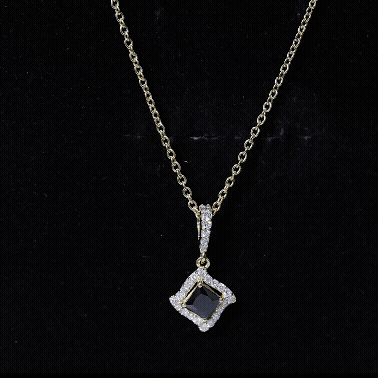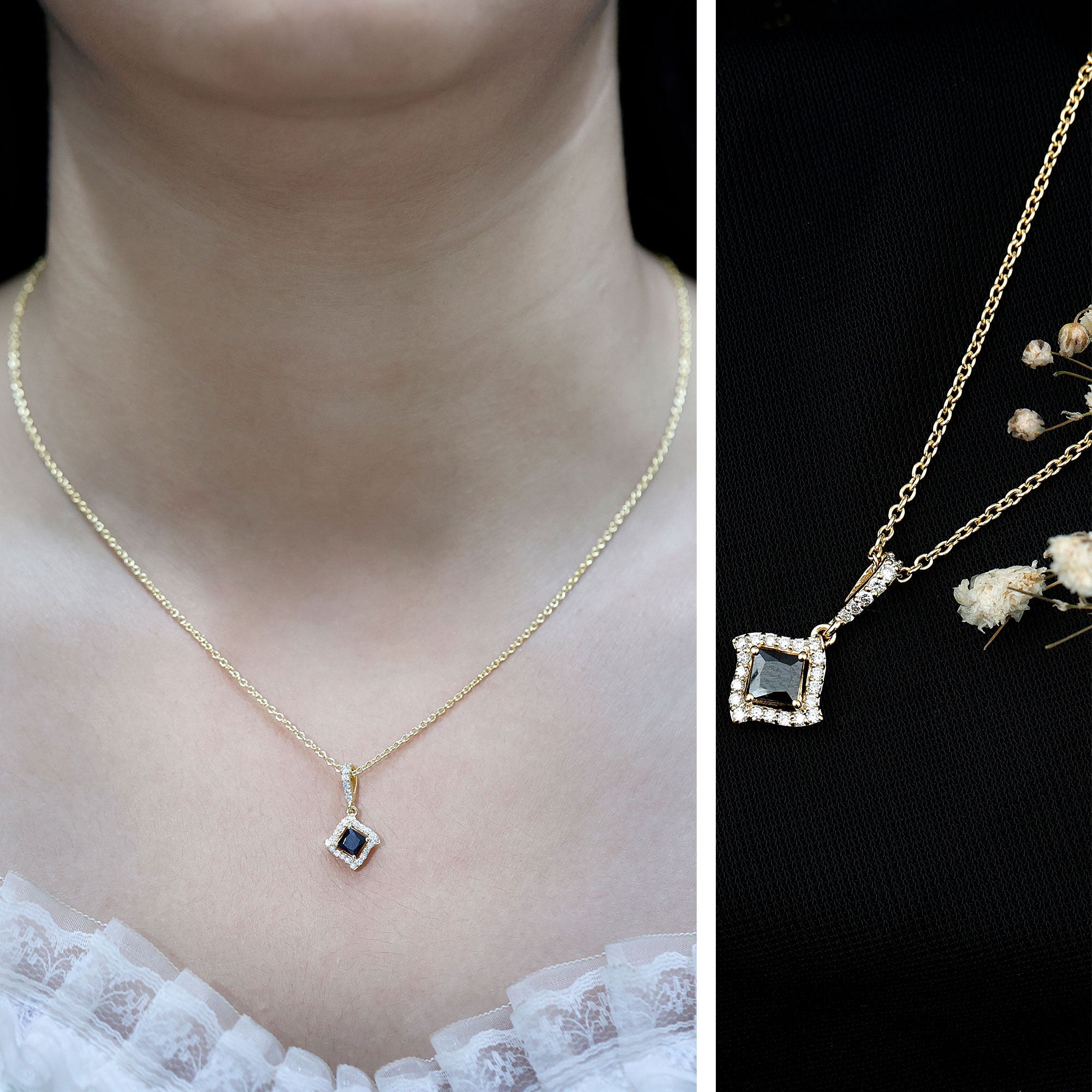 Bold, elegant, and full of charm, this Black Spinel and Diamond Necklace is designed to make you feel special every time you wear it. At the center of the pendant sits a striking 4 MM princess cut black spinel set in secure prong setting. It is framed beautifully by a shimmering halo of lab grown diamonds, creating a perfect contrast that catches the light with every move. What makes this Black and White Necklace even more eye-catching is the decorative bail, which is also encrusted with sparkling round lab grown diamonds. The pendant hangs from a strong cable chain, offering a timeless look that sits comfortably at the neckline. Whether you are getting dressed up for a romantic dinner, attending a wedding, or just want to add something special to your everyday outfit, this Princess Cut Necklace is a perfect choice. It is a great gift for birthdays, anniversaries, or any moment when you want to show love and appreciation, whether for someone else or for yourself.