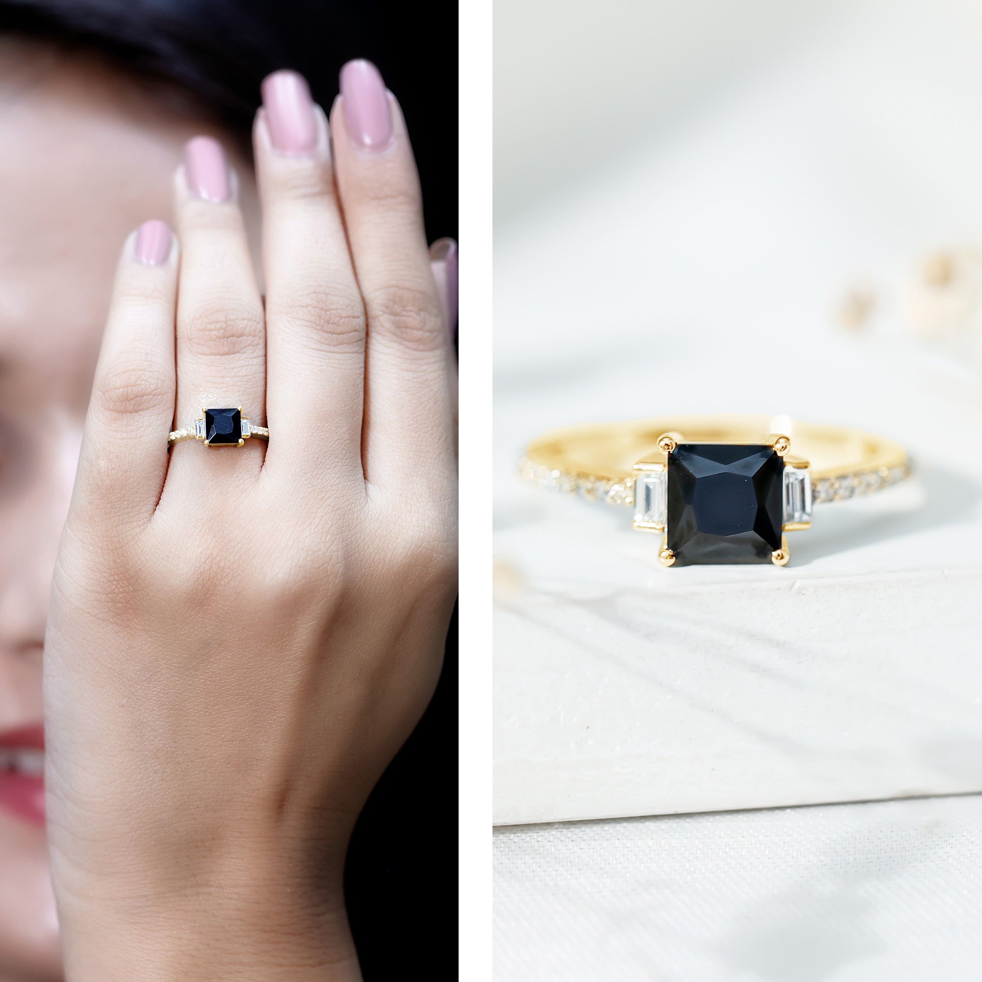Surprise your special someone with a beautiful Engagement Ring, featuring a Princess Cut Created Black Diamond solitaire in a Claw Setting and accented by Round and Baguette Cut Diamond Side Stones. Made of Gold to make it a classic gift for your beloved.