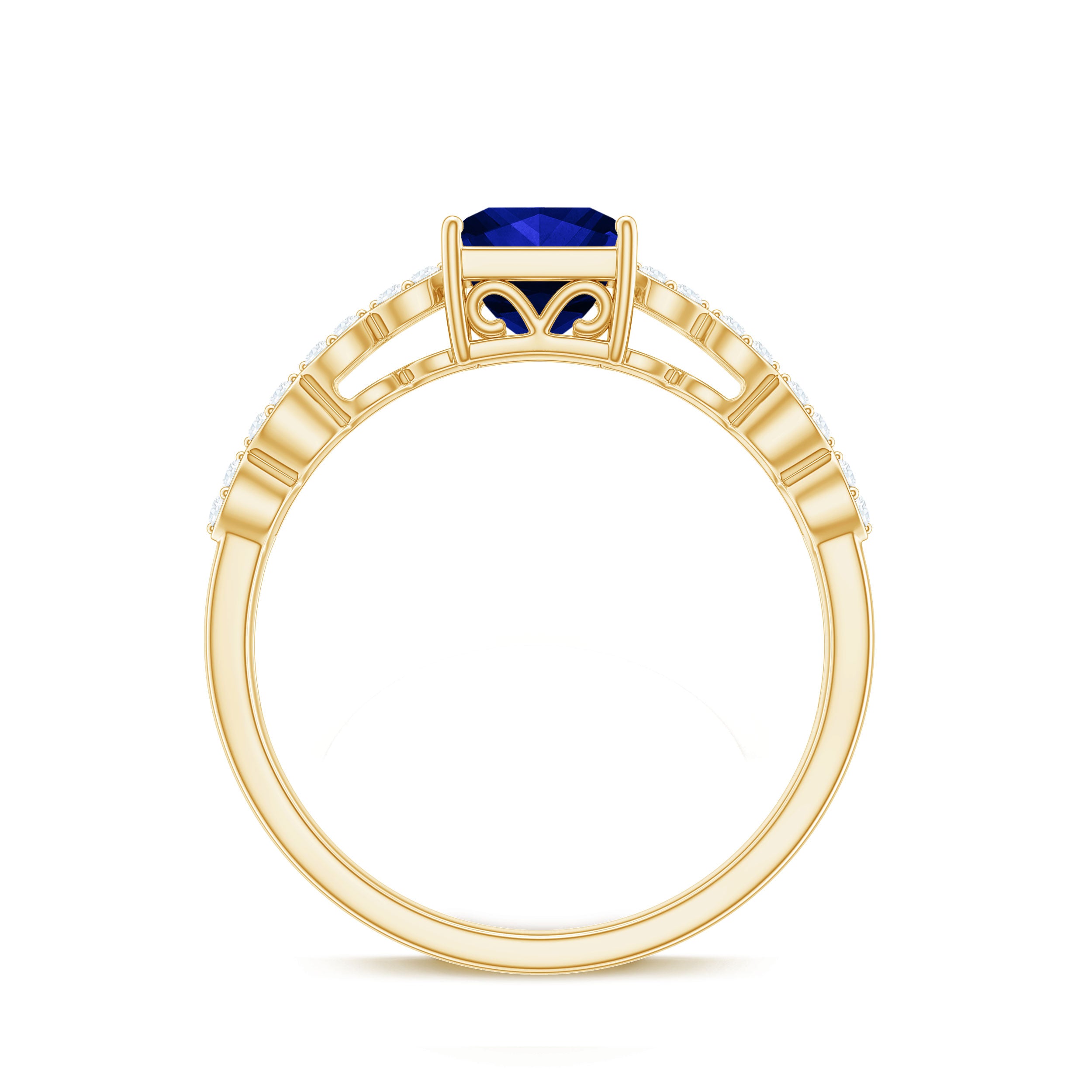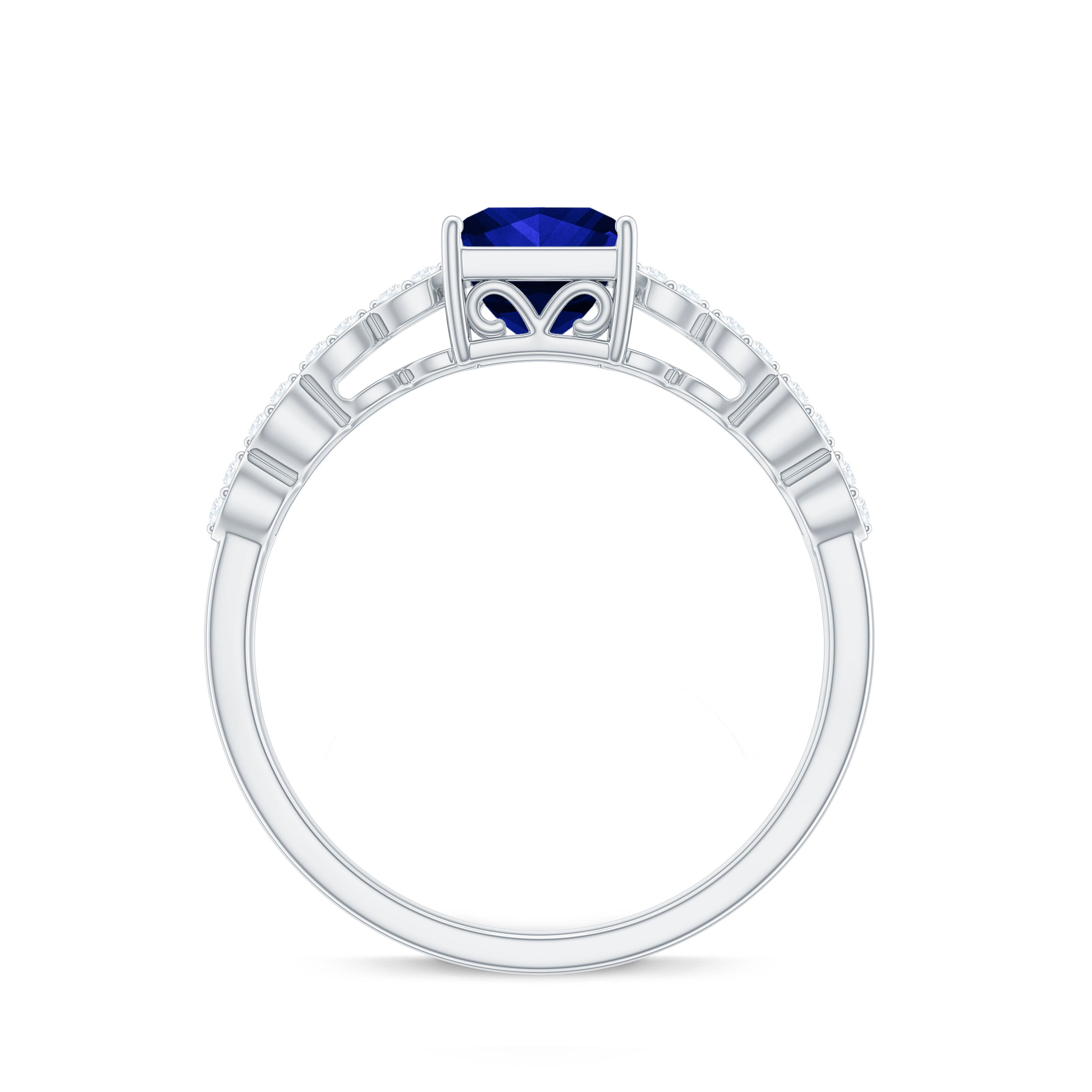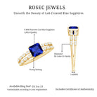 Admire the elegance of the Princess Cut Created Blue Sapphire, delicately cradled in a 4 Prong Setting, radiating its mesmerizing blue hue. Embellished by a Diamond Double Band, the ring exudes a captivating minimal charm. This Created Blue Sapphire and Diamond Engagement Ring captivates with its dazzling sparkle, leaving everyone enchanted by its allure.