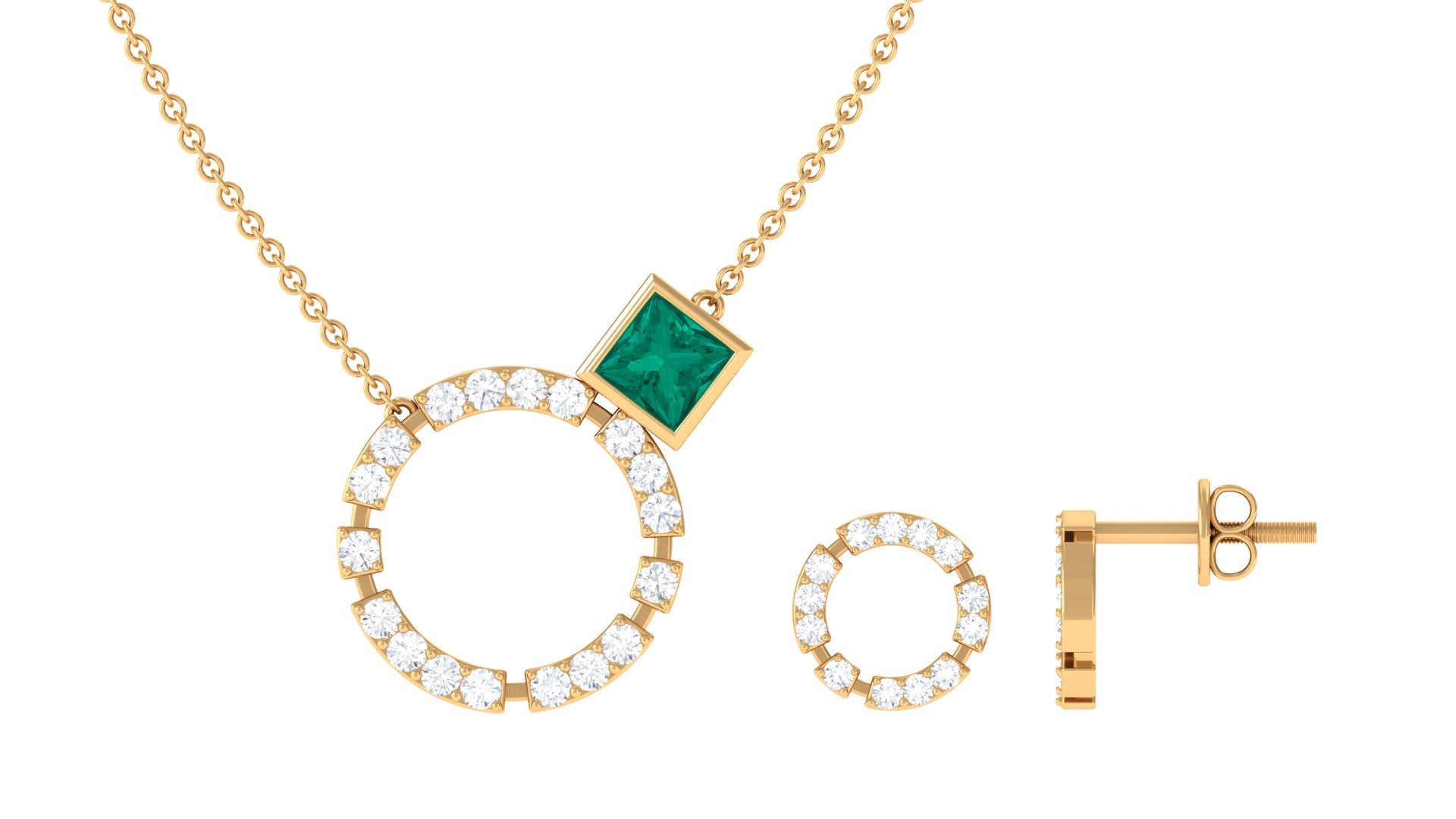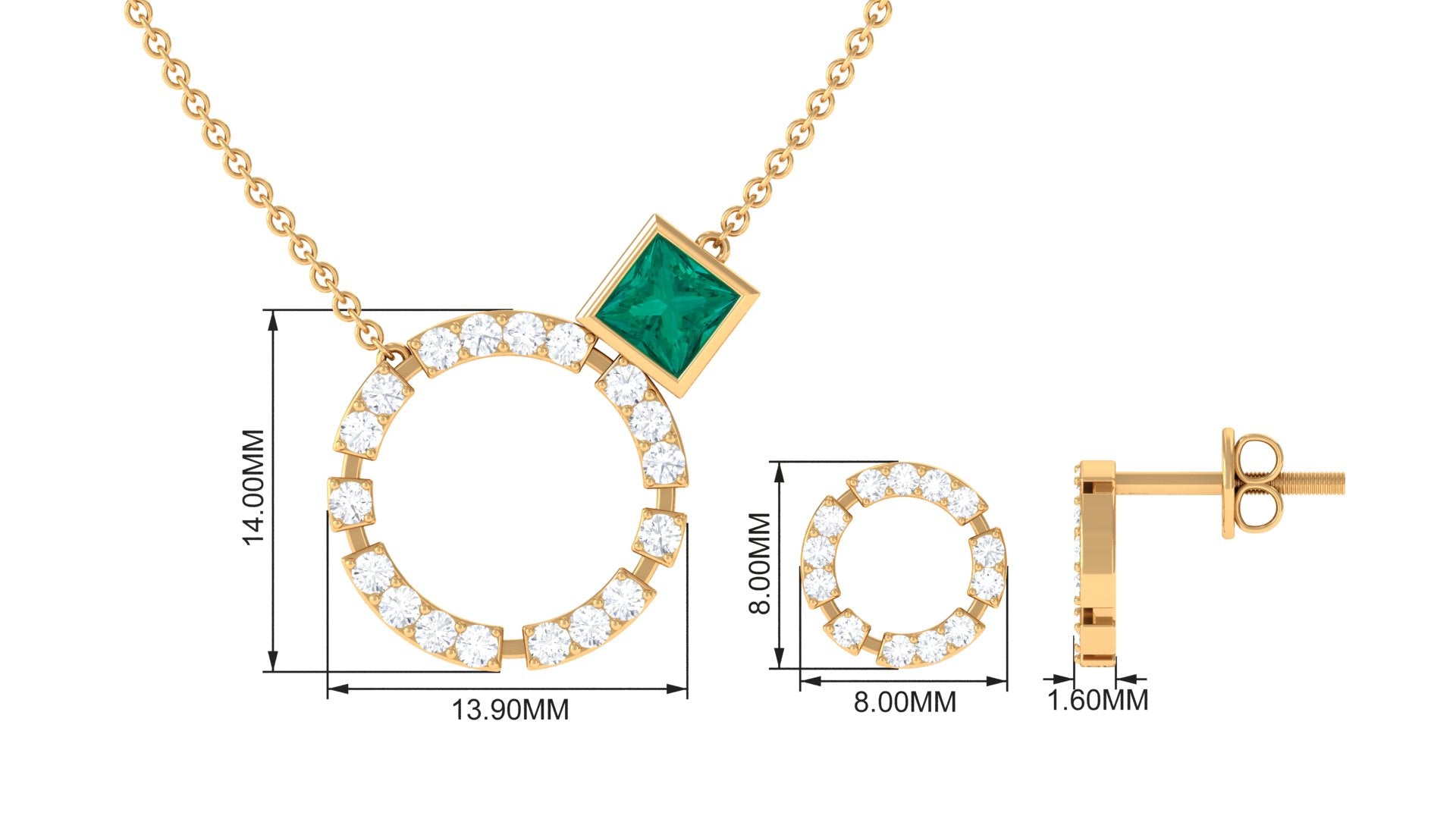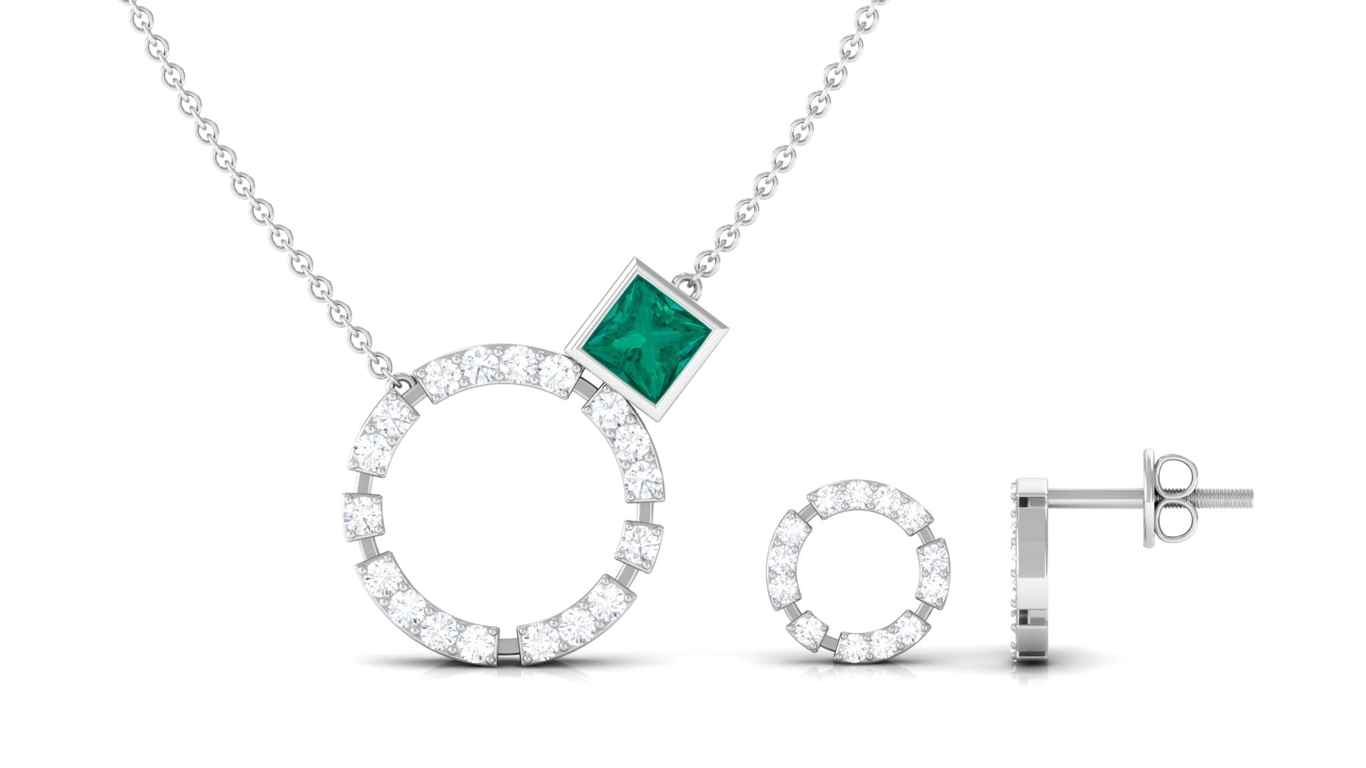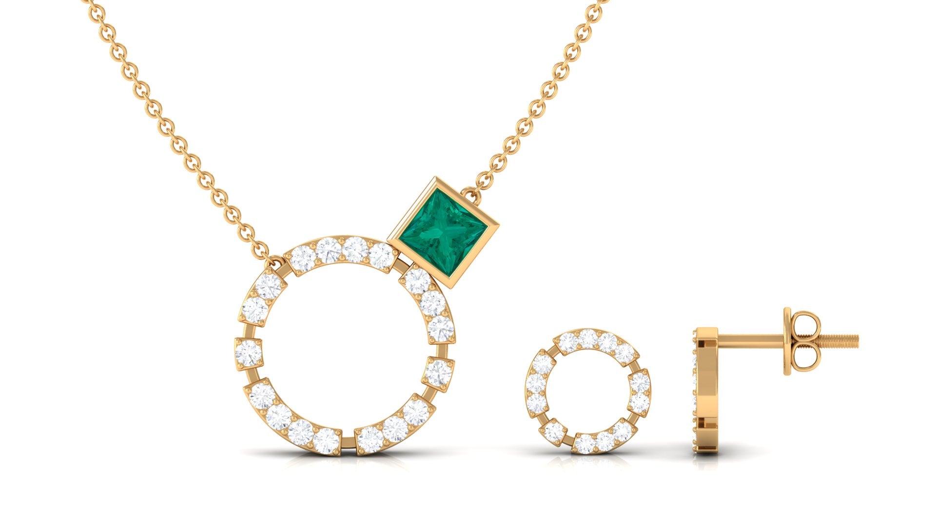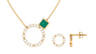 This Eternity Jewelry Set features a stunning Princess Cut Emerald in a bezel setting, paired with a Round Diamond Open Circle. The combination of the rich green hue of the Emerald and the sparkling brilliance of the Diamond creates a captivating and timeless look. This Necklace and Earrings set is perfect for anyone who loves classic yet modern jewelry.