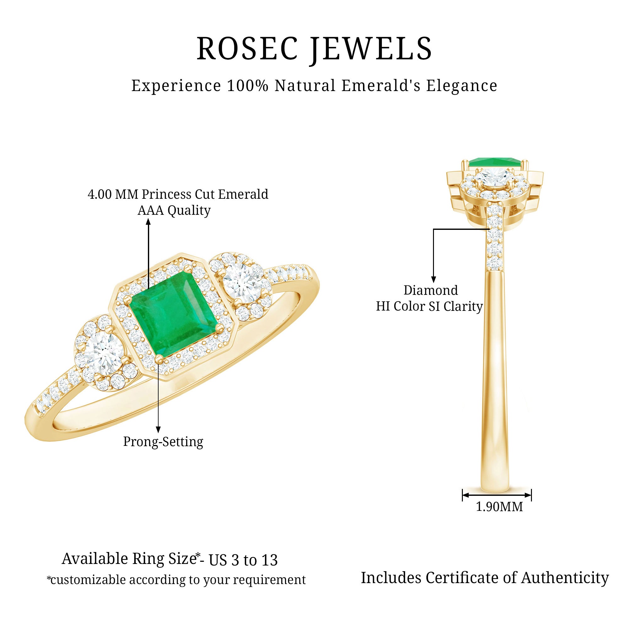 Significant moments deserve a touch of brilliance - this Emerald Engagement Ring is here to make a statement with its remarkable shine. At the heart of this Princess Cut Engagement Ring lies a 4 MM princess cut emerald, securely set in prongs and encircled by a breathtaking halo of delicate round cut diamond stones. The band, adorned with diamond, enhances the sparkle from every angle, perfectly merging simplicity with elegance. This exquisite Princess Cut Emerald Ring is crafted to ensure your moment is truly memorable. Do not overlook this Emerald Halo Ring, allowing your forever to radiate even more brilliantly. It captures the captivating charm of a Timeless Engagement Ring, meticulously designed and available in various metal choices to match your preferences. With sizes available from 3 to 13 according to US standards, we also provide a complimentary ring sizer to help you discover your perfect fit without any last-minute concerns. Packaged in a signature jewelry box ideal for gifting, this Halo Engagement Ring assures that every occasion is remarkable for your Girlfriend, Fiancée, Wife, or Mother.