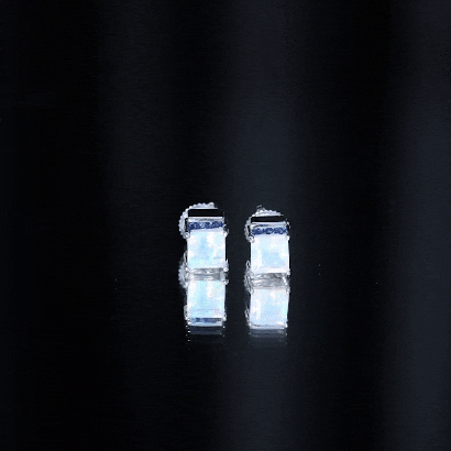 These one-of-a-kind Stud Earrings feature exquisite princess-cut Ethiopian Opal cradled securely within prong setting. Atop the central stone, youll find three small round blue Sapphires artfully nestled in bar setting. These opal earrings are fully customizable, offering a variety of metal options to suit your preferences.