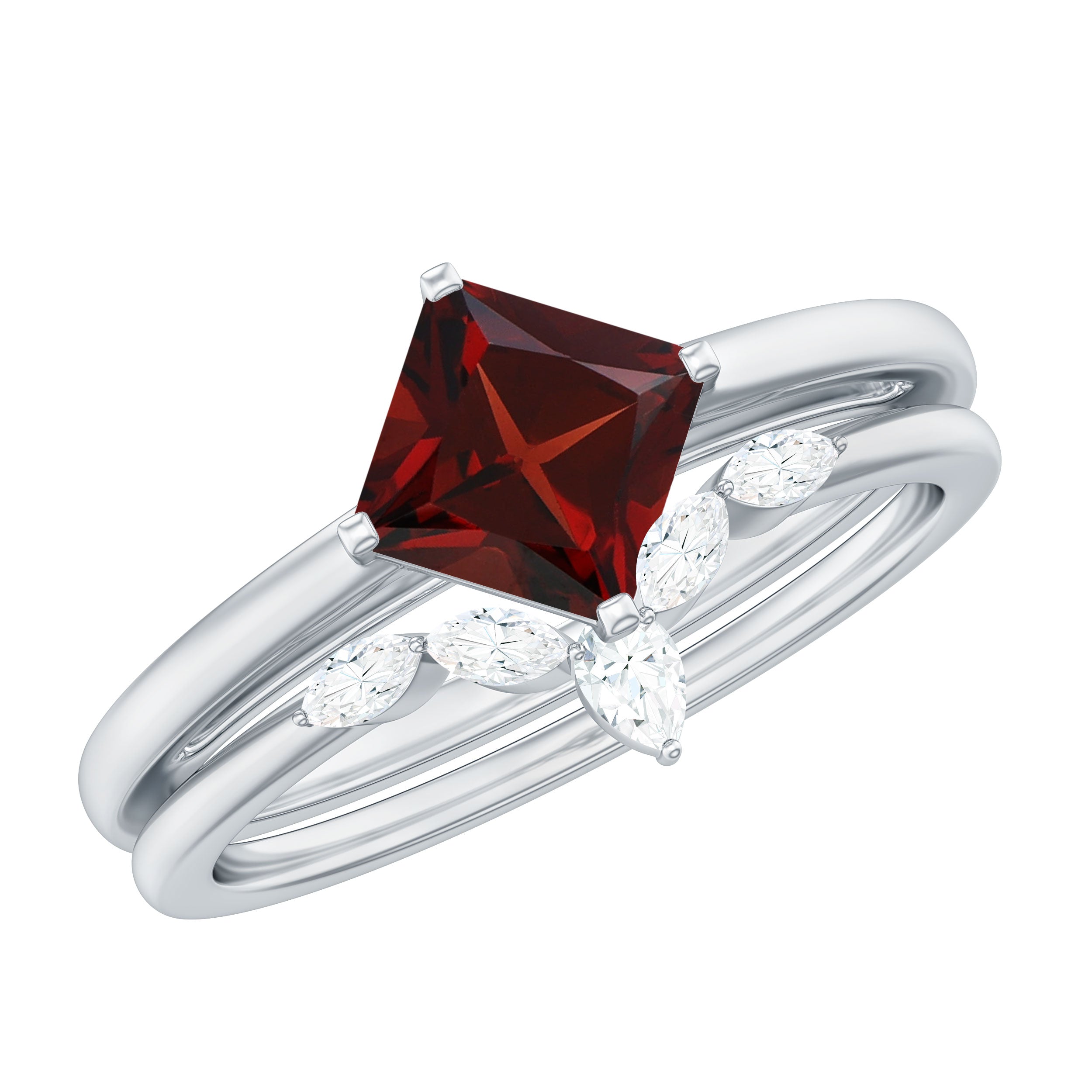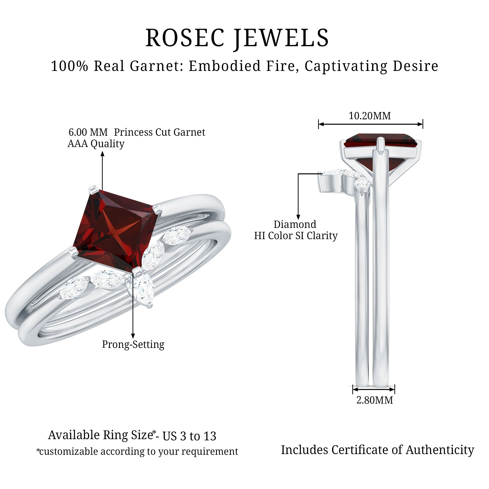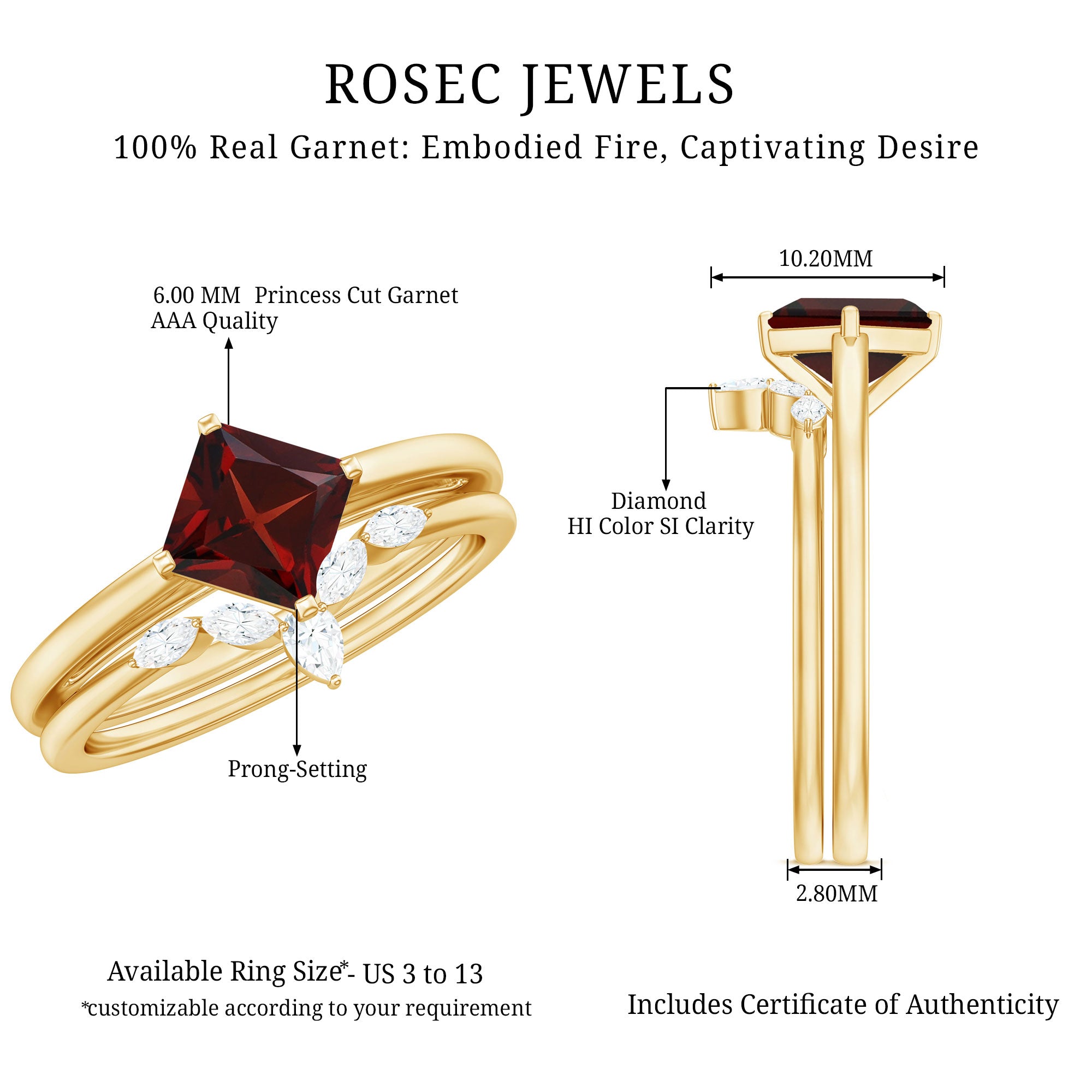 6MM Princess Cut Garnet Solitaire Bridal Ring Set with Diamonds