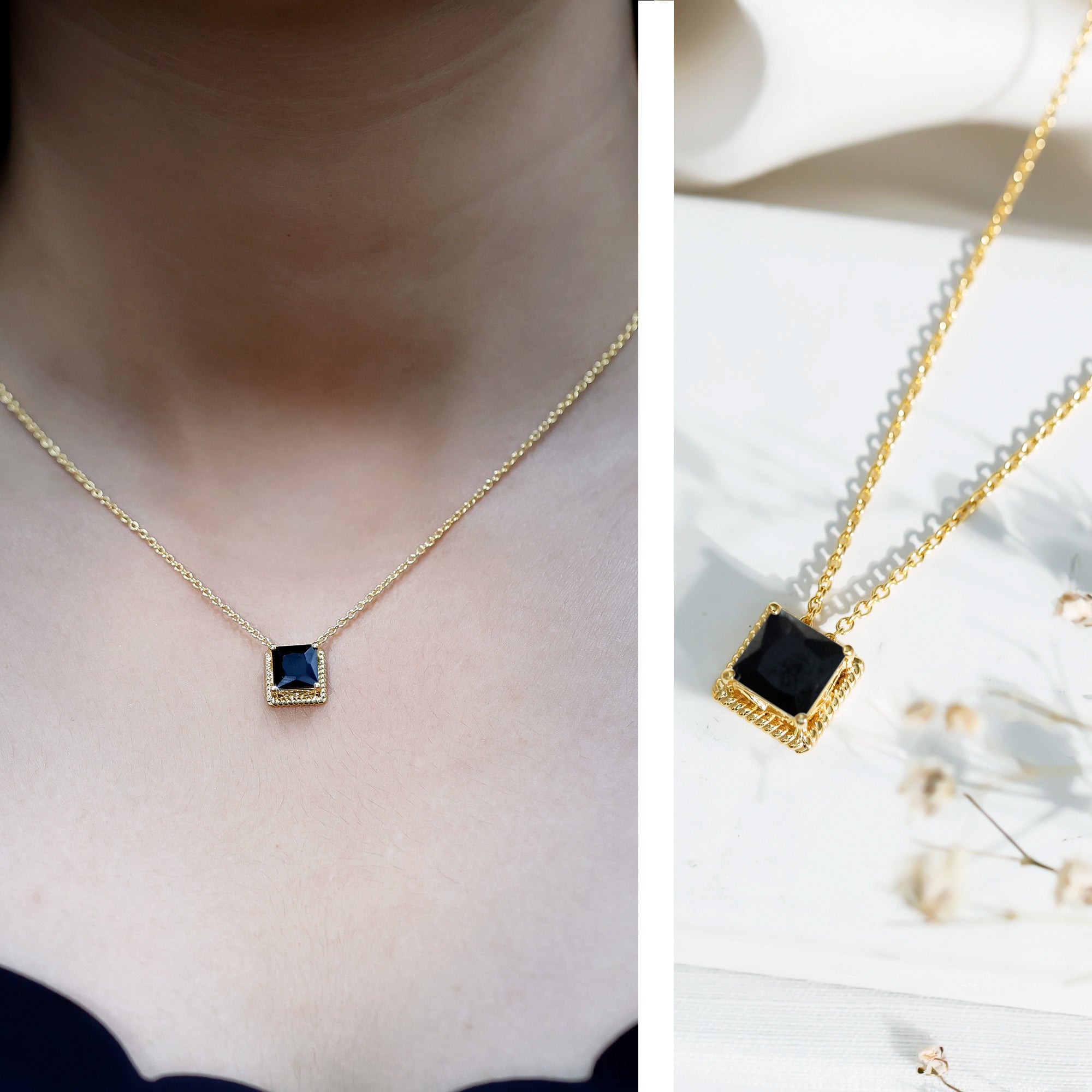 Add a bold touch to your everyday style with a necklace that speaks elegance. If you are looking for something modern, sophisticated, and full of character, this Lab Created Black Diamond Necklace is exactly what your jewelry collection needs. At the heart of the design is a striking 7 MM princess cut lab grown black diamond, set in prong setting. What sets this Princess Cut Necklace apart is the beautiful twisted rope frame that surrounds the center stone. Crafted in 14k yellow gold plated silver, the detailed rope pattern gives the pendant a rich, textured look with a touch of vintage charm. This Black Diamond Solitaire Necklace is not only ethical but also environmentally friendly, perfect for those who care about the planet as much as they do fashion. Suspended from a durable chain with a standard bail, this Black Gem Necklace is made for comfortable, secure wear all day long. Whether you are dressing up a basic tee or adding polish to your evening outfit, it transitions effortlessly from casual to elegant. It also makes a thoughtful and meaningful gift for someone who loves to stand out without saying a word. So, whether you are heading into a meeting or a night out, let this Womens Black Diamond Necklace add that subtle wow factor to your look.