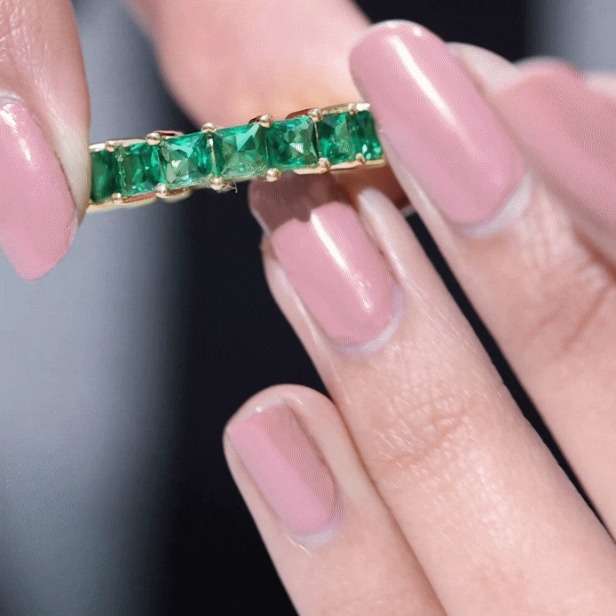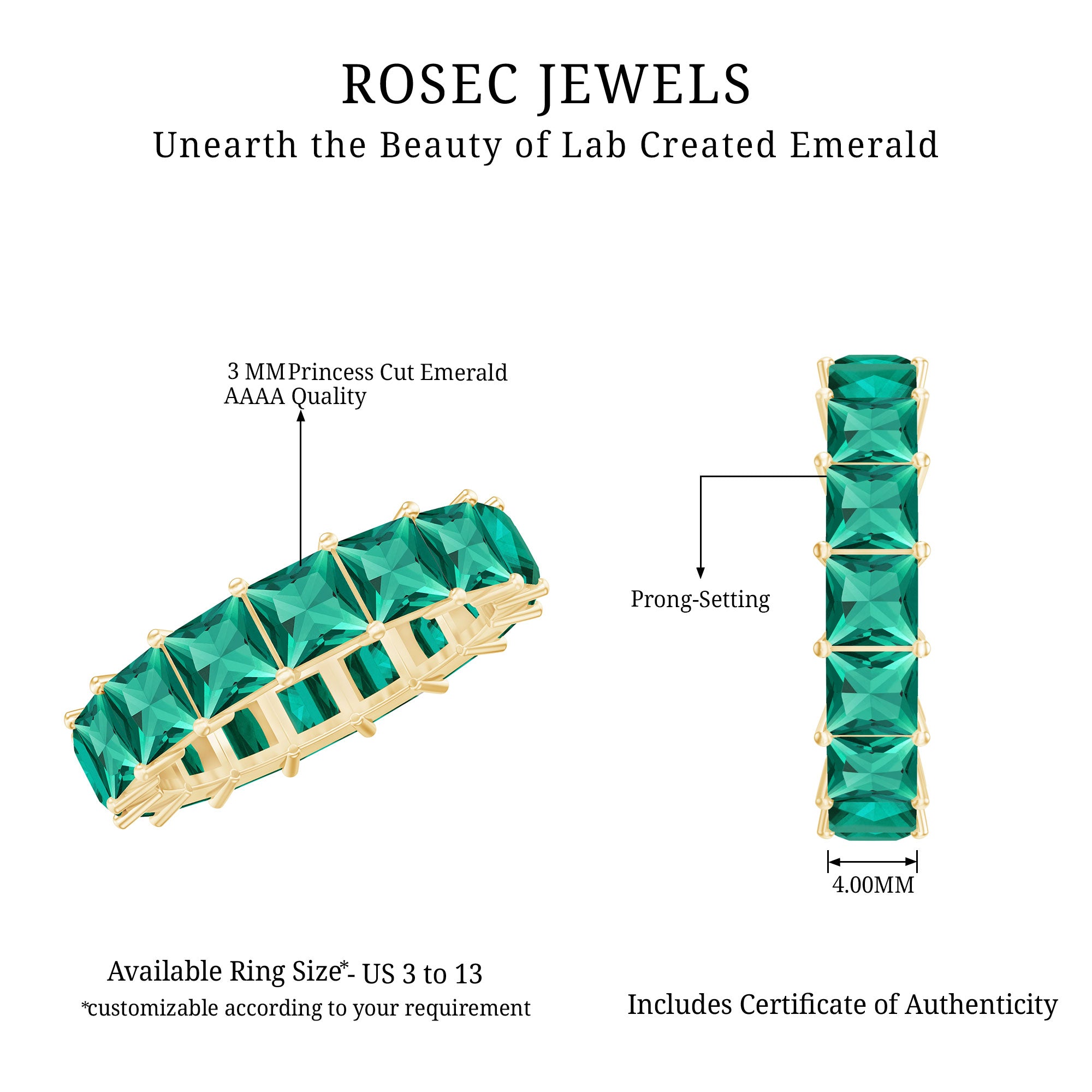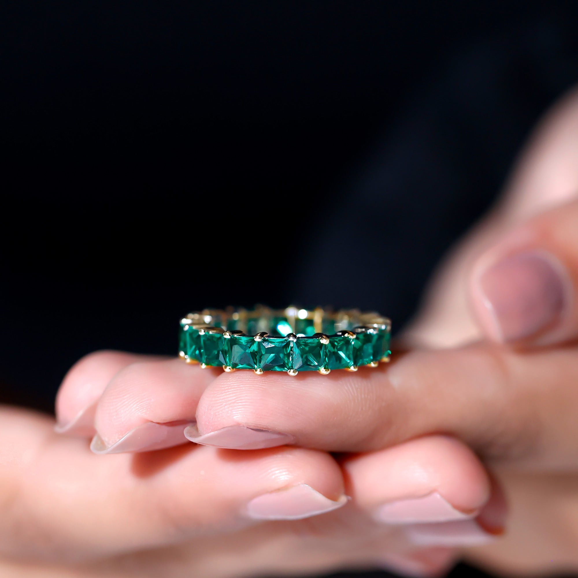 This Eternity Band is meticulously crafted with a modern design, rendering it a timeless choice for both casual and formal events. The Band Ring features princess-cut Lab Created emeralds that sparkle in a shared prong setting, creating an elegant and sophisticated appearance. Enhance your daily outfit with this exquisite Lab Created Emerald Ring. This Full Eternity Ring is understated yet showcases the vibrant green lab created emerald, ensuring she feels cherished. This Layering Ring can be worn solo for a minimalist aesthetic or stacked with other sleek rings for a more refined look. This Stackable Eternity Ring will be shipped to you in high-quality packaging, accompanied by a certificate of gemstone authenticity.
