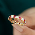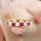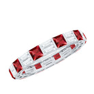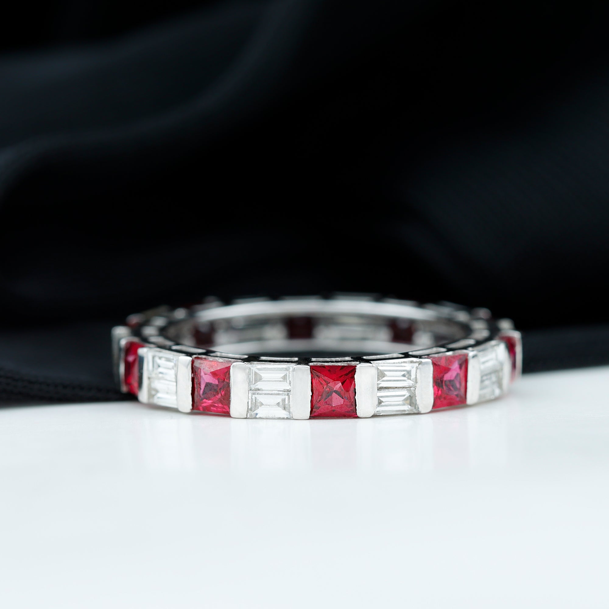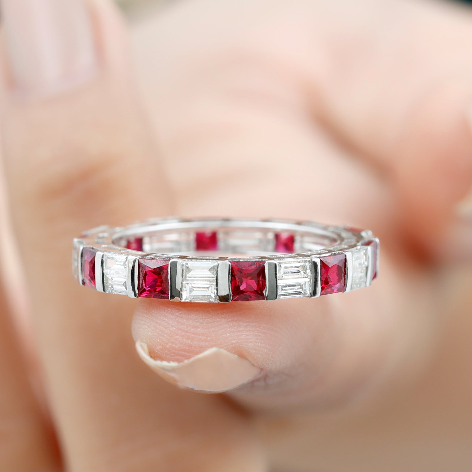 Elevate every occasion with this Ruby Eternity Ring, a perfect blend of timeless elegance and eternal shine. Embellished with princess cut created ruby and baguette shape moissanite meticulously set in bar setting on the eternity band. Ensuring your high durability and magnificent allure with the AAAA quality of these certified lab Ruby The ruby band has a total weight of 3.3 carats. Unleash your inner sparkle with the captivating hue of our ruby ring and make a statement every time you get dressed up.