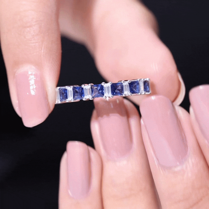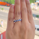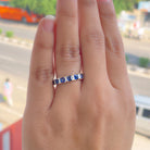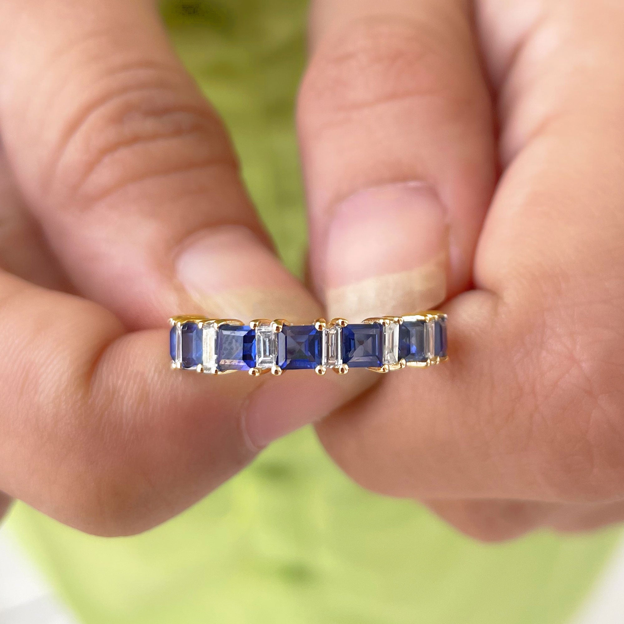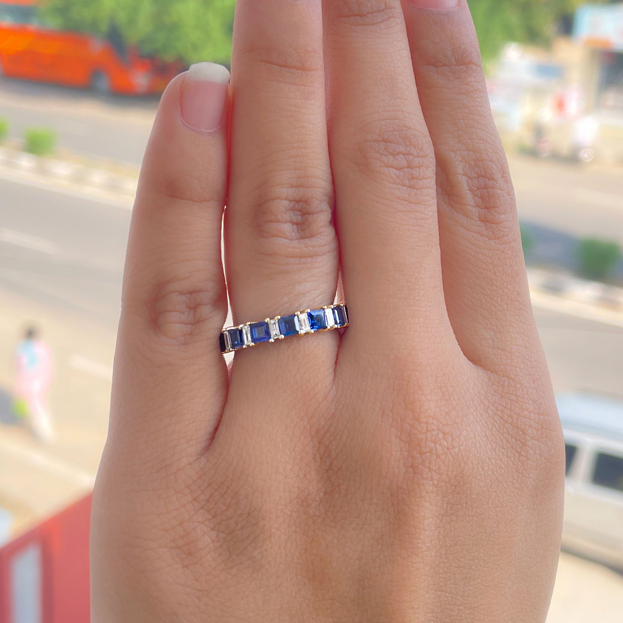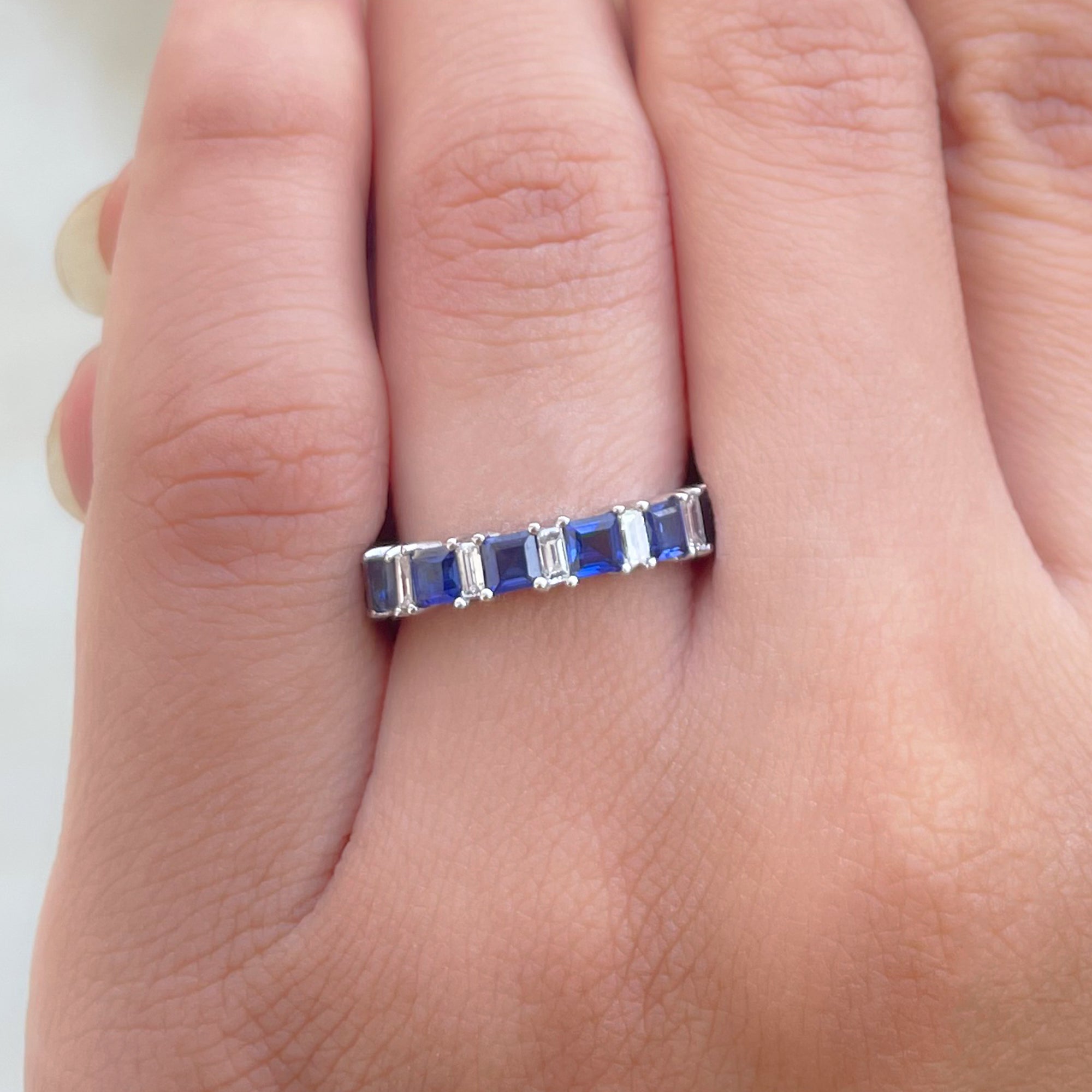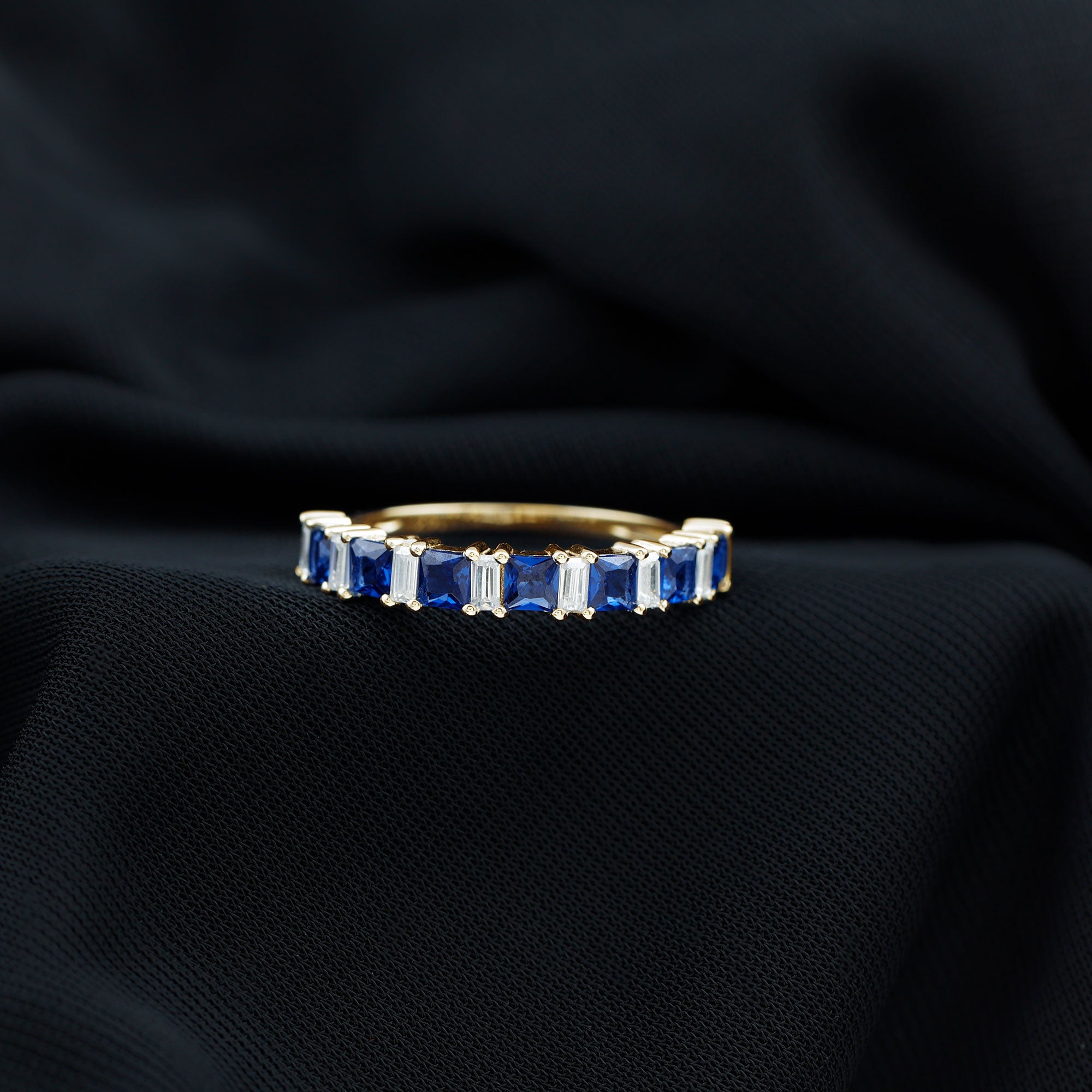 Make an impressive statement with this enchanting Half Eternity Ring, featuring Princess Cut Lab Created Blue Sapphires and Baguette Cut Diamond securely set in a prong setting. This Semi Eternity Ring exudes luxury and elegance, making it the perfect accessory to enhance your overall look. Add charm and allure to your appearance with this Lab Created Blue Sapphire Eternity Ring, a timeless piece that complements your style with grace and sophistication.