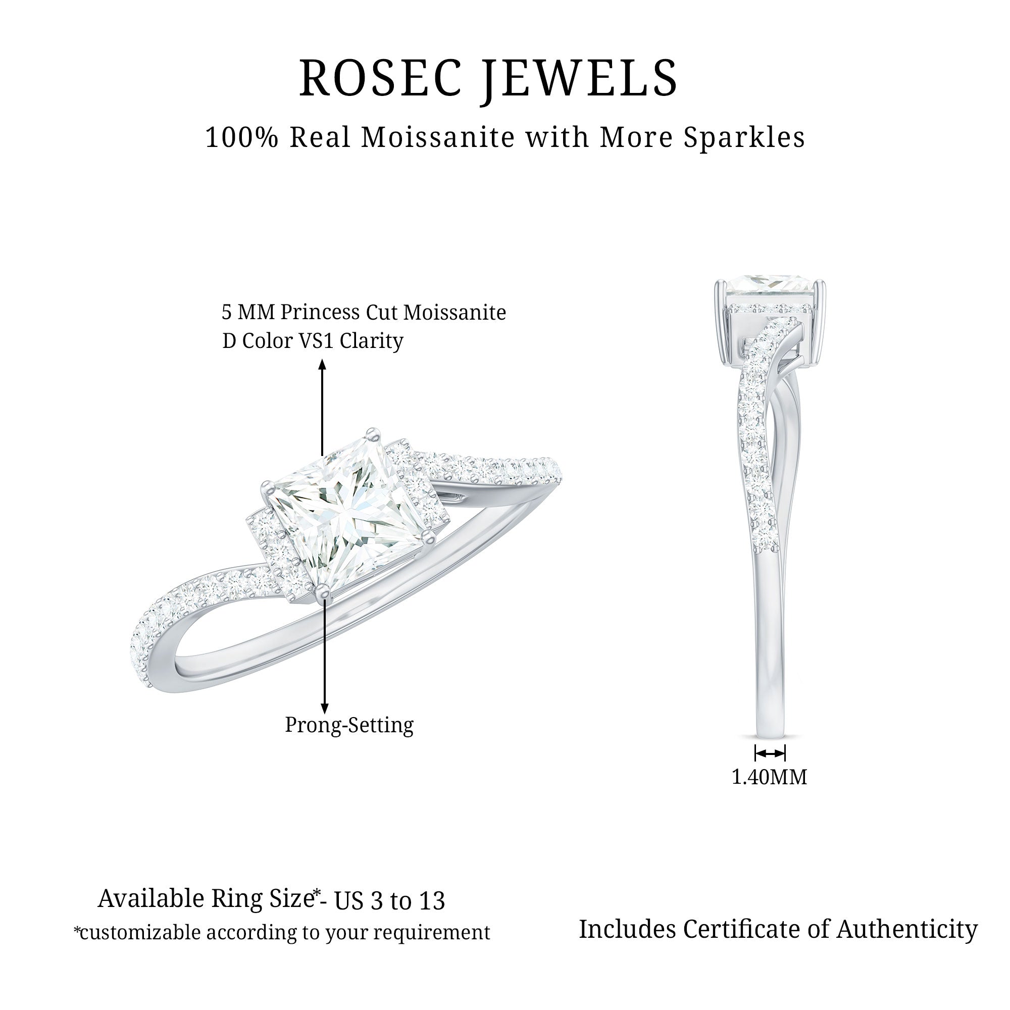 Timeless and chic, this Moissanite Engagement Ring perfectly embodies love and individuality. With a stunning 5 MM princess cut moissanite securely held in prong setting, it reflects light from every angle, creating a sparkle as bright as your smile. Made with D-VS1 quality moissanite, known for its incredible fire and clarity, each facet shines brilliantly, symbolizing a commitment made with both beauty and conscience. The sleek bypass shank, embellished with delicate moissanite accents, brings a modern touch and signifies two lives beautifully intertwining to move forward as one. This Bypass Engagement Ring is more than just jewelry, it celebrates connection and chemistry, crafted to honor your unique love story. Presented in a classy signature jewelry box and available in various sizes, this Half Carat Moissanite Ring for Women is designed to fit perfectly and make your special moment unforgettable. Its striking design ignites conversations and adds a sprinkle of magic to any proposal or milestone celebration.