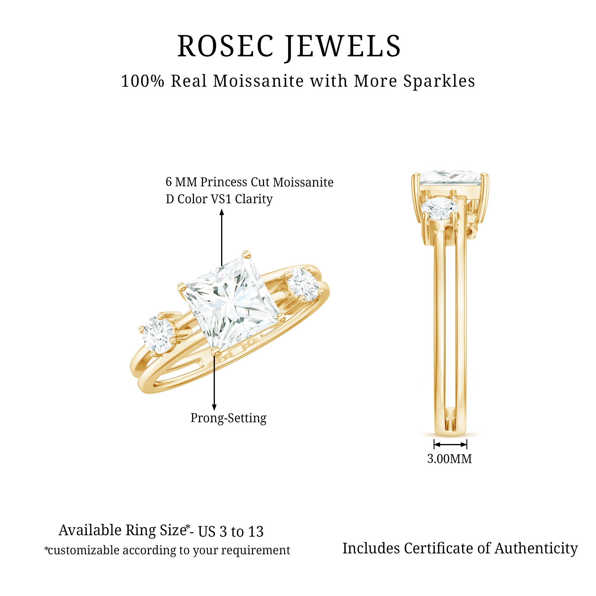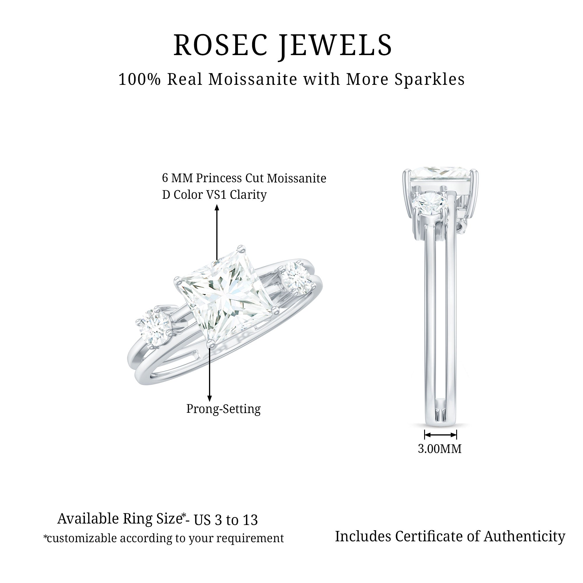 Discover the timeless elegance of our handcrafted Princess Cut Moissanite Engagement Ring, thoughtfully designed with exceptional craftsmanship and attention to detail. At the heart of this stunning piece sits a 6 MM princess cut moissanite, expertly prong set to showcase its sharp lines and brilliant sparkle. Flanked by two shimmering round moissanite side stones, the design comes to life on a sophisticated double band shank, offering a perfect blend of structure and radiance. Crafted by Rosec Jewels, this Square Engagement Ring features D-VS1 Quality moissanite stones, a sustainable and ethically conscious alternative known for its incredible fire, durability, and clarity. The sleek princess cut adds a modern flair, making this Solitaire Engagement Ring an ideal choice for someone who values both beauty and individuality. This Double Band Engagement Ring is customizable, allowing you to choose from a range of metal tones and metal types to match your personal style. Available in all standard US sizes, it ensures a flawless and comfortable fit for everyday wear or special occasions.