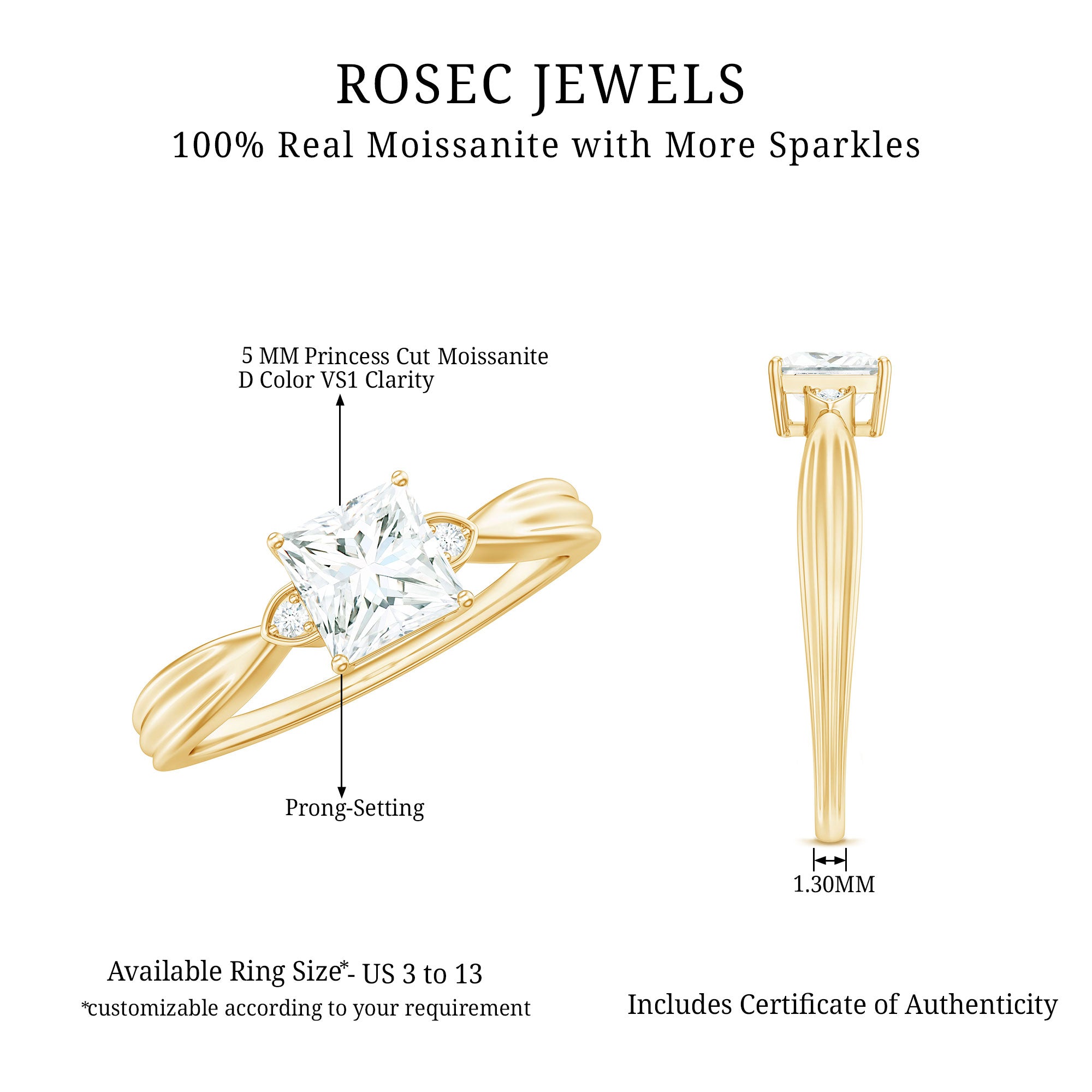 Make a striking statement with the Classic Solitaire Ring, designed to steal the spotlight. This exquisite piece features a 5mm Princess Cut Moissanite gemstone, delicately held in a prong setting. The pinched shank design adds a touch of uniqueness and boldness to the ring, making it a captivating choice. Radiating elegance, the round Moissanite accents on the shank enhance the overall allure and glamour of the piece. With a certified total weight of 3/4 Carat, the ring boasts a stunning D Color and VS1 Clarity, ensuring exceptional quality. Rest assured, all our gemstones undergo a rigorous quality check and come with certifications. Elevate your style with this Certified Moissanite Promise Ring, a true symbol of beauty and excellence.