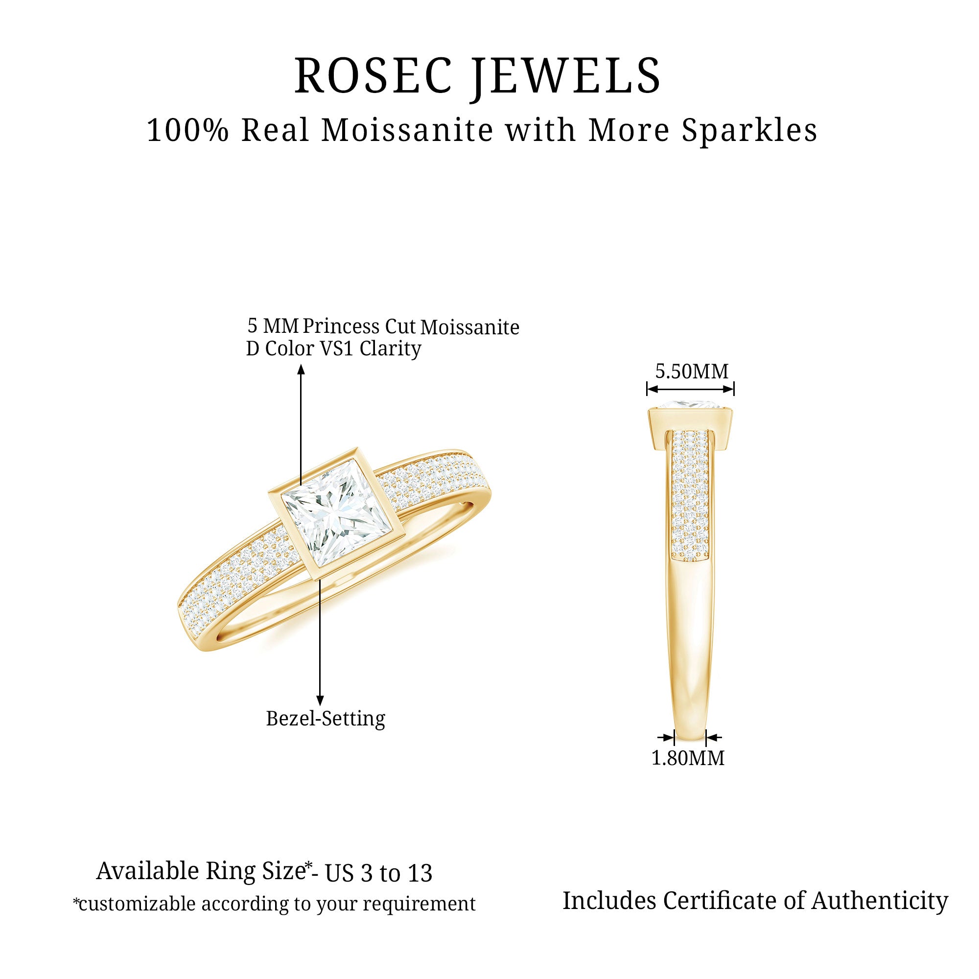 Made to celebrate your most special moments, this Square Engagement Ring shines with modern elegance. At its center is a dazzling 5 MM princess cut moissanite stone, known for its bold brilliance and eye-catching sparkle. Surrounding the center stone are beautiful pave set side moissanites, carefully selected for their D color and VS1 clarity, designed to catch the light from every angle and celebrate your love with unmatched radiance. The princess cut brings a fresh and stylish twist to a classic shape, while the sleek band adds a graceful touch that pairs perfectly with any look. Delivered in a stylish jewelry box, this Princess Cut Moissanite Ring is ready to create unforgettable memories, whether during a surprise proposal, anniversary celebration, or any special occasion that deserves a little extra sparkle. Expertly crafted, this Moissanite Engagement Ring features side stones that perfectly complement the centerpiece, adding subtle sophistication and enhancing its overall beauty. It is more than just a ring, it is a timeless symbol of your love story, crafted to be treasured for a lifetime. Let this stunning Side Stone Engagement Ring be the shining mark of your shared journey, a piece that will glow with your love for years to come.
