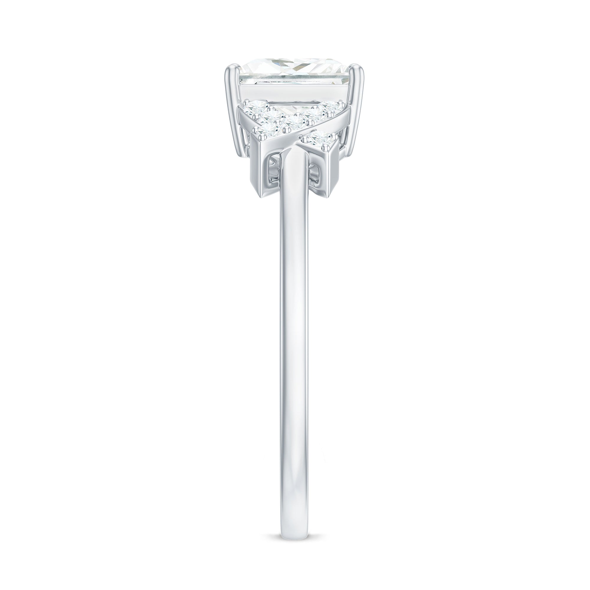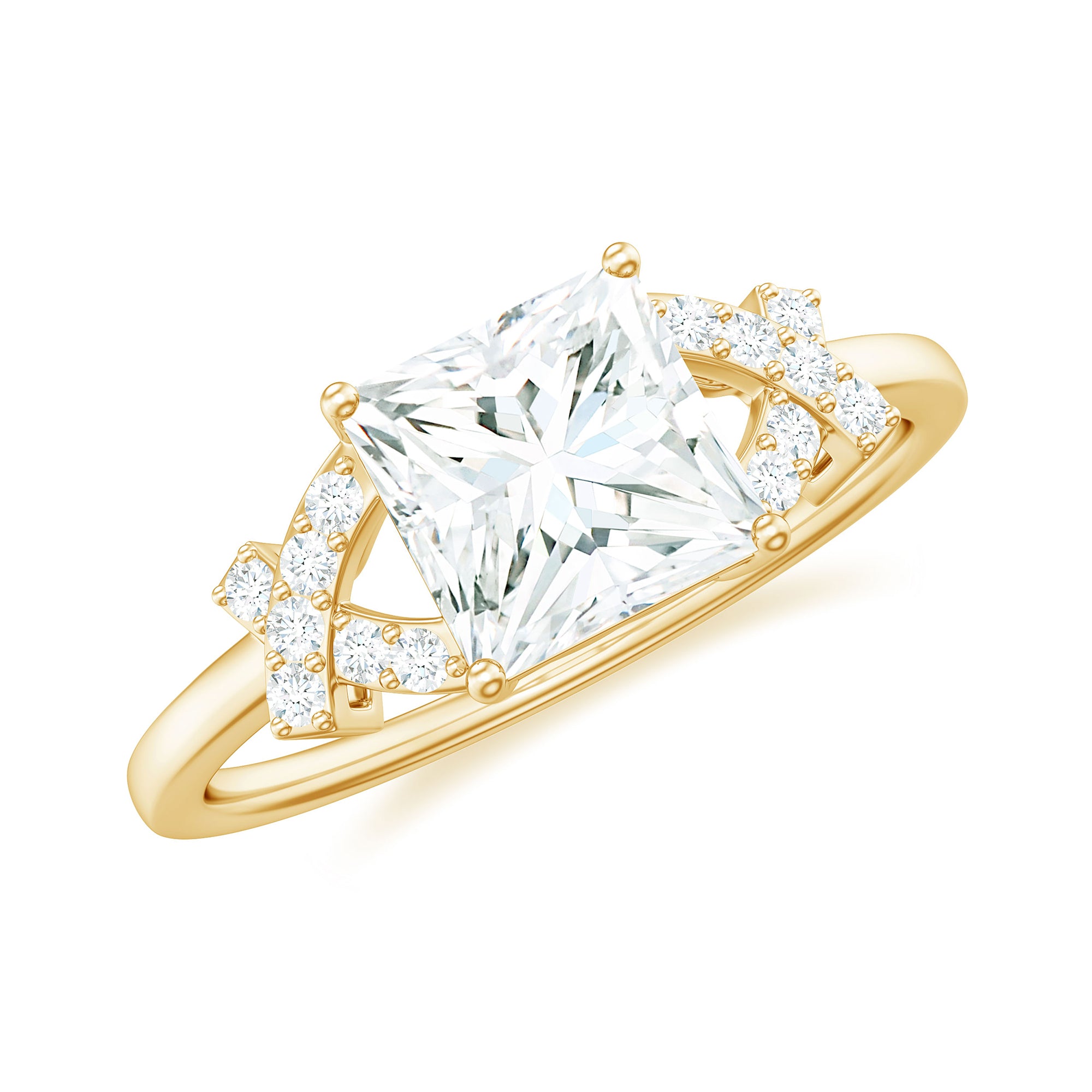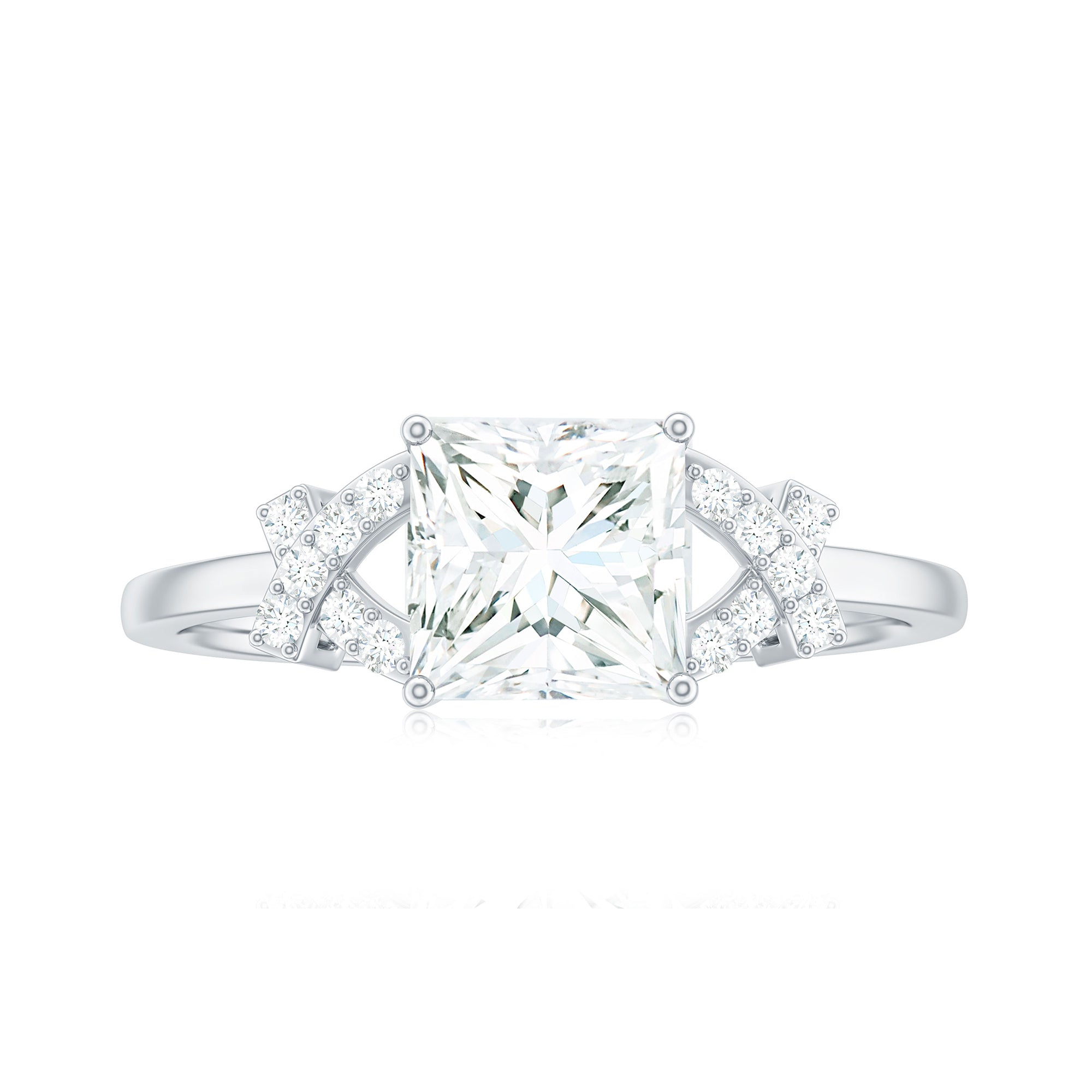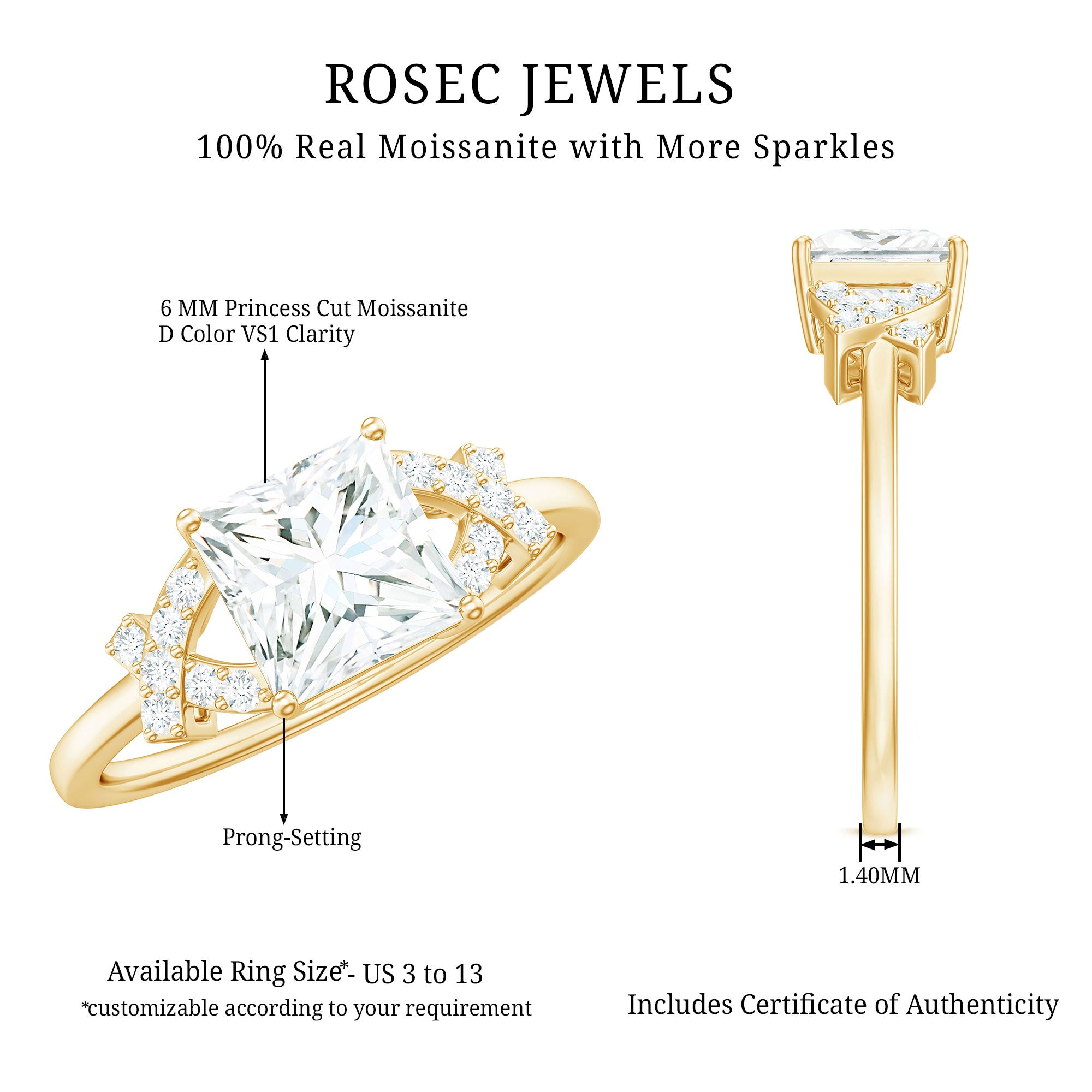 Enchant your beloved with this exquisite Solitaire Engagement Ring, which serves as a symbol of your lasting love and commitment. Beautifully designed, this Fine Engagement Ring showcases a 6X8 MM Princess Cut Moissanite set in a Prong Setting, which is the focal point of the piece. Representing everlasting love and the union of two souls, the enchanting Split Shank is embellished with delicate round Moissanite gemstones set in a cross style, creating a stunning appearance. Meticulously designed with attention to detail, this Princess Engagement Ring can be customized in a variety of precious metals to suit her individual style. Whether you are preparing for a meaningful proposal or commemorating a significant occasion, this Square Engagement Ring is sure to become a treasured memento for many years. Elegant, affordably priced, and ethically sourced, this Princess Cut Moissanite Ring symbolizes lasting commitment, modern romance, and a radiance that is everlasting.