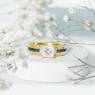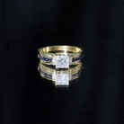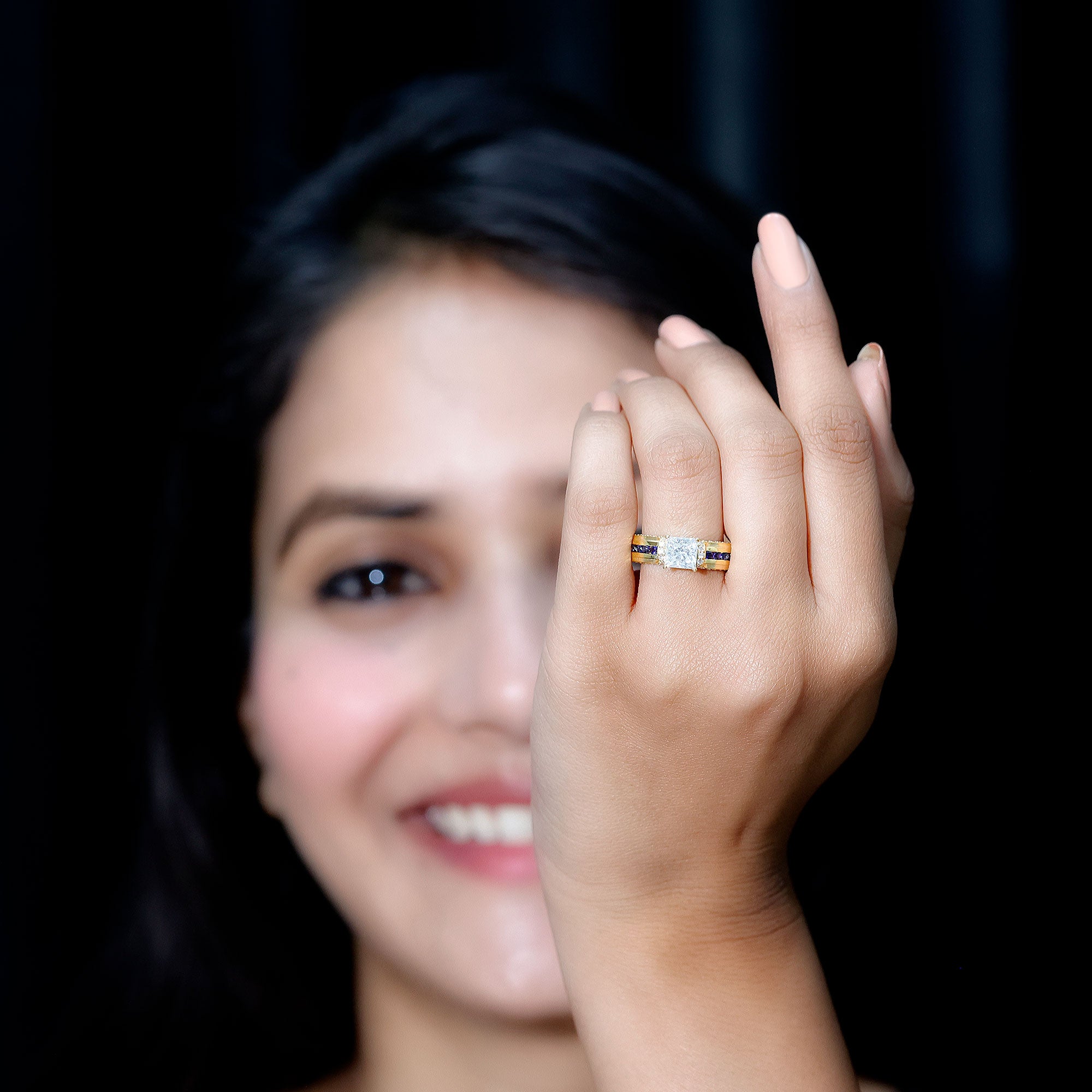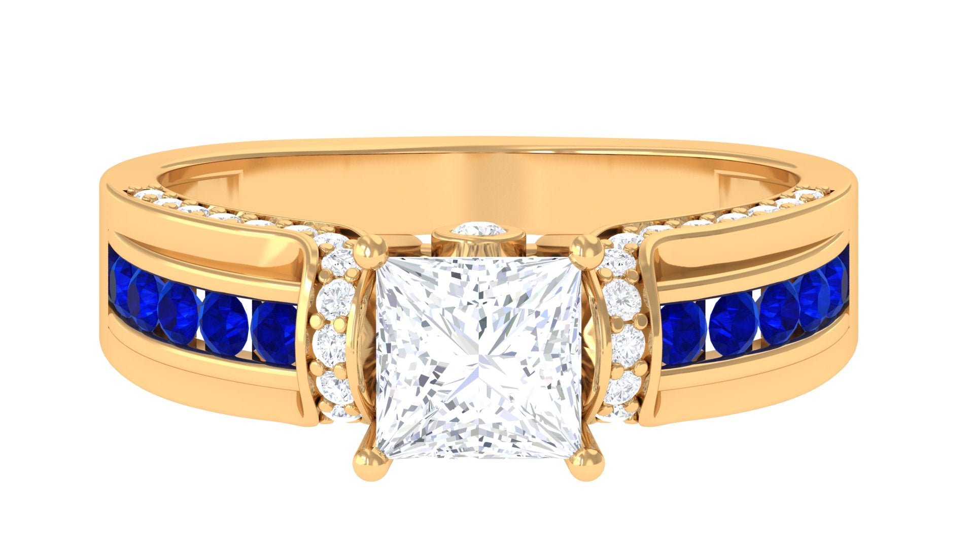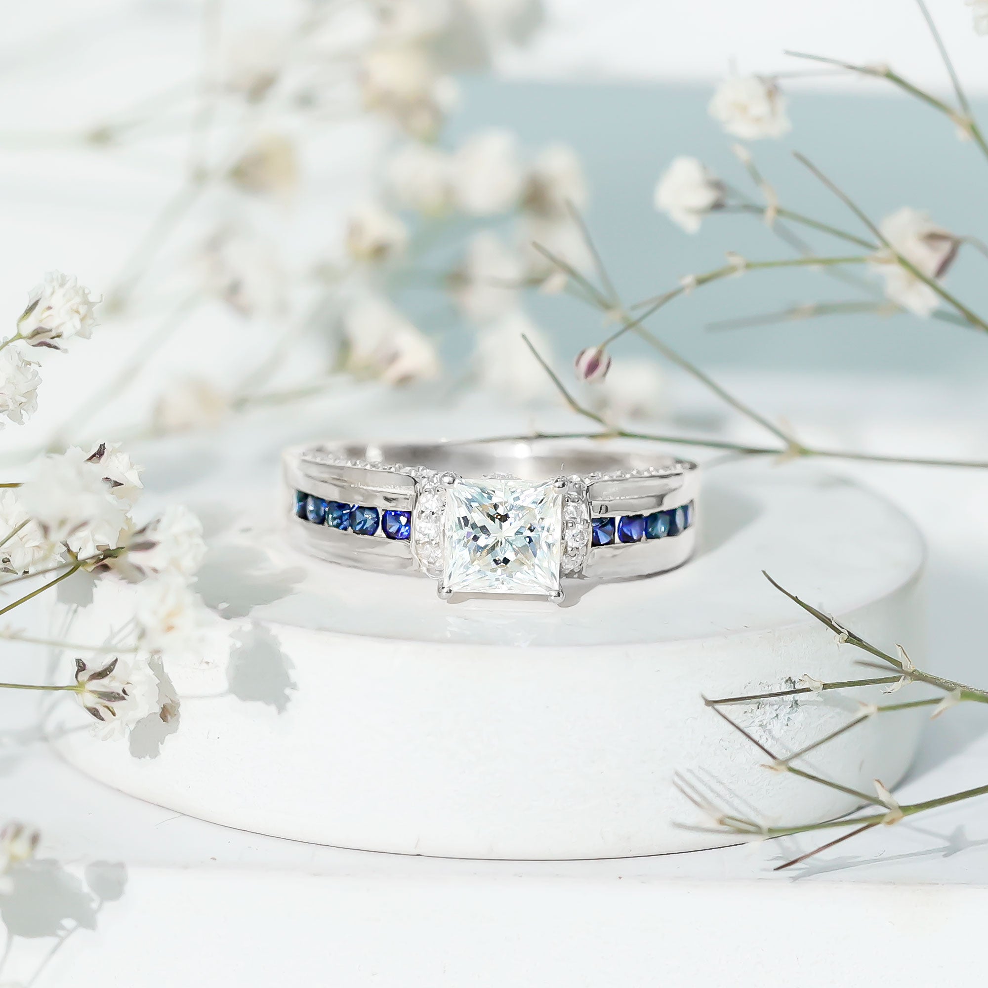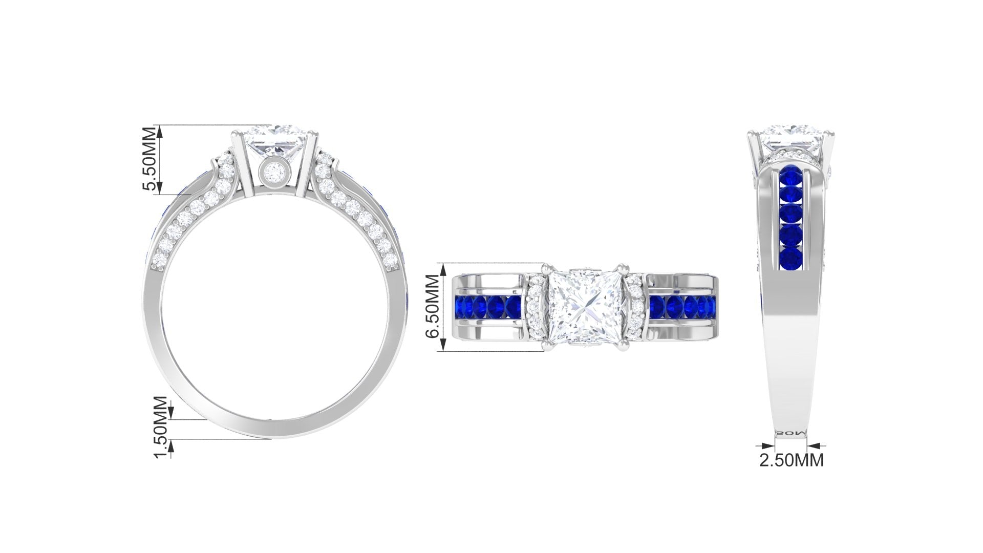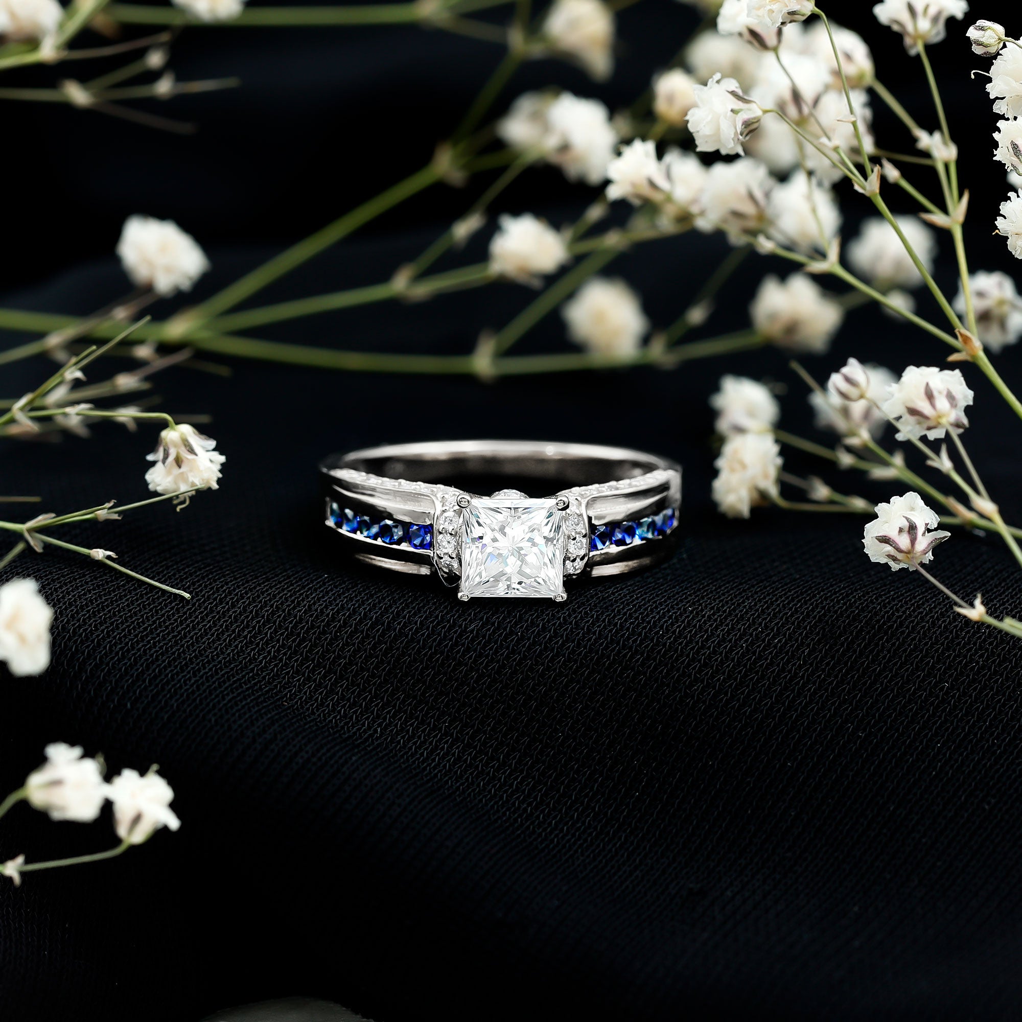 Grab this Statement Ring for Engagement and make your big day an unforgettable one. The Unique Engagement Ring is designed with an 5.50 MM Princess Cut Moissanite centered in Prong Setting and flanked with petite Round Lab Created Blue Sapphire Side Stones in Channel Setting. The Gallery and Wide Shank is accentuated with Round Moissanites. The exclusive designing makes it a perfect Engagement Ring for Men and Women both.