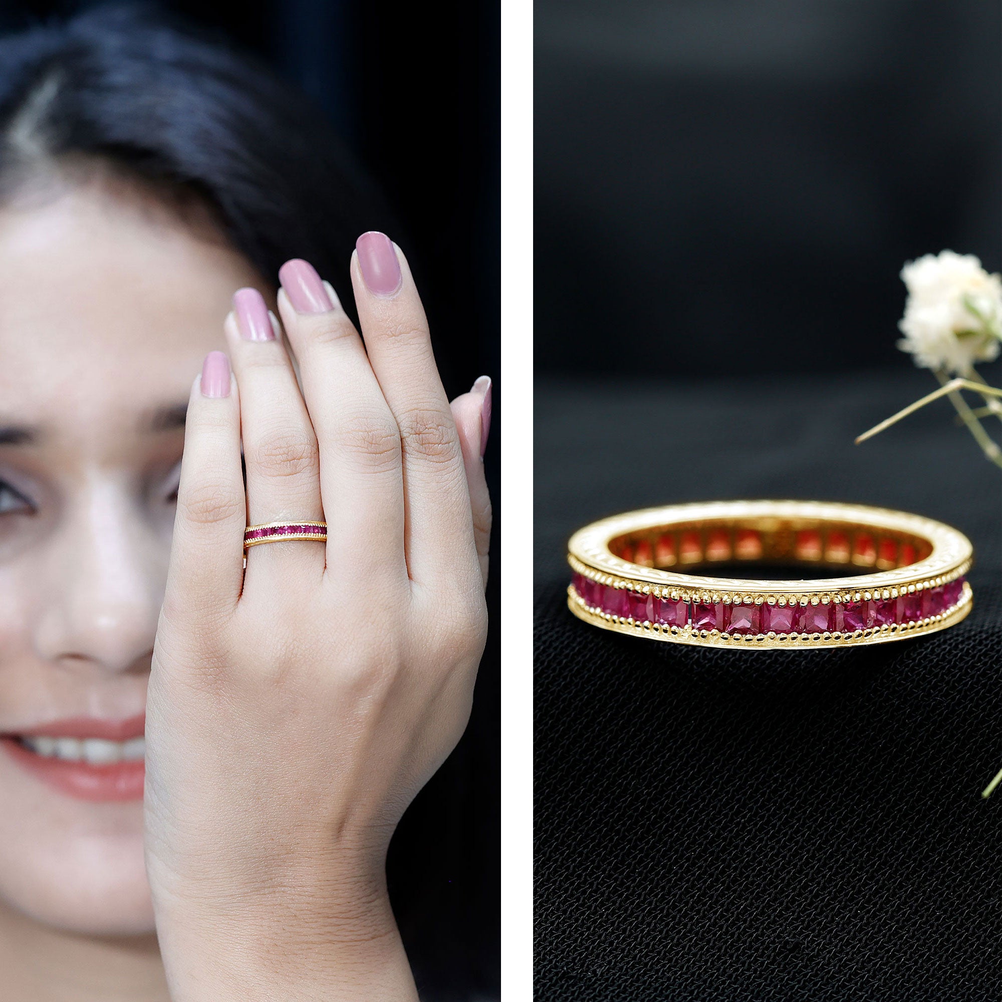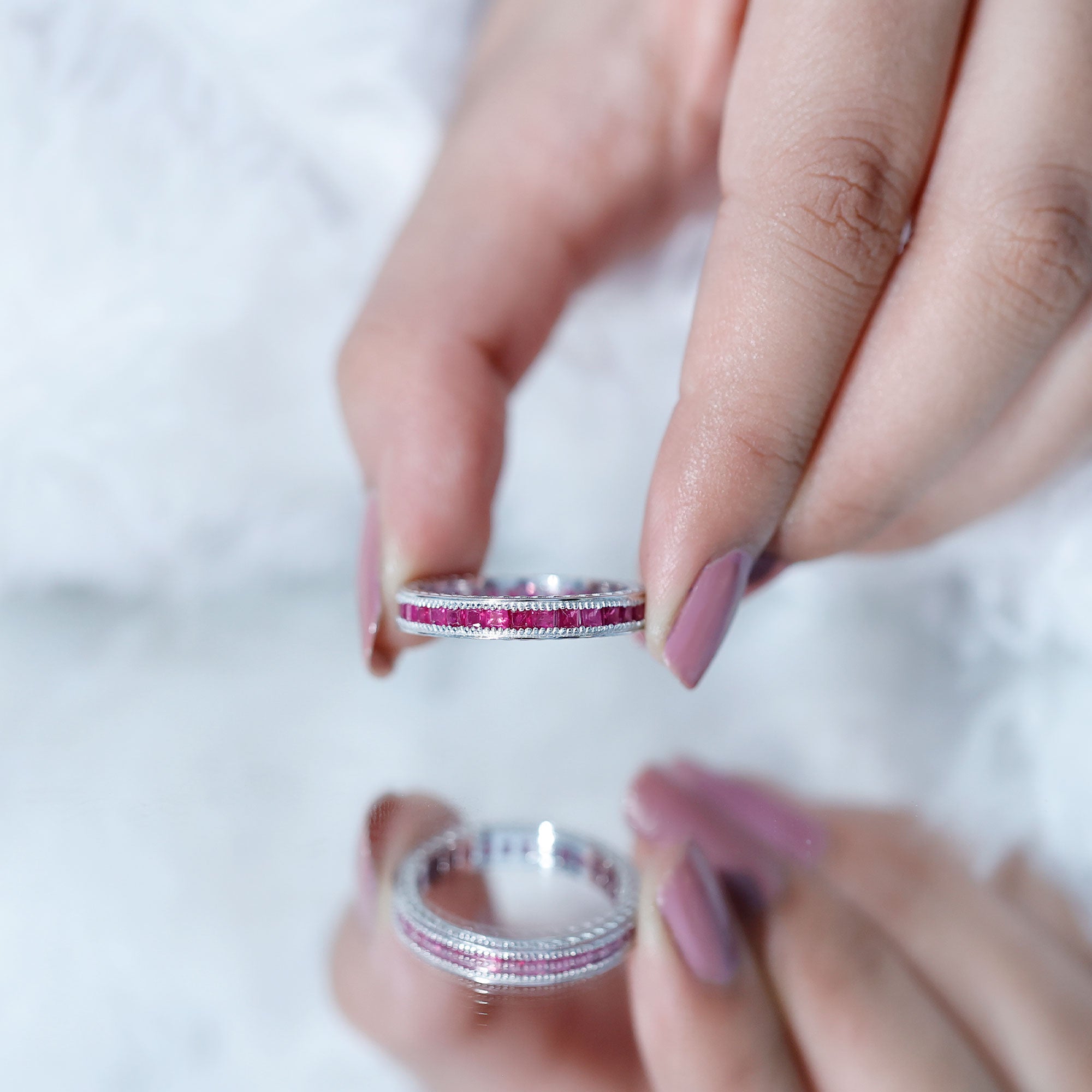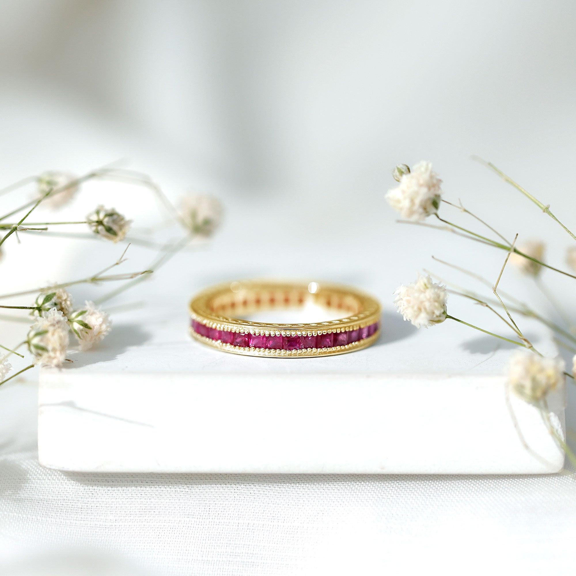 Express your deepest love with our Eternity Ring adorned with Princess Cut Ruby gems in a channel setting. Timeless elegance for eternal devotion.