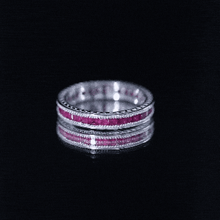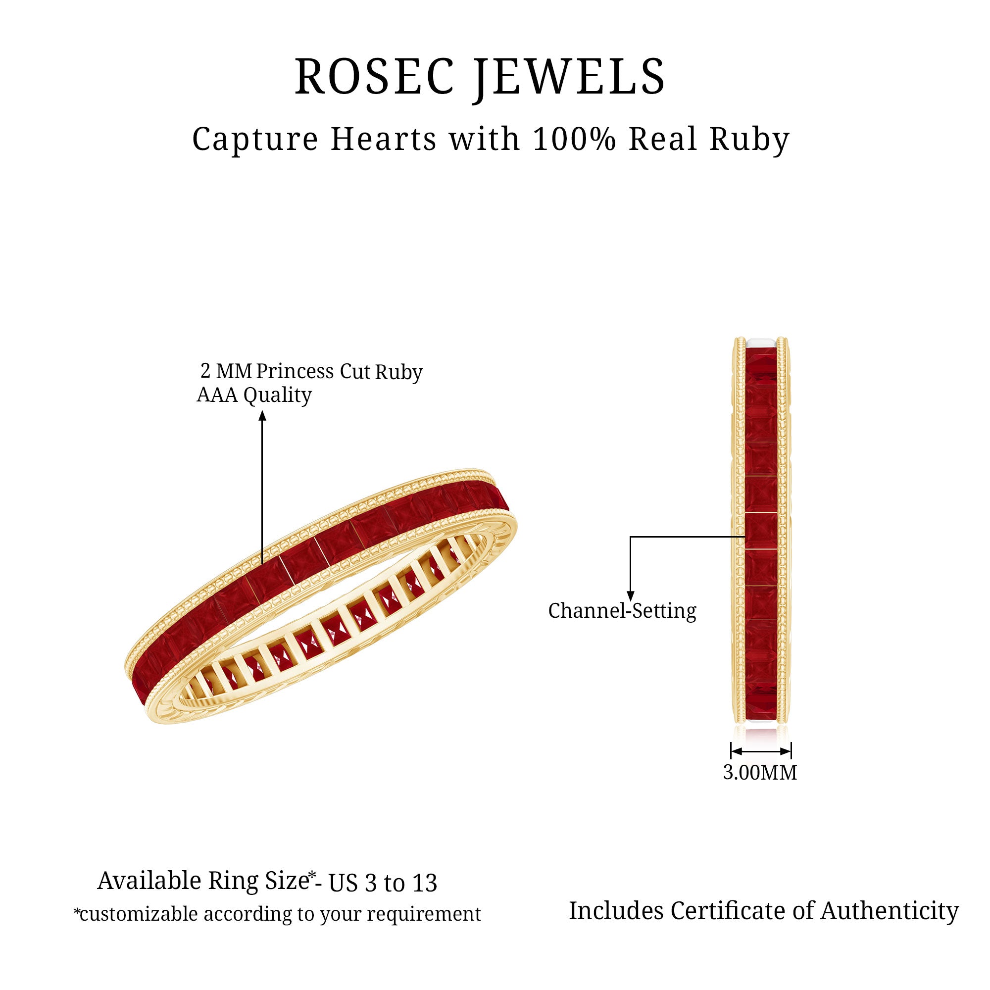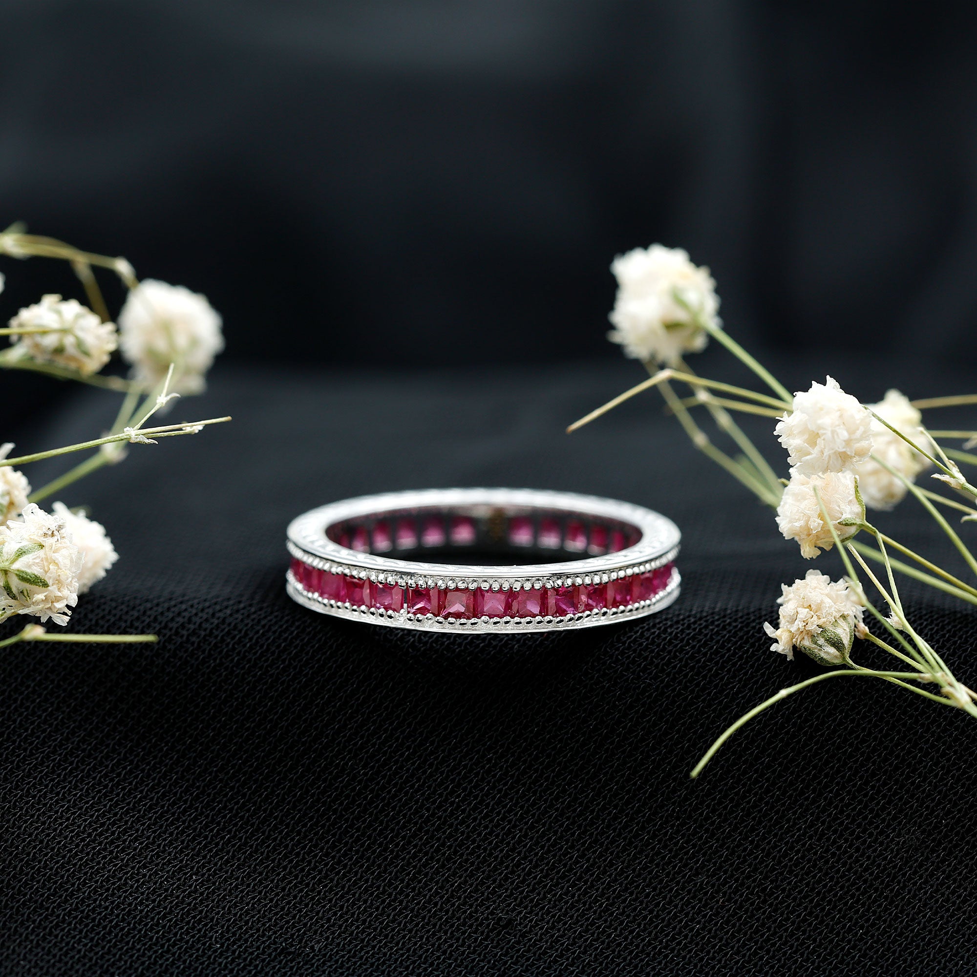 Express your deepest love with our Eternity Ring adorned with Princess Cut Ruby gems in a channel setting. Timeless elegance for eternal devotion.
