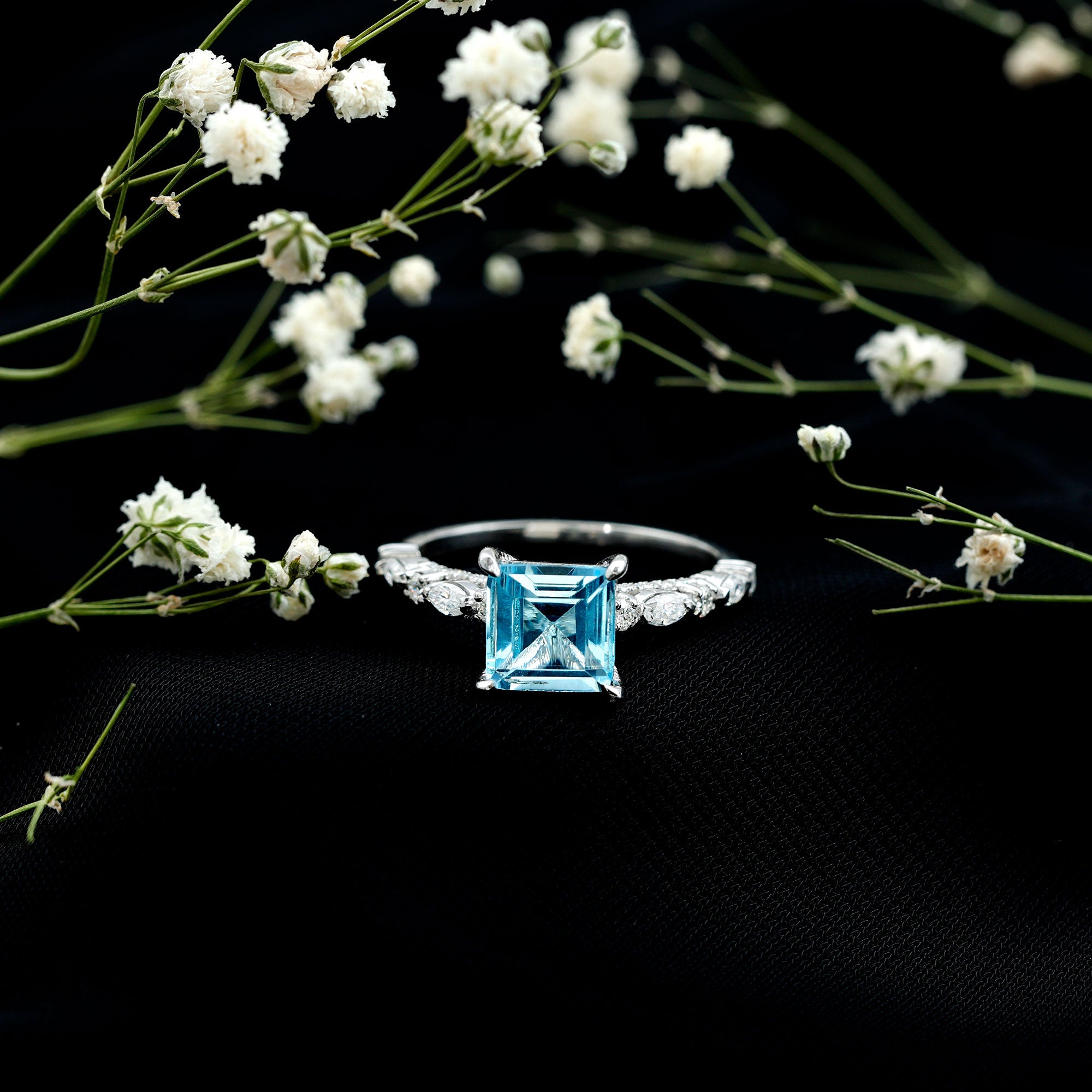 Seal your most precious yes moment with an unequivocal declaration of love through this Engagement Ring. It takes center stage with a dazzling Princess Cut Sky Blue Topaz, securely cradled in a Claw Setting, while the surprise shank sparkles with additional Round Moissanite stones for added allure. The shank is adorned with both Marquise and Round Moissanite stones. Whether for your beloved lover, girlfriend, wife, fiancée, mother, daughter, or cherished friend, this Sky Blue Topaz Ring is a heartfelt gesture to make her feel truly extraordinary and cherished.