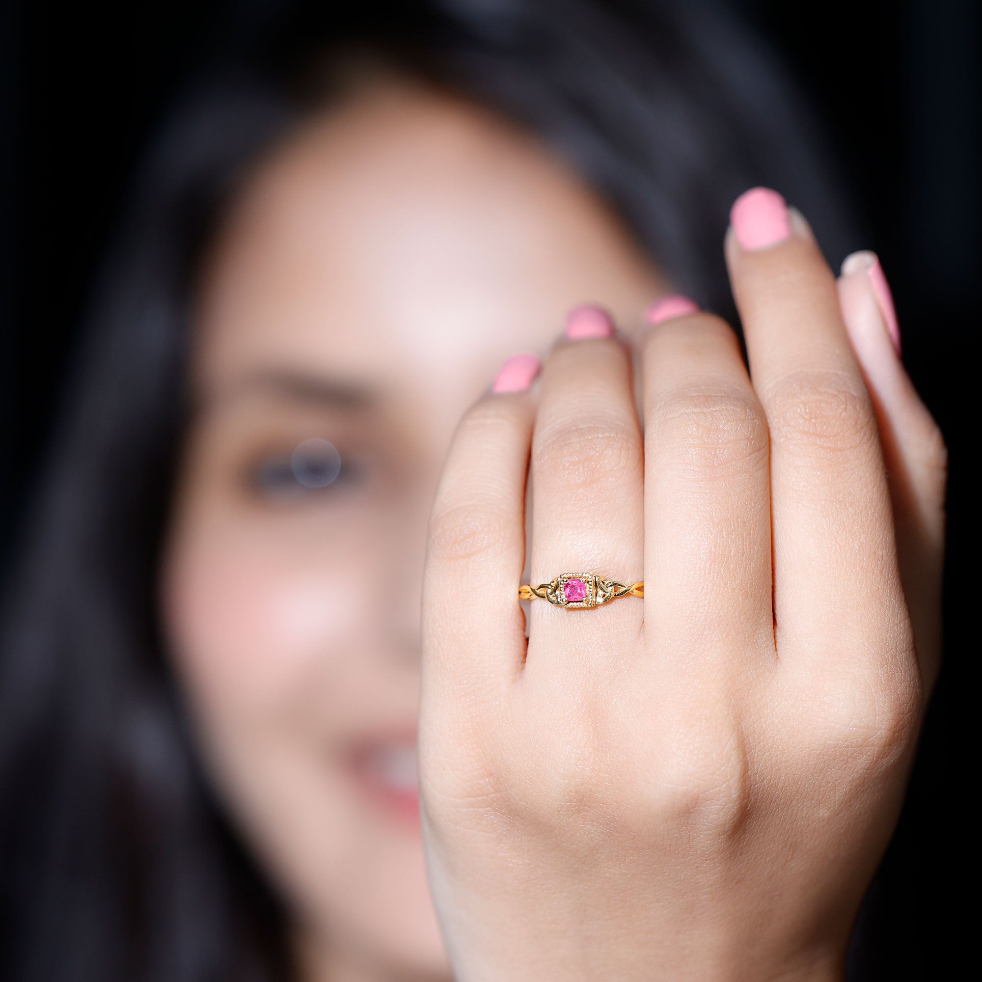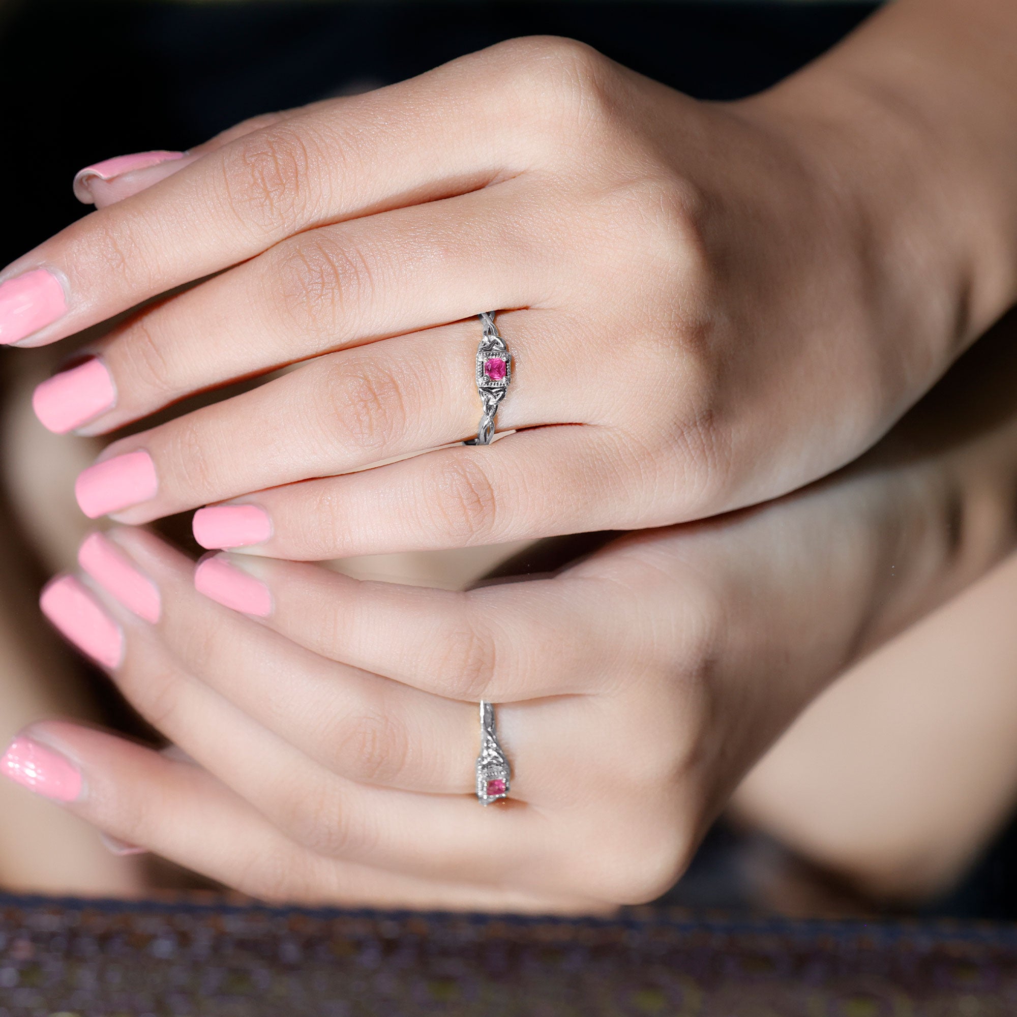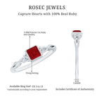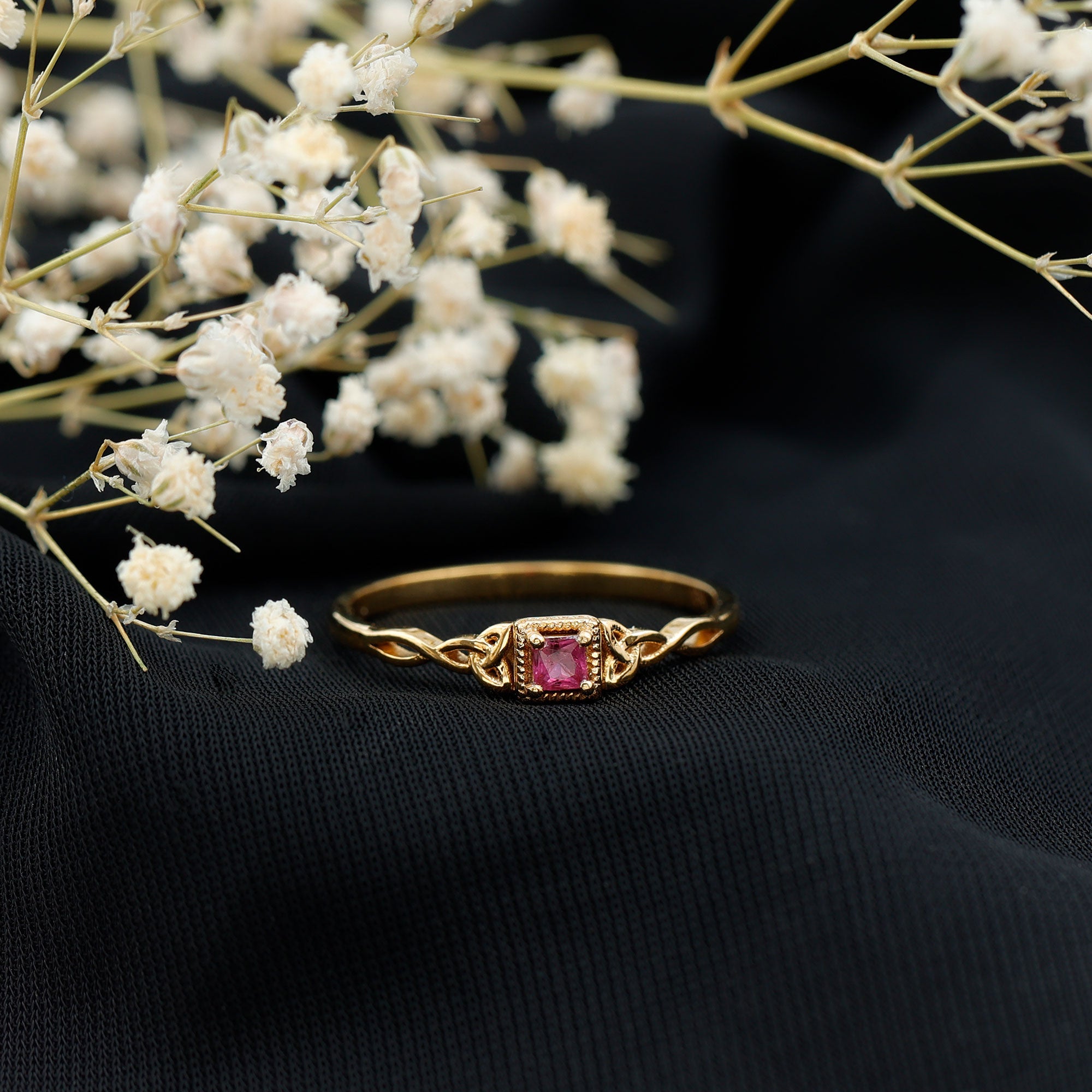 Eternally stylish this Ruby Solitaire Ring offers the sweetest symbol of your love. Show her you are ready to commit forever with this shimmering Ruby Promise Ring for Her. A stunning blend of timeless elegance and profound symbolism this exquisite piece features a dazzling Princess Cut Ruby in Prong Setting, renowned for its vibrant red hue and exceptional brilliance. Surrounding the gemstone is the rope frame that intricate Celtic knot work on the sides which is gracefully crafted into the band, representing an unbreakable bond and eternal commitment. The interwoven patterns of the knot are a beautiful tribute to endless love and unity, making this Celtic Ruby Ring a meaningful choice for any promise or special occasion.