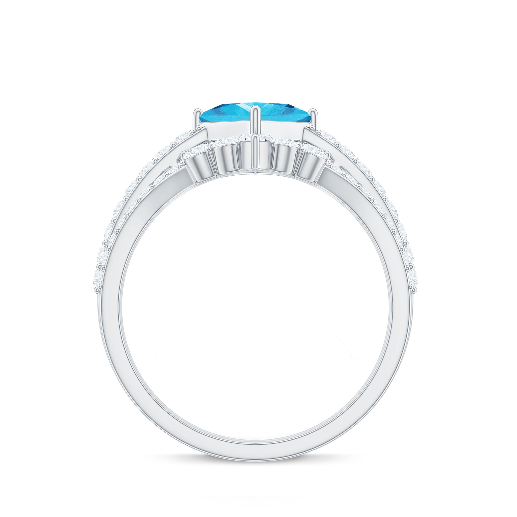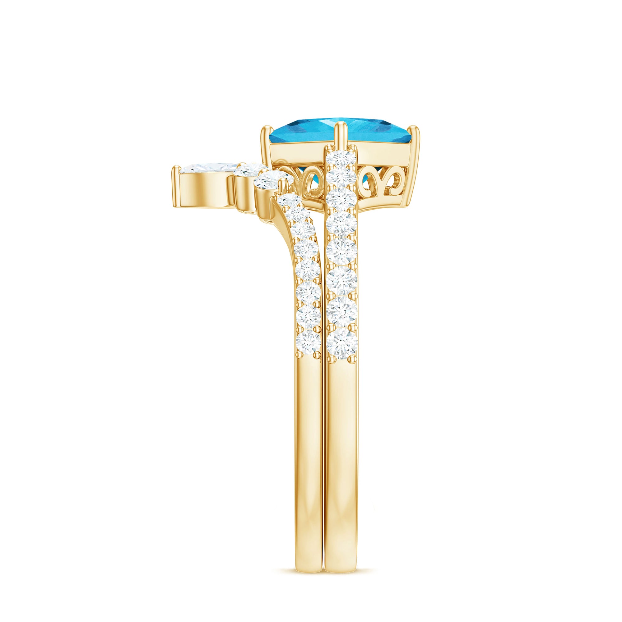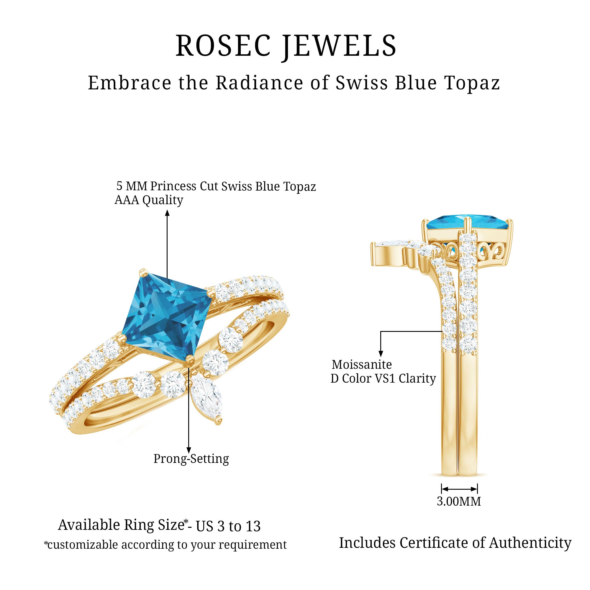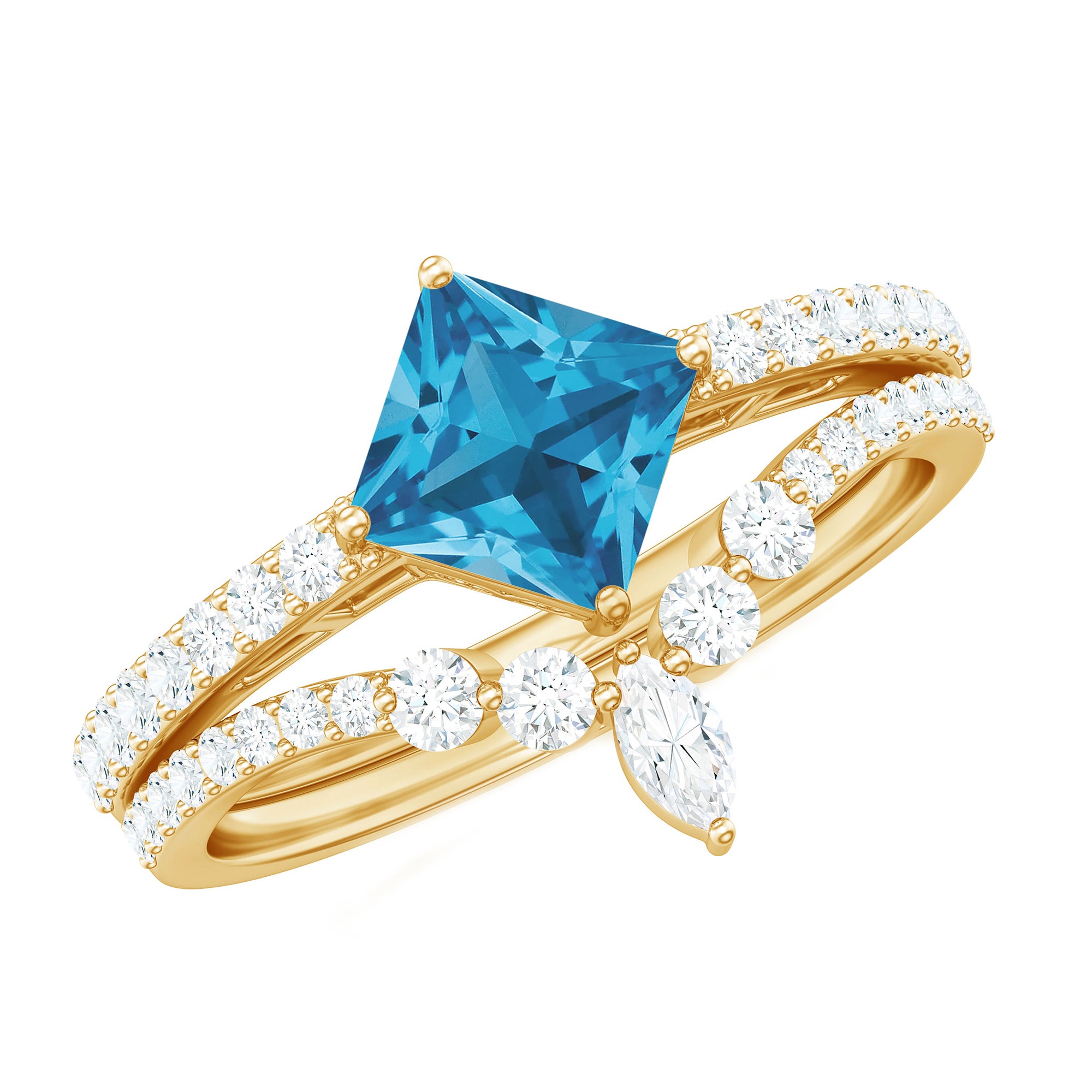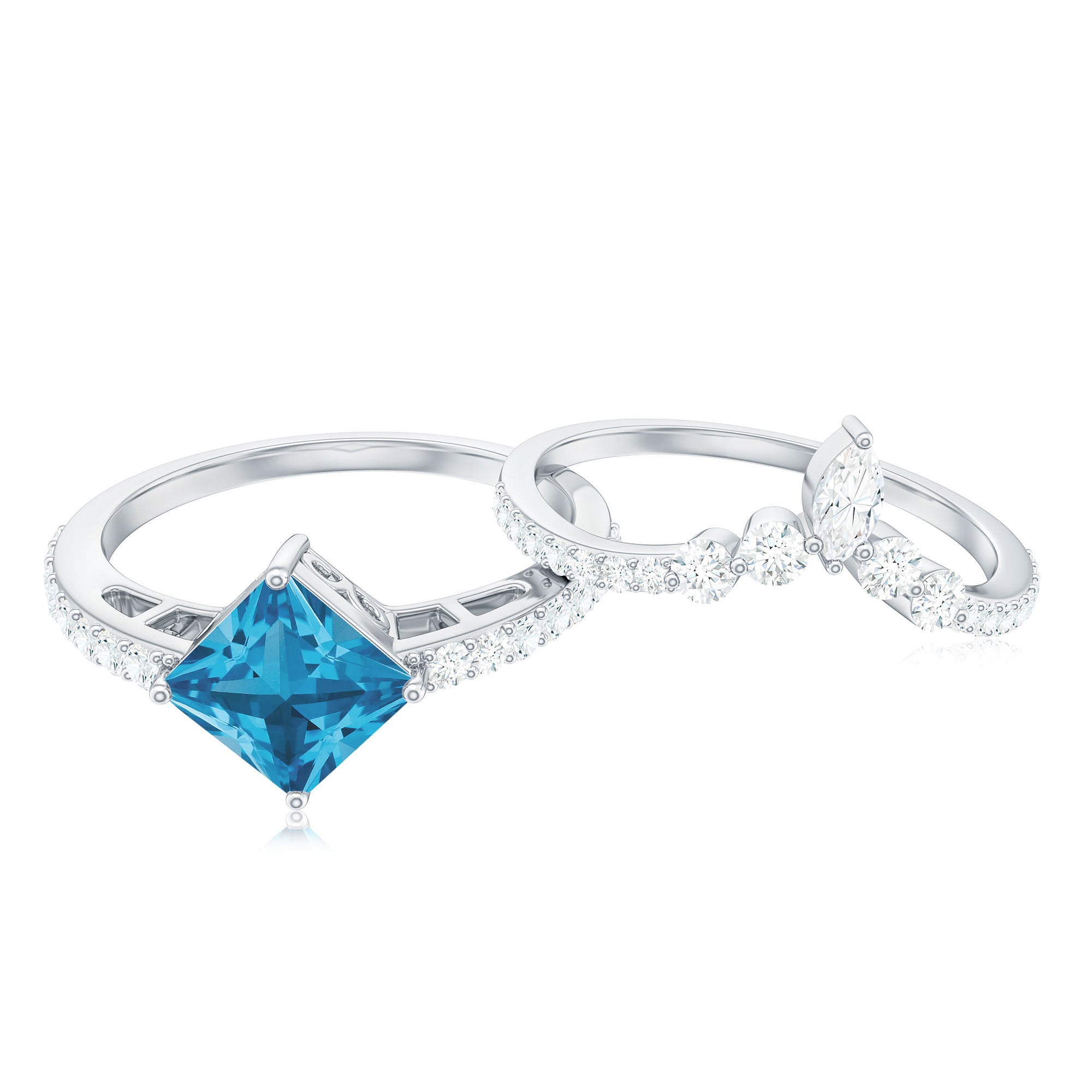 Princess Cut Solitaire Swiss Blue Topaz Designer Ring Set with Moissanite
