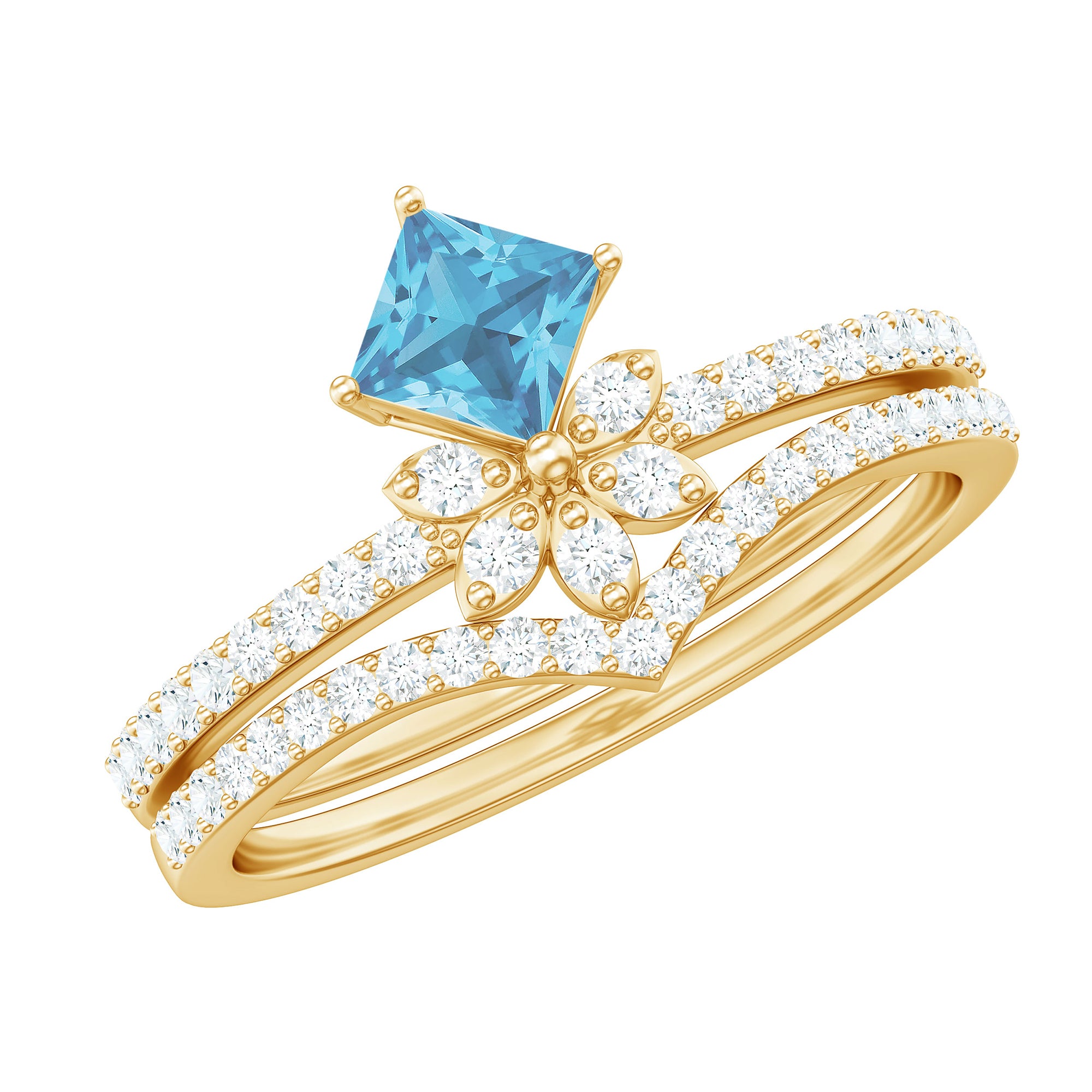 Princess Cut Swiss Blue Topaz and Diamond Flower Ring Set