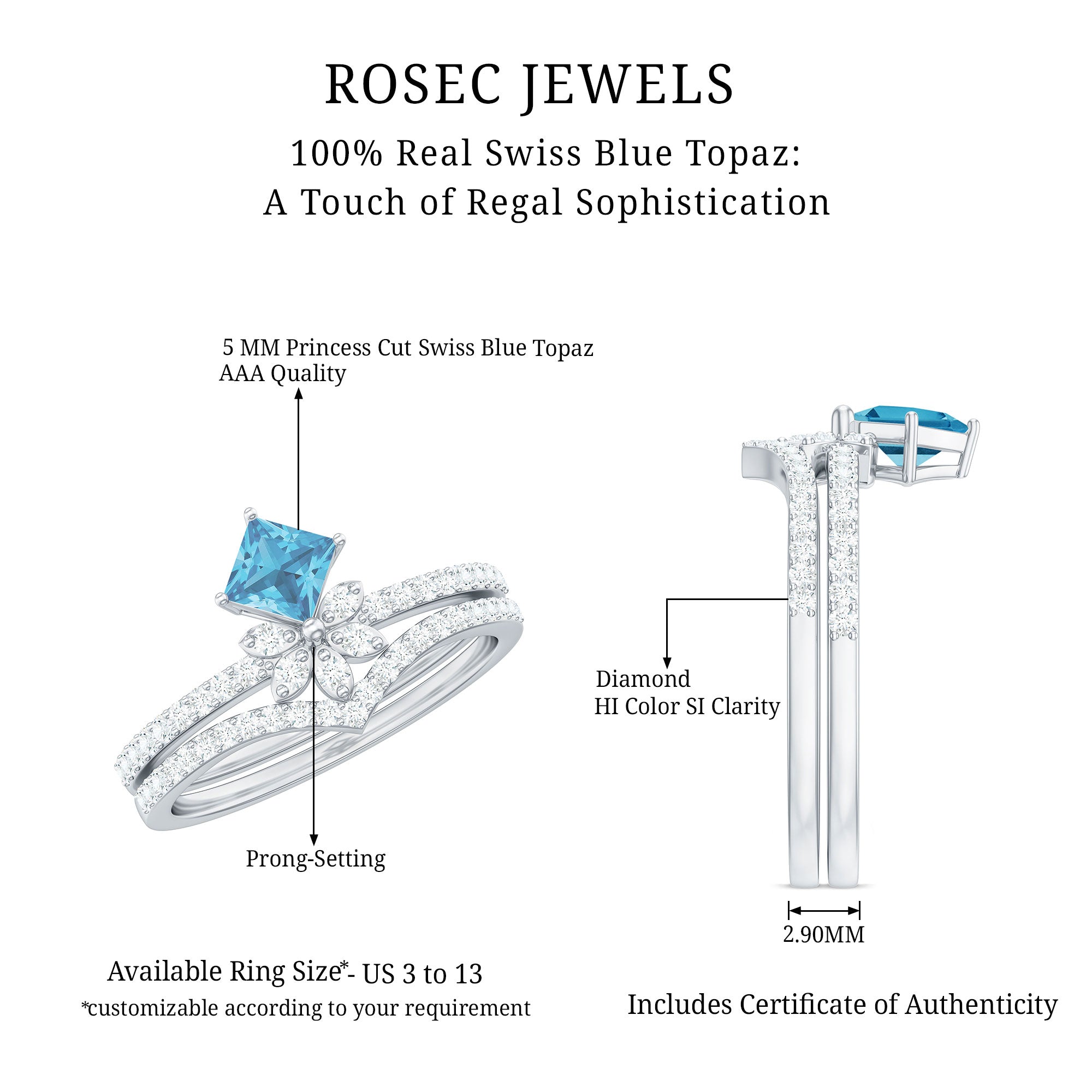 Beautiful and delicate, the Floral Ring Set is decorated with Princess Cut Swiss Blue Topaz secured by Prong Setting and Round Shape Diamonds will captivate everyones attention. • The Swiss Blue Topaz Ring Set is crafted with Hallmarked Metal. Make your bond stronger by presenting her with this Ring Set as a token of love.
