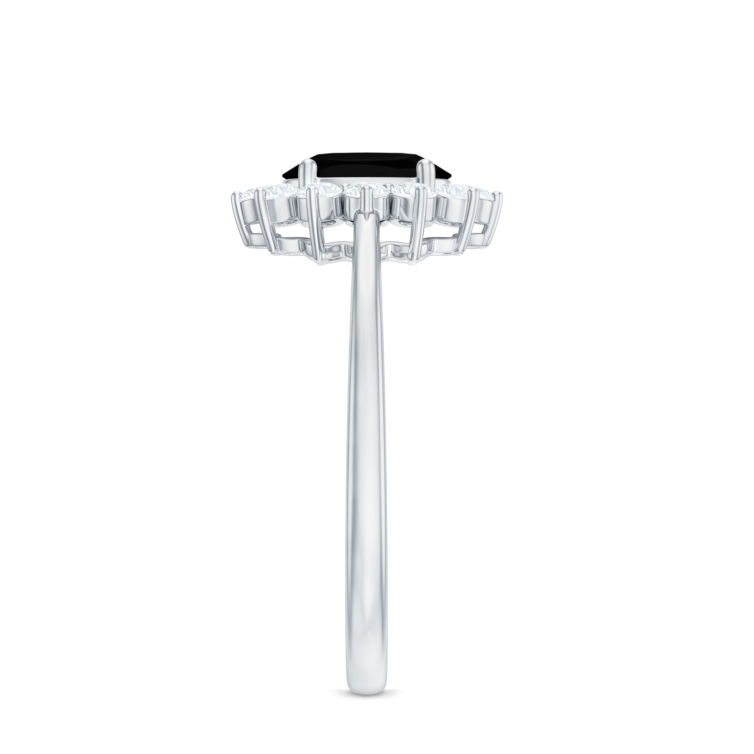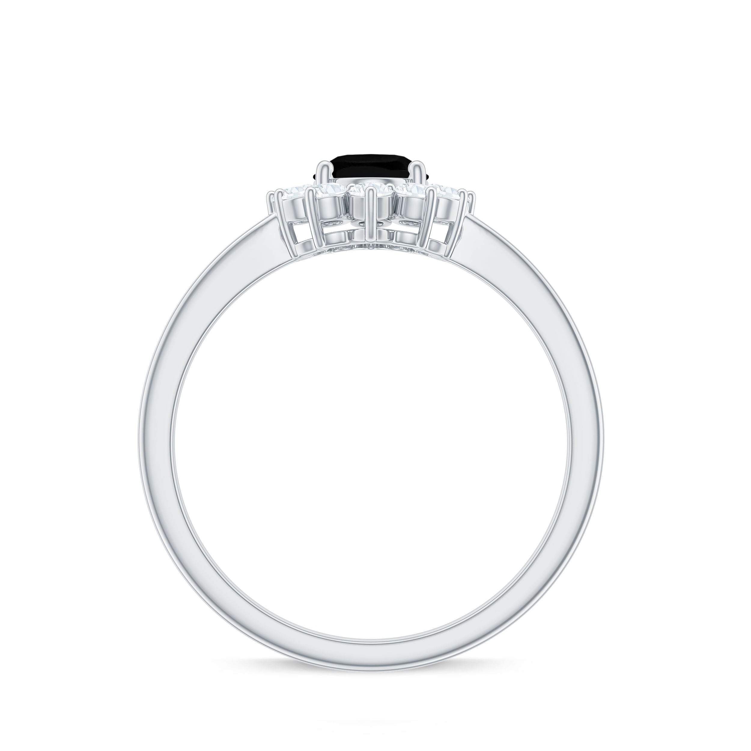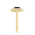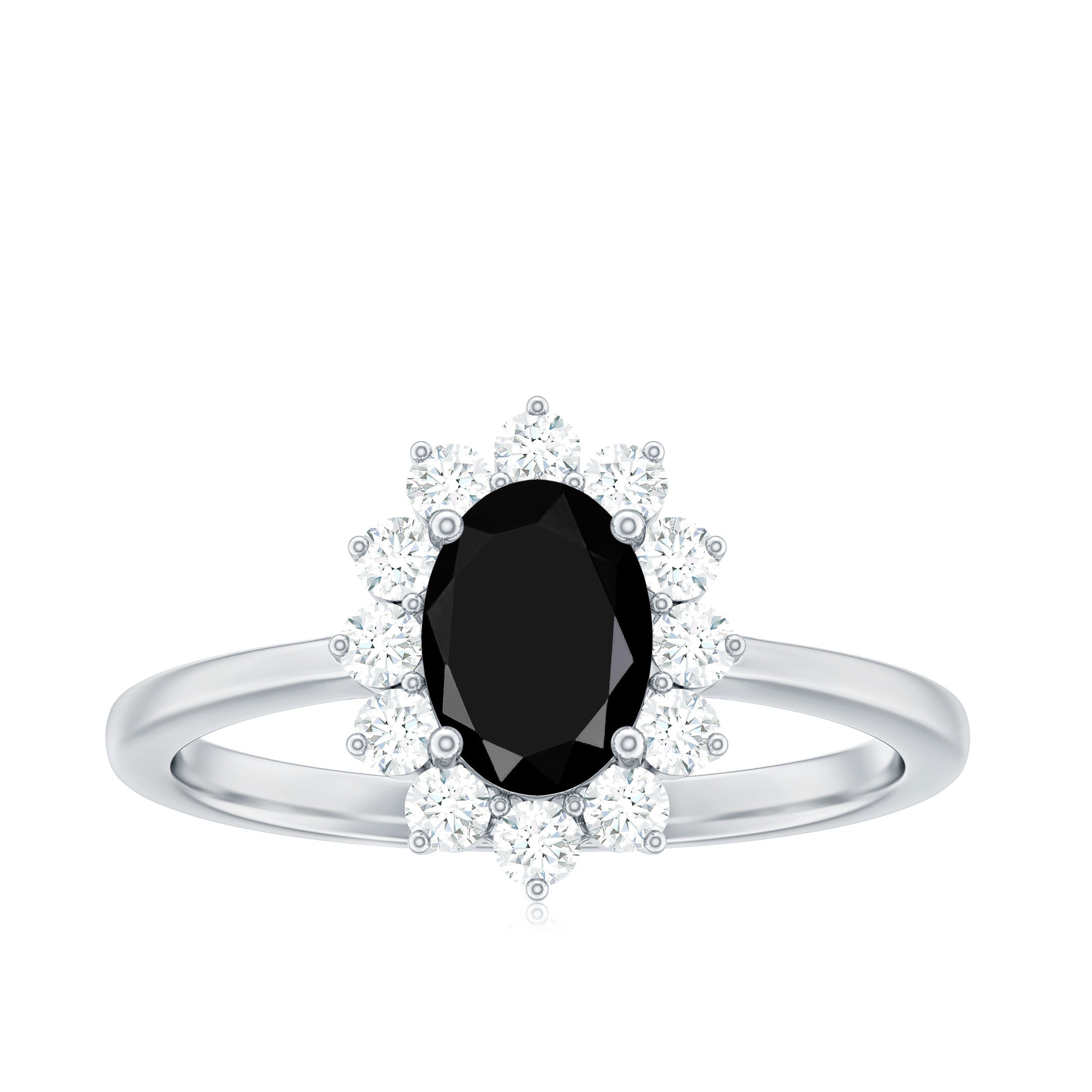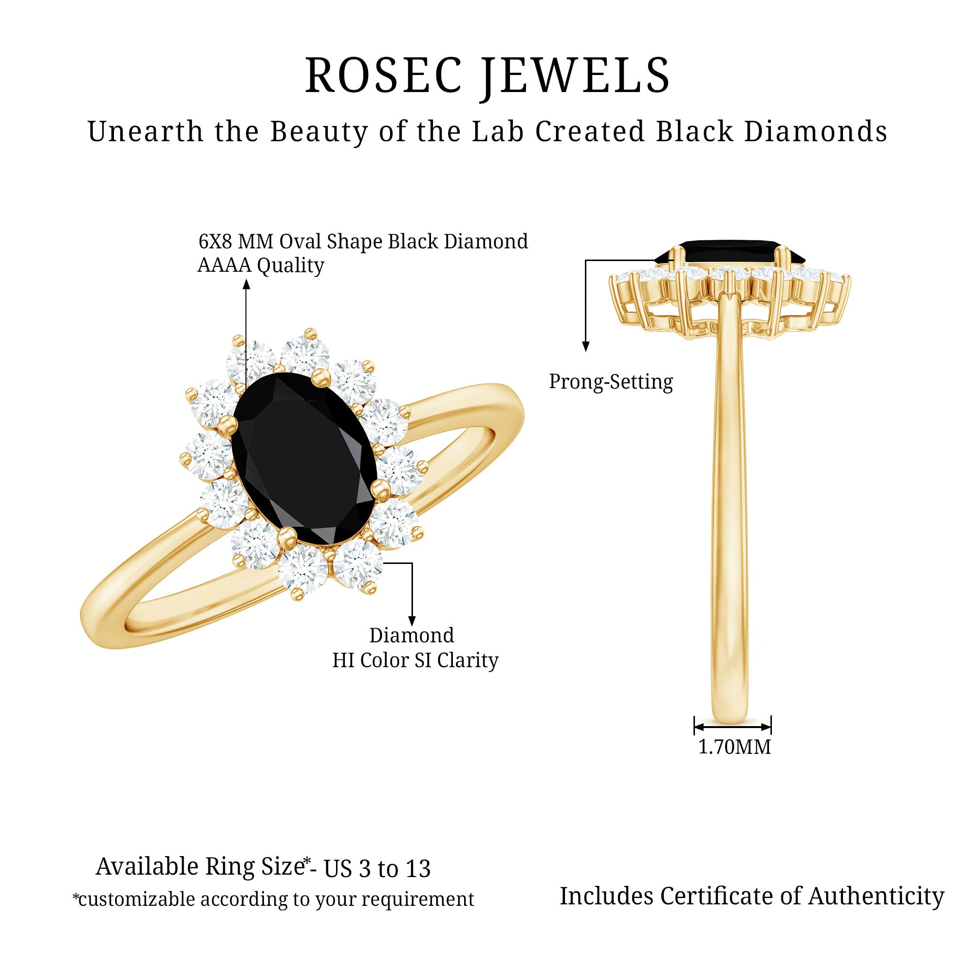 Propose to your beloved with the exquisite Created Black Diamond Ring and make her feel like a princess. This engagement ring is inspired by Princess Diana and features a 5X7 MM oval cut Created Black Diamond gemstone in a prong setting, surrounded by Diamond stones. With this Created Black Diamond ring, your love will always be with her, no matter where she goes. The total weight of the ring is 1.75 carat, and the gemstone has a AAAA clarity rating. Rest assured, all our gemstones are certified and go through a rigorous quality check process.