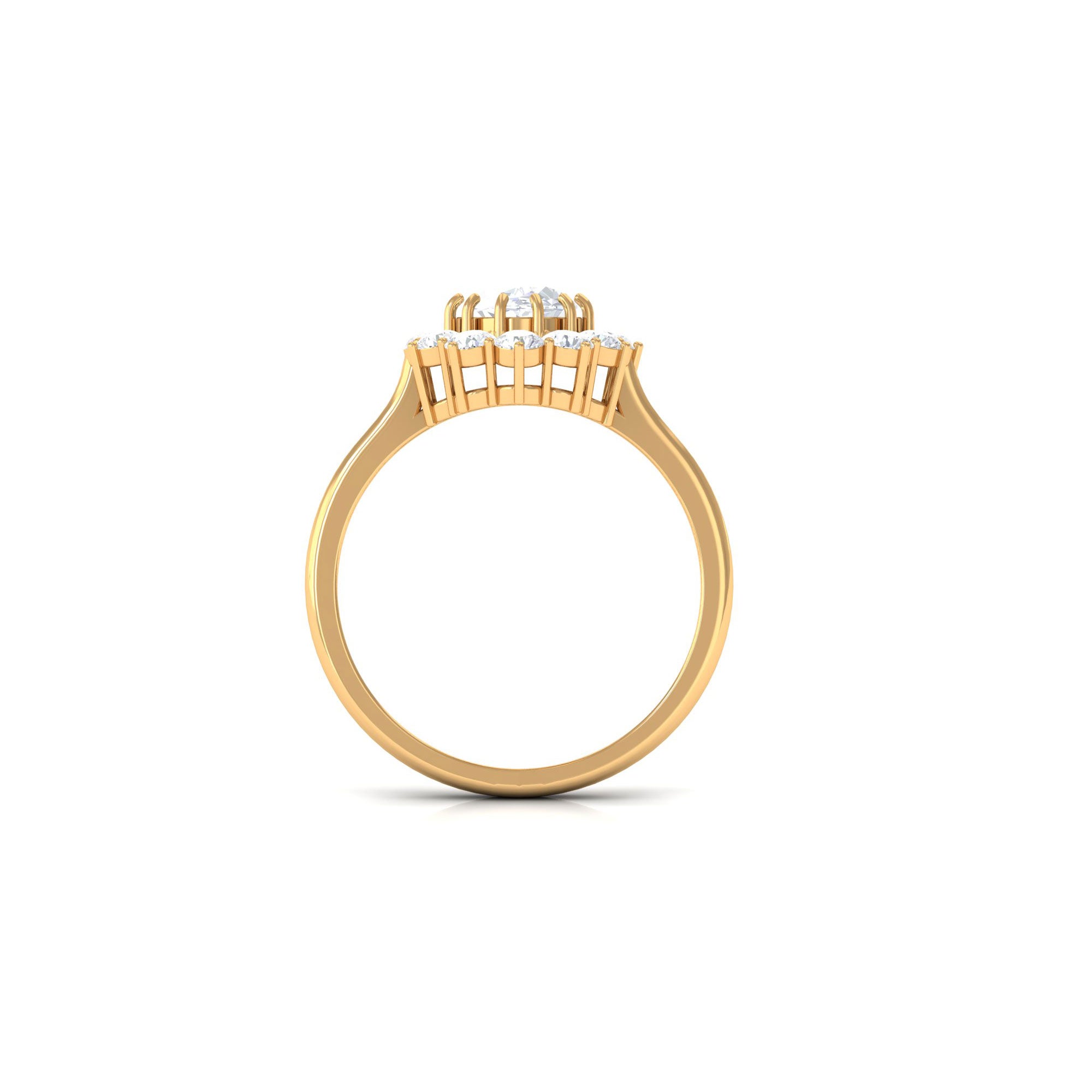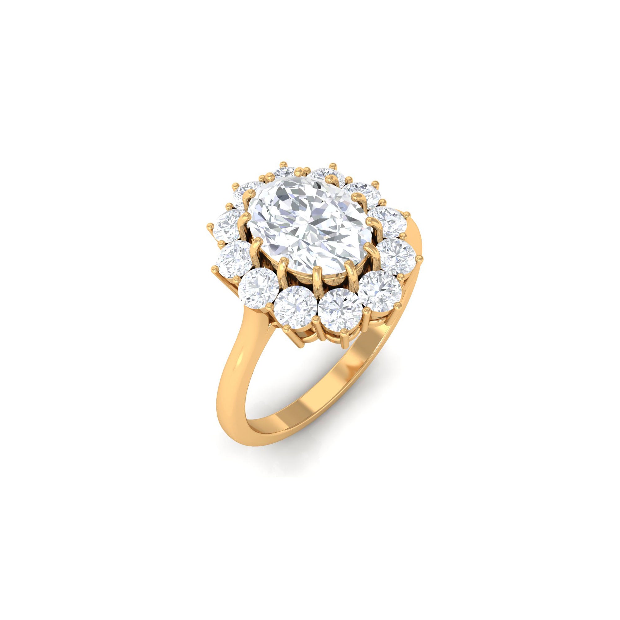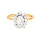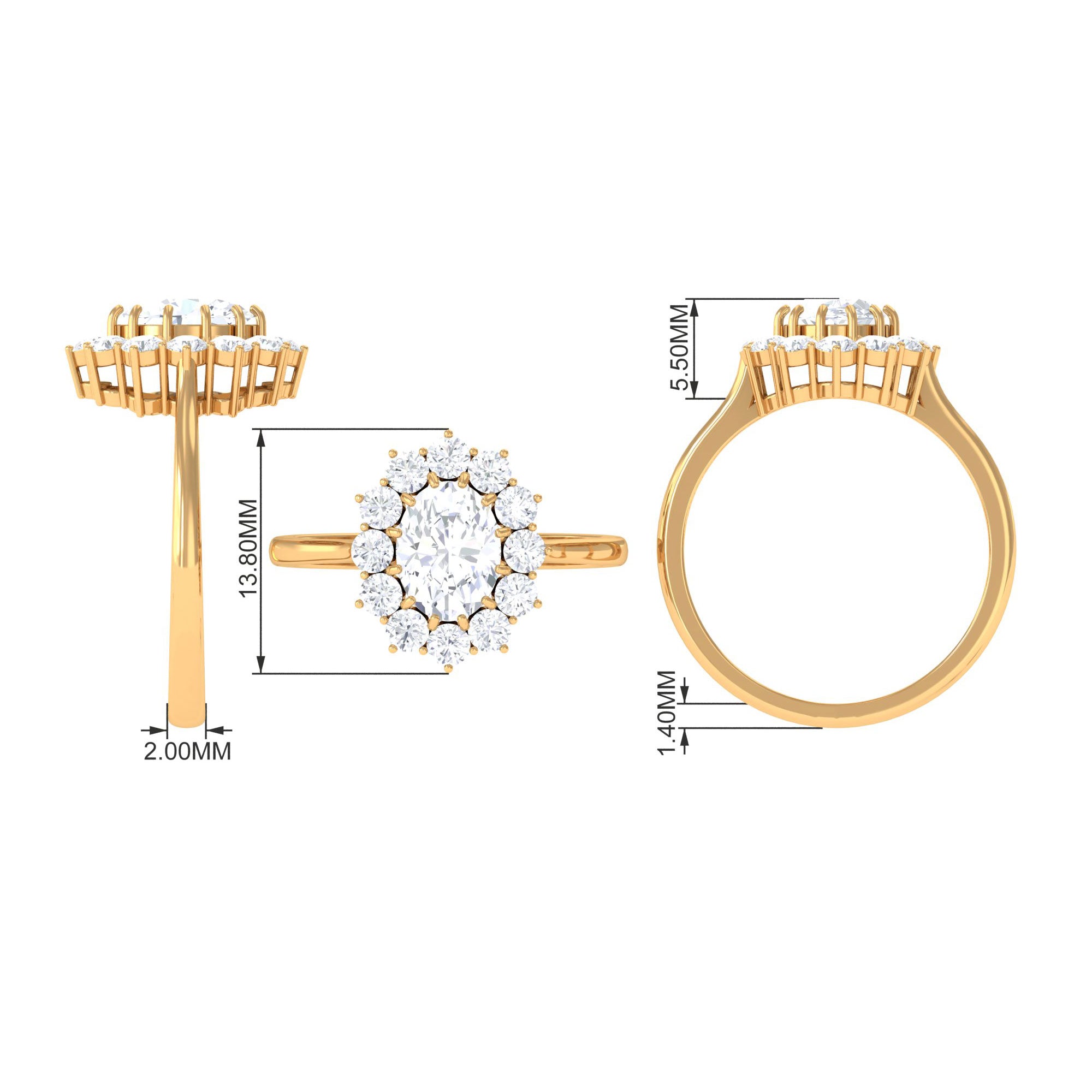 Crafted from solid gold, this stunning zircon engagement ring takes inspiration from Princess Diana and features an oval-cut zircon stone set in a prong setting. The stone is encircled by a halo of dainty round zircon, adding to the rings overall beauty and elegance.