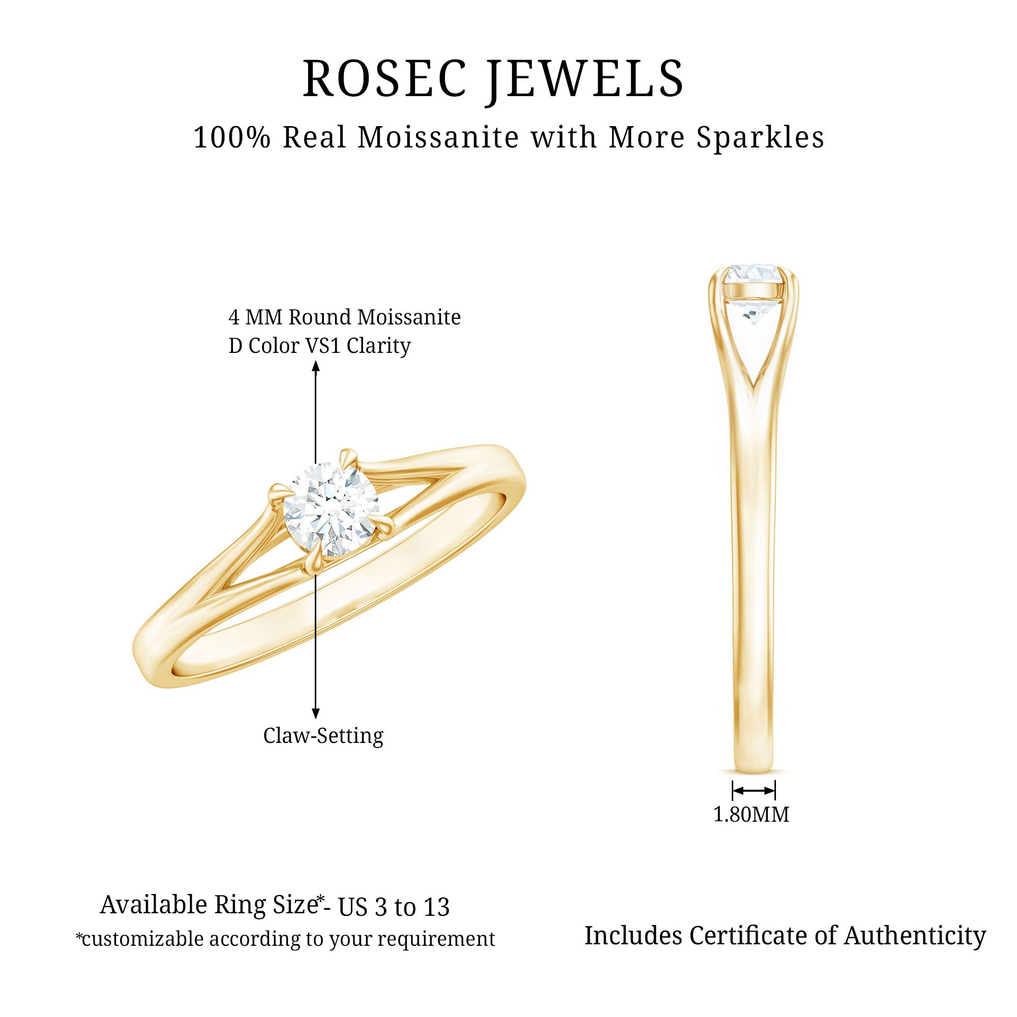 Celebrate your connection with the elegant charm of this Moissanite Promise Ring for Her, designed to express love, loyalty, and meaningful moments. At the center of this graceful ring is a 4 MM Round Shaped Moissanite, secured in claw setting, allowing light to pass through and maximize its brilliance. The sleek split shank band adds a modern touch while symbolizing two paths coming together as one. Crafted with simplicity and thoughtfulness in mind, this Solitaire Moissanite Ring is perfect for daily wear or as a heartfelt gift to mark a promise, anniversary, birthday, or personal milestone. Its understated design offers timeless beauty, making it a versatile piece that complements any style. With its timeless detailing and delicate shine, this Solitaire Promise Ring carries a quiet elegance that makes a lasting impression. Delivered in a charming gift box, it is ready to become part of your love story or a treasured reminder of a bond that grows stronger with time. Thoughtfully designed and crafted to endure, this Split Shank Ring is a celebration of a promise beautifully kept.