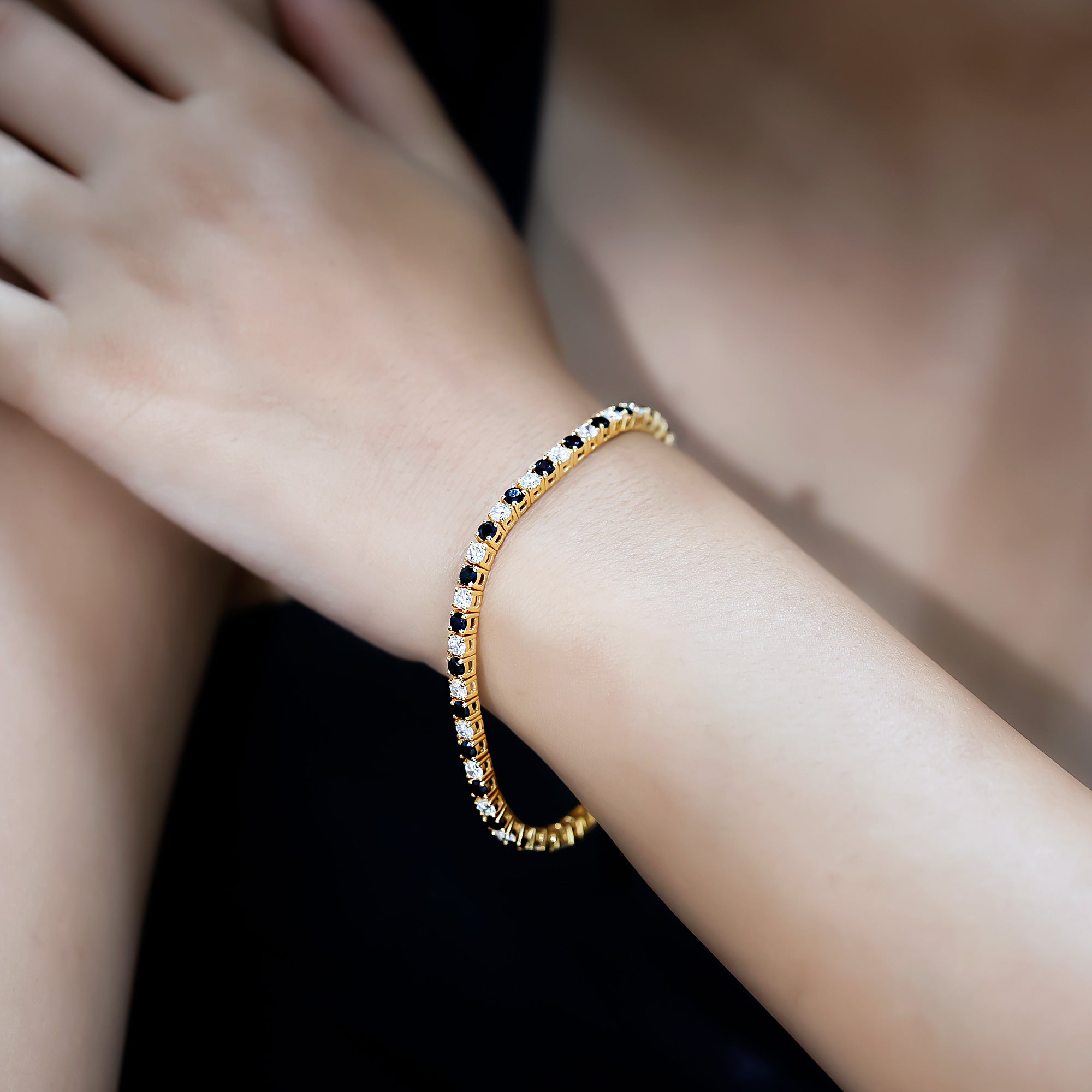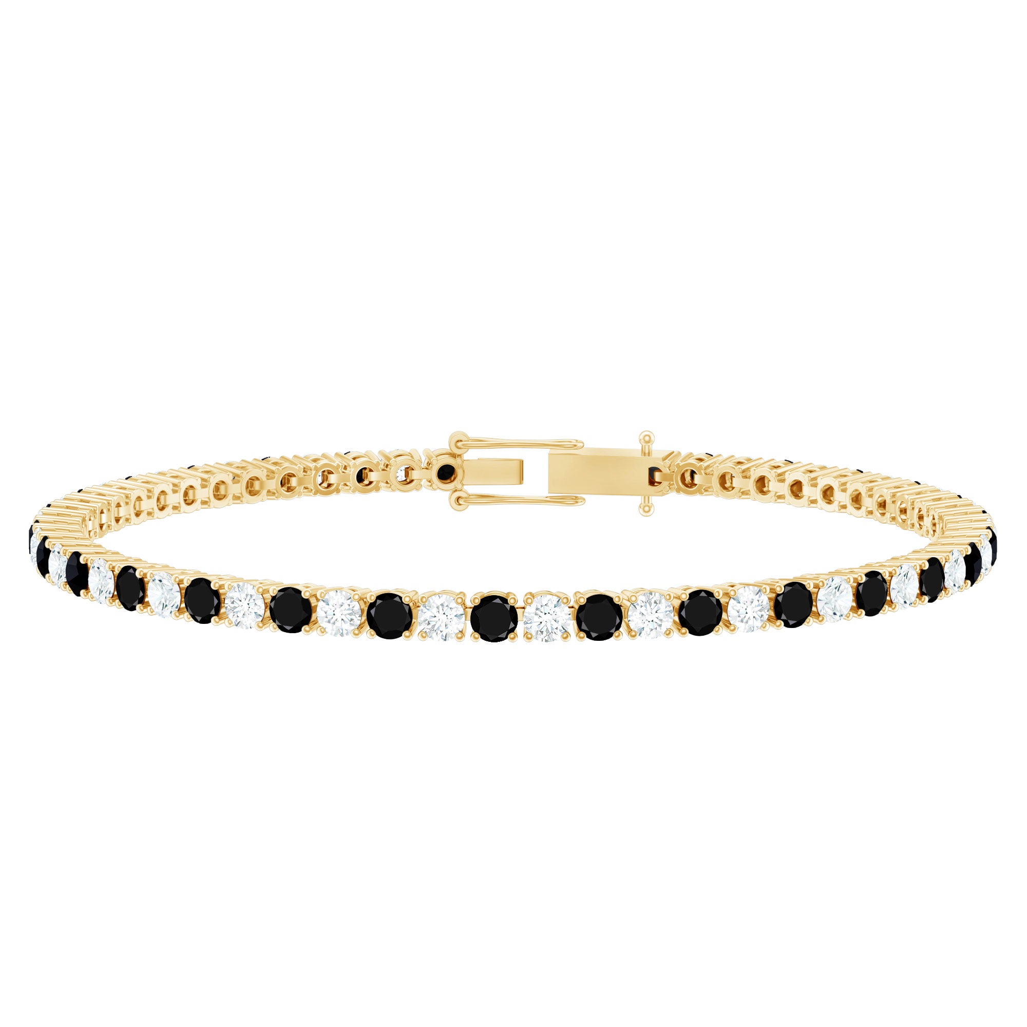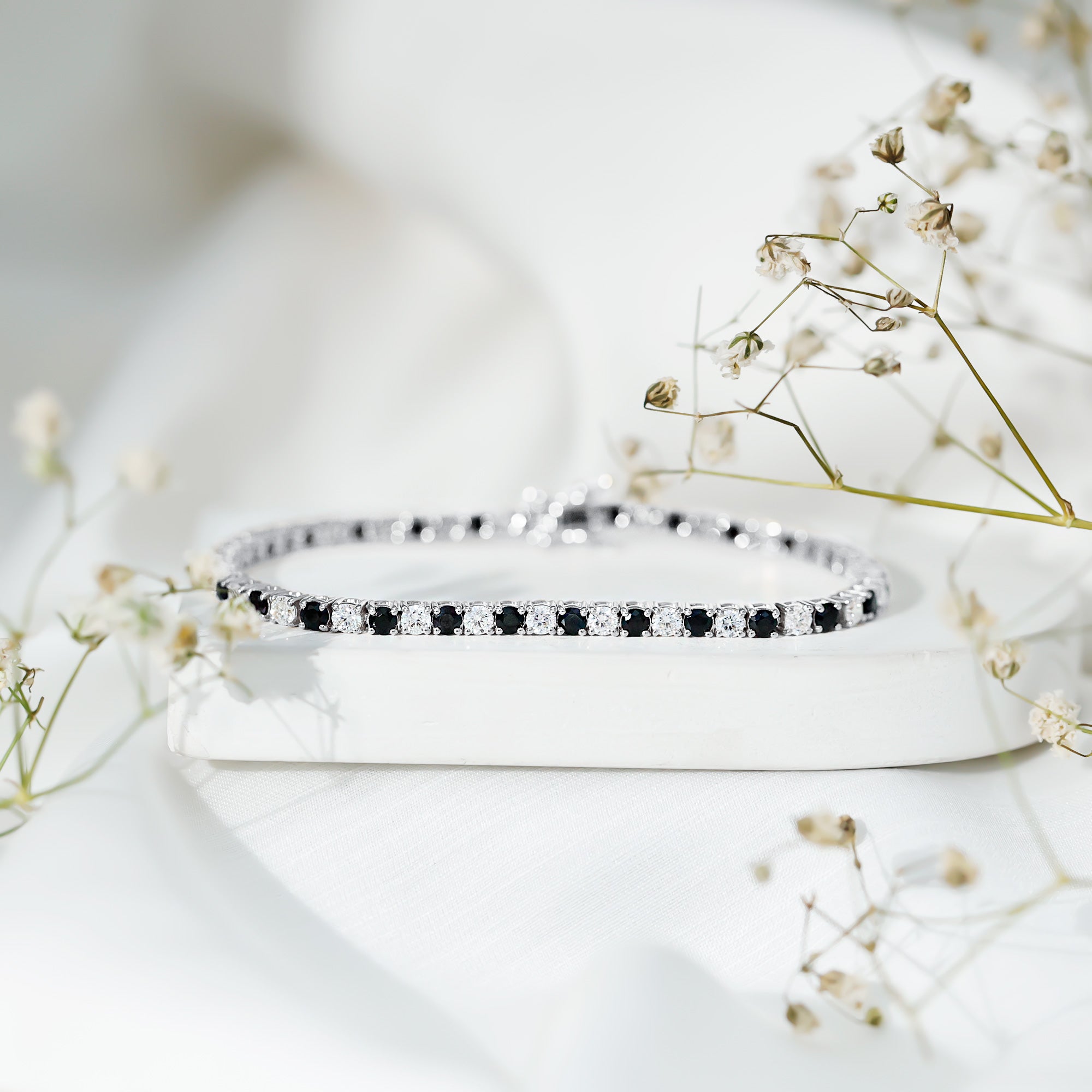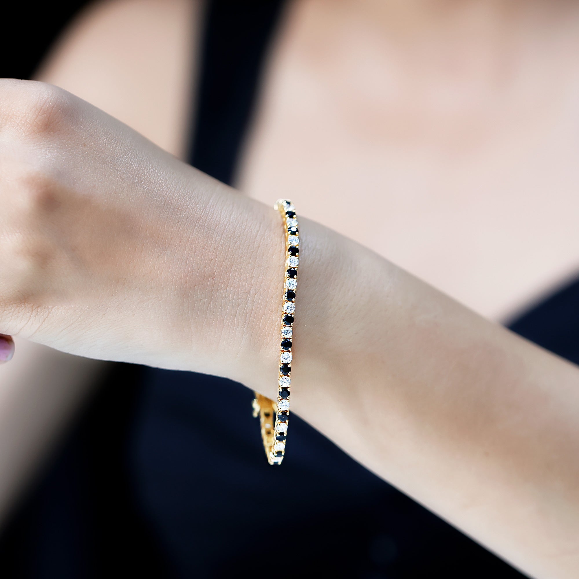 Add a touch of glitz and glamour with this Lab Grown Diamond Bracelet as an eye-catching choice that attracts ample of attention and admiration. As a lovely addition to the bridal outfits, this Lab Black and White Diamond Bracelet has timeless elegance with sophisticated design, which perfectly fits your style. The Round Shape Lab Grown Diamond and Lab Black Diamond in Prong Setting, sits in an eternity design style. Referring to the feminist choice and romantic appeal, this Lab Diamond Eternity Bracelet exemplifies the gorgeous appearance with the striking contrast of light and dark gemstones. As a perfect blend of boldness and sophistication, this bracelet is a versatile piece that elevates any jewelry collection. As a glamorous touch, this Eternity Tennis Bracelet has understated elegance and standout brilliance for a timeless look. Elevating the overall design, it is sure to draw attention, surrounded by a sleek line of Lab Black and White Diamond. The EF-VS Quality Lab Grown Diamond and AAAA Quality Lab Black Diamond combines the striking allure, offering a stunning take on the classic Tennis Bracelet.