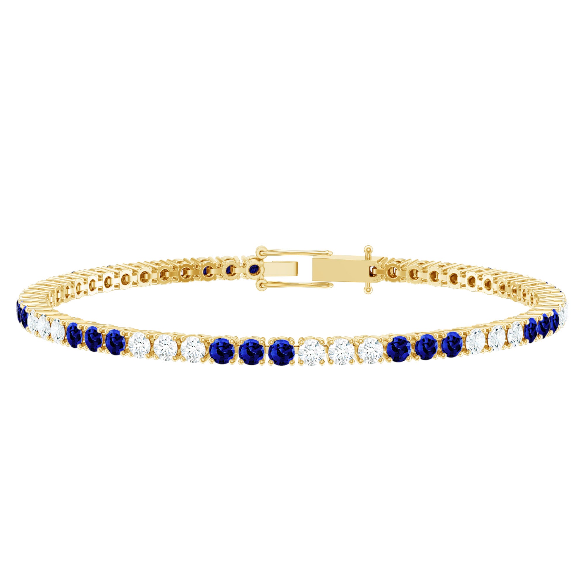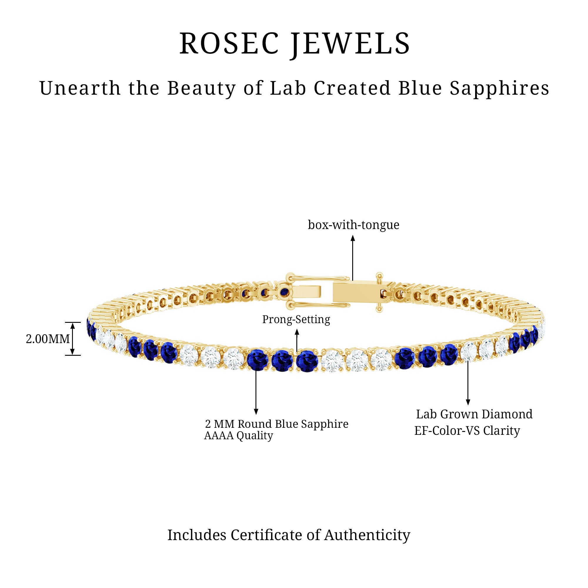This Lab Grown Diamond Bracelet is a luxurious and charming accessory to adorn your wrist. Indicating love and commitment, this Bracelet is beautifully adorned with Round Shape Lab Grown Diamond and Lab Blue Sapphire in Prong Setting, giving a subtle appearance. Celebrate the enduring beauty with the stunning Bracelet as a symbol of timeless glamor, and is also a classic addition to the jewelry collection. Encapsulating affection and elegance, this Lab Diamond Sapphire Bracelet is a tangible symbol of continuous and everlasting affection. Offering brilliance and a vogue appearance, this Lab Diamond Stackable Bracelet displays a parallel look. Designed to elevate outfits, this bracelet is perfect for everyday styling, giving an eye-catching sparkle. The EF-VS Quality Lab Grown Diamond and AAAA Quality Lab Blue Sapphire have an understated and classic accessory, which is an exceptionally versatile piece of jewelry for your collection. Either style it as a minimalist or as a bold statement piece, this bracelet is sure to draw attention.