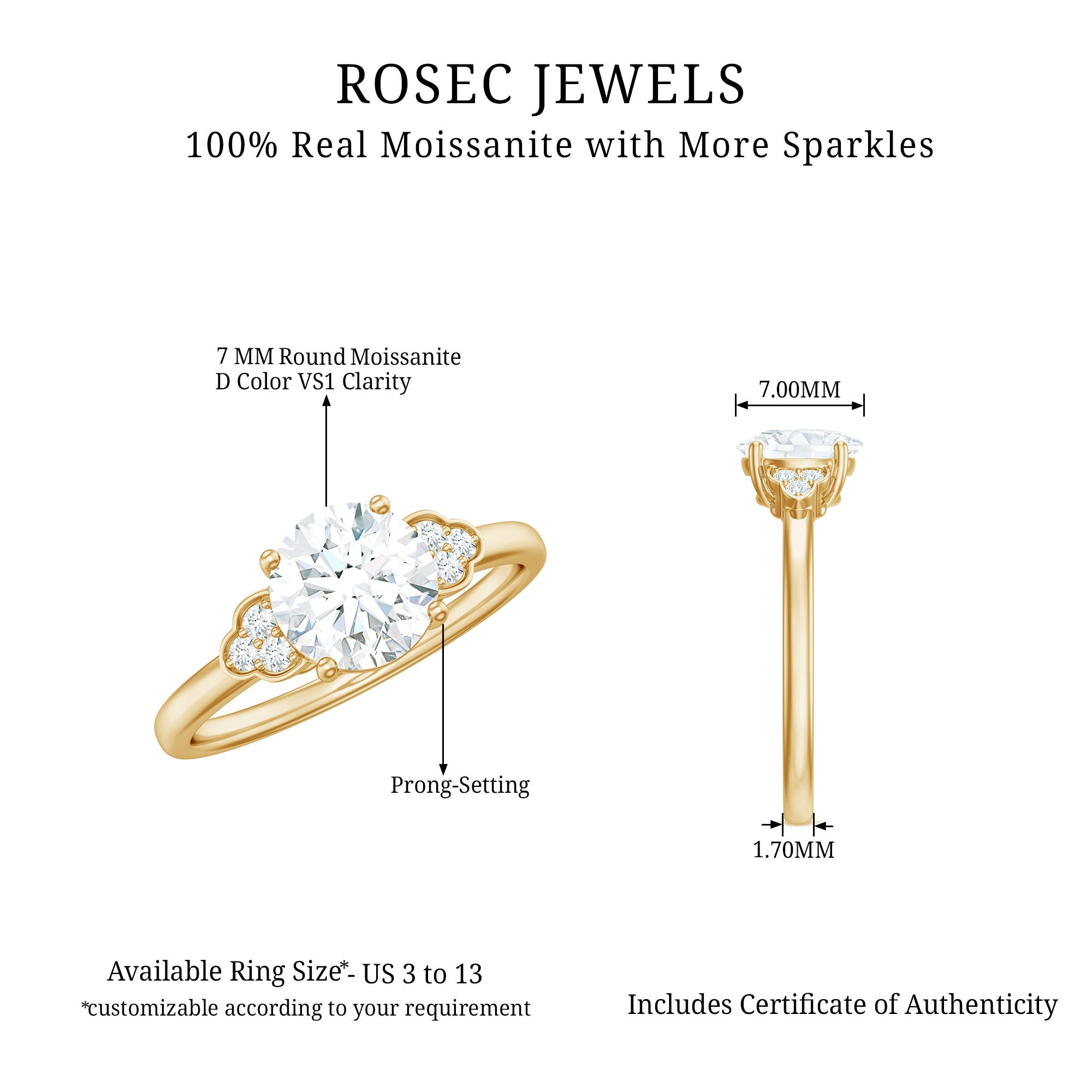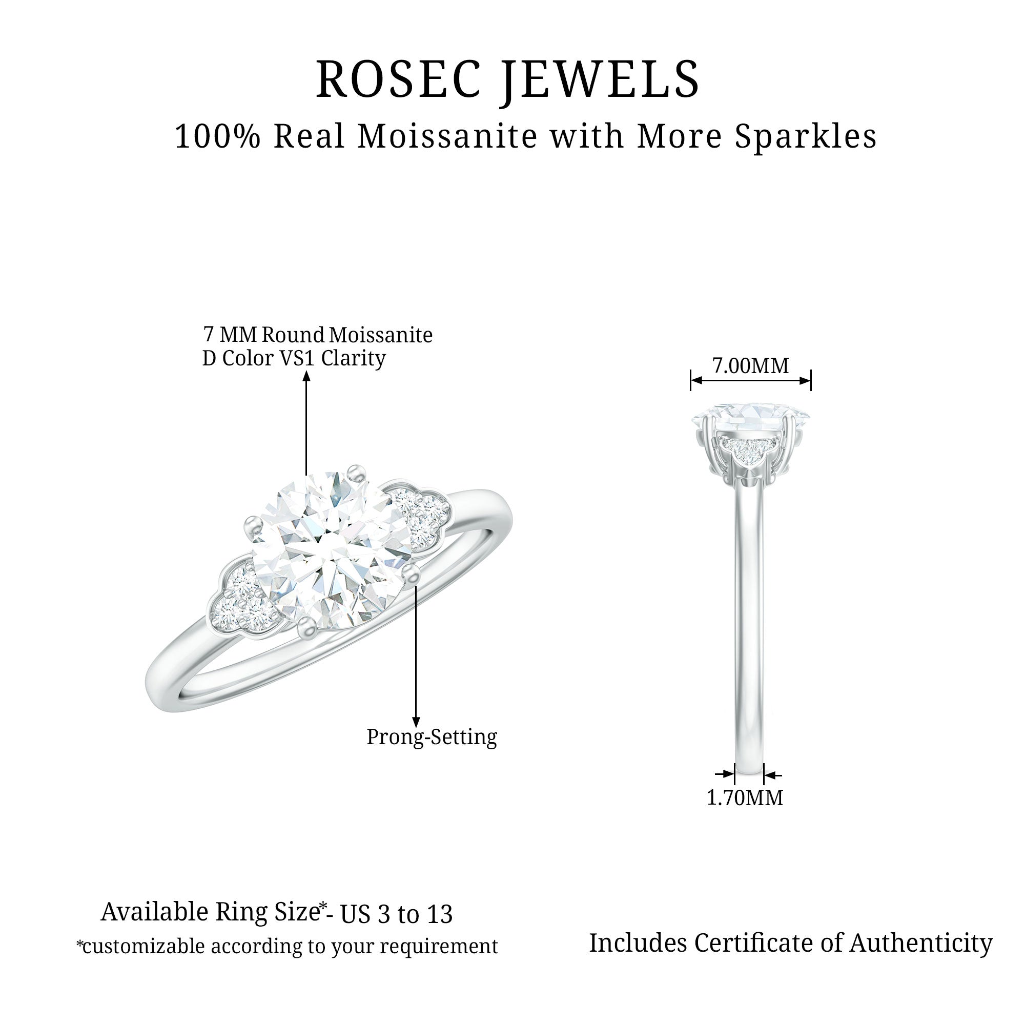Graceful and full of charm, this Moissanite Engagement Ring brings timeless elegance to life with a modern, radiant twist. At the center, a brilliant 7 MM round shaped moissanite takes the spotlight, securely held in classic prong setting. With D-VS1 quality, this sparkling gem reflects light beautifully, symbolizing pure and lasting love. Adding extra brilliance, three small moissanite stones are delicately set on each side of the center stone, creating a balanced and eye-catching design. These tiny accents enhance the ring’s overall shine without overpowering its simplicity. Every stone in this Moissanite Solitaire Ring is thoughtfully placed, it is an ethical and budget-friendly alternative to traditional diamonds without sacrificing brilliance. The smooth band is designed for everyday comfort, while the trio adds a soft, sophisticated touch. Beautifully presented in a stylish jewelry box, this 1 Carat Moissanite Ring becomes more than just a piece of jewelry it is a symbol of love, promise, and shared memories. Whether marking the beginning of your journey or celebrating your bond, this elegant Round Engagement Ring is made to shine every day, just like your love.